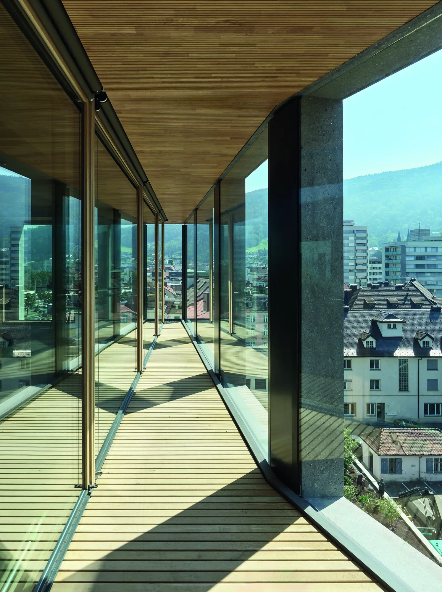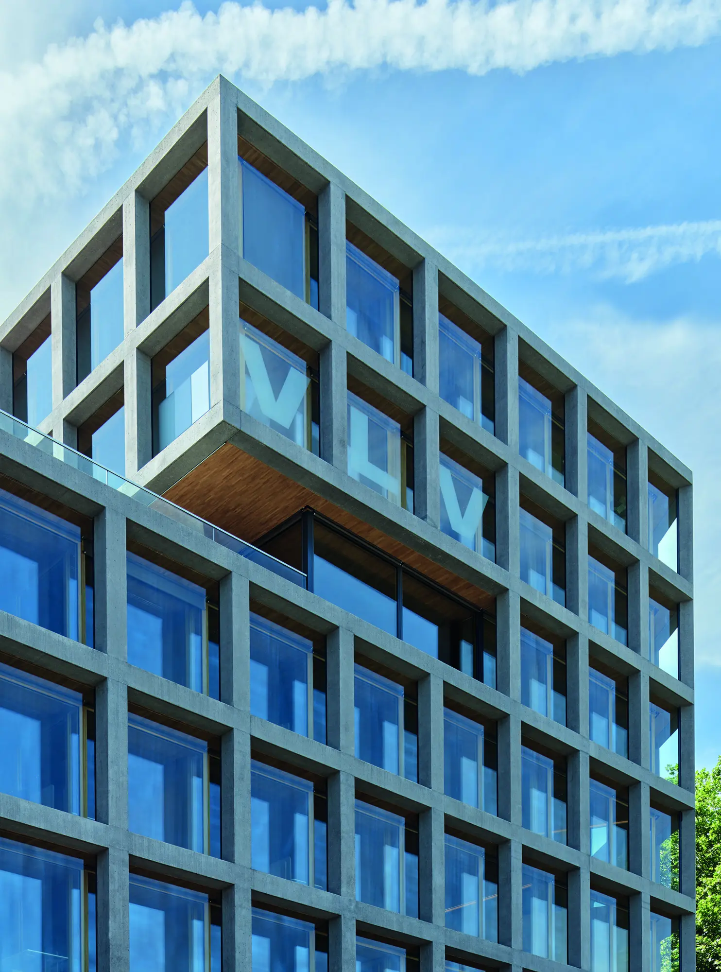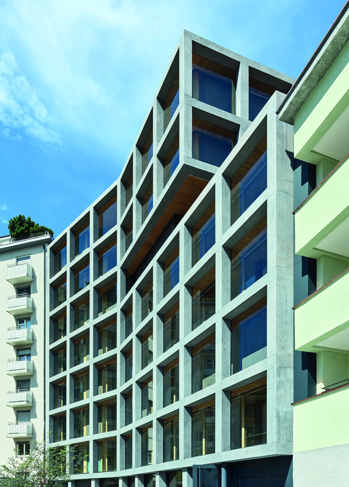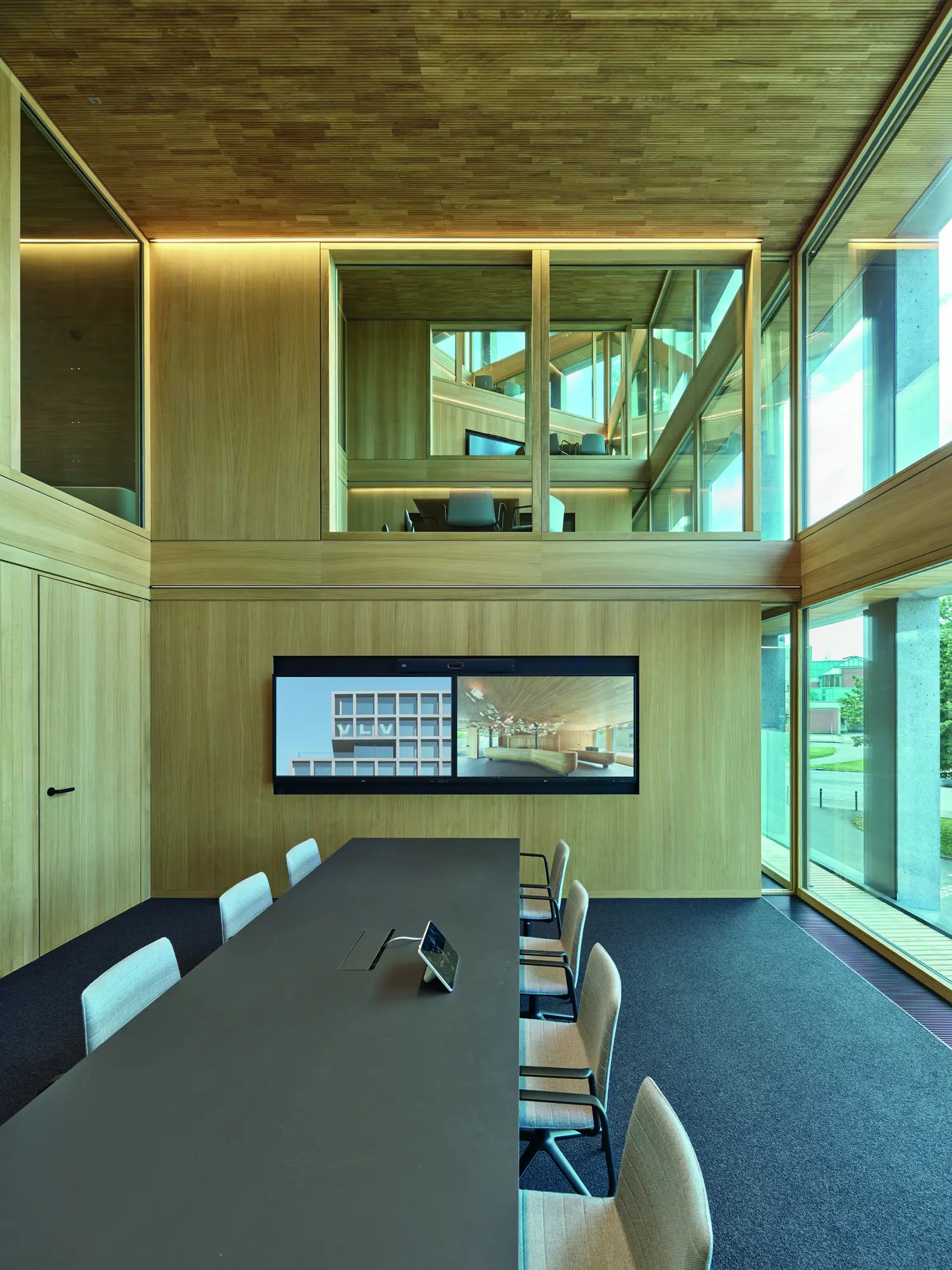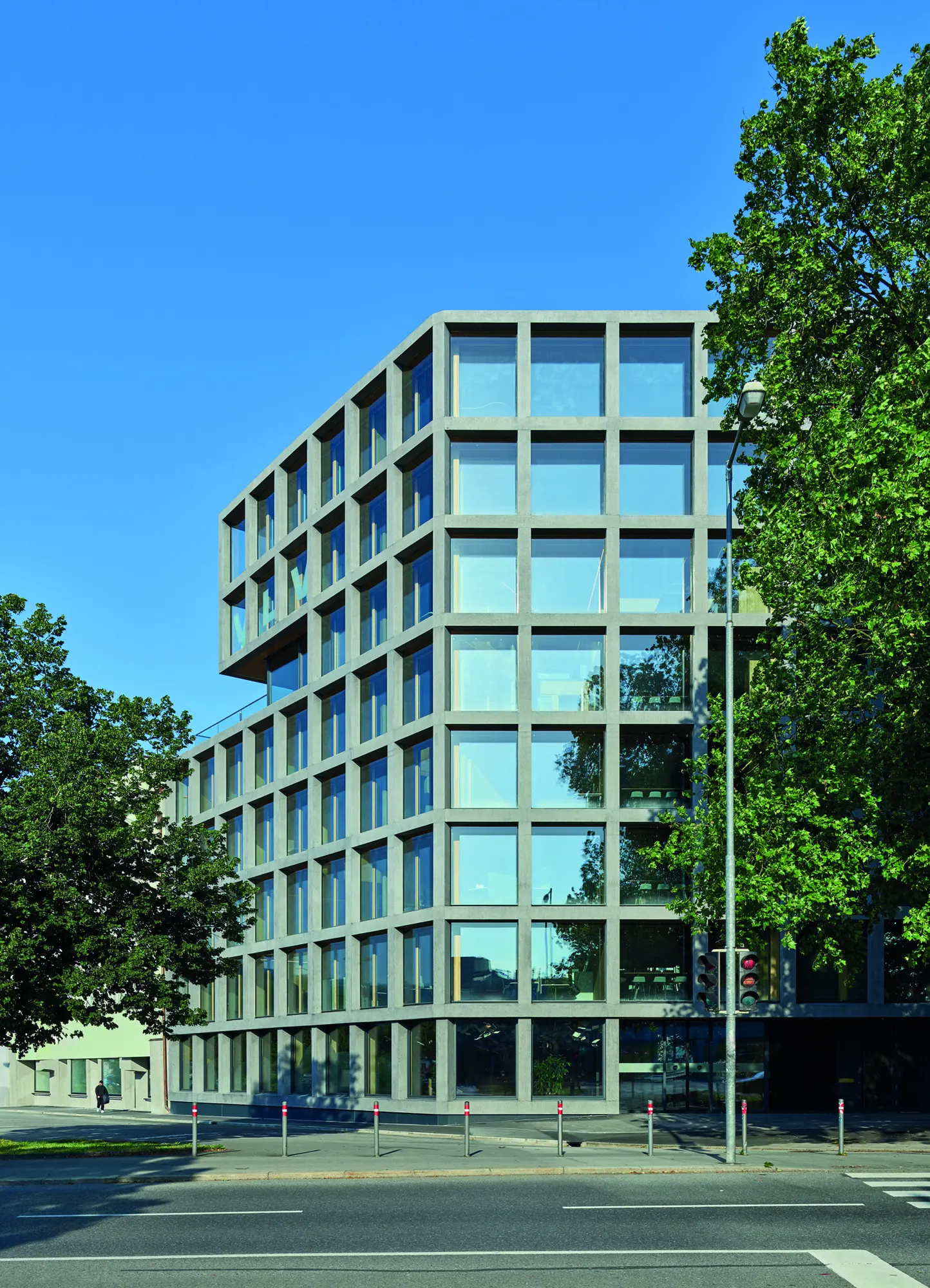 Von einem Vorplatz öffnet sich der Haupteingang, der unmittelbar in ein zum durchgrünten Innenhof offenen Foyer führt. Von hier aus breitetet sich je Geschoss ein offener Raum aus. Dem klar strukturierten nach außen gerichteten Grid aus schwarzem Sichtbeton folgt in selber Geometrie eine Prallglasfassade, die Leichtigkeit und Distanz zur Außenhaut ermöglicht. Der 80cm breite Fassadenzwischenraum sorgt für angenehme Konvektion, simple Konstruktion und Teilbeschattung der dahinterliegenden Räume.
