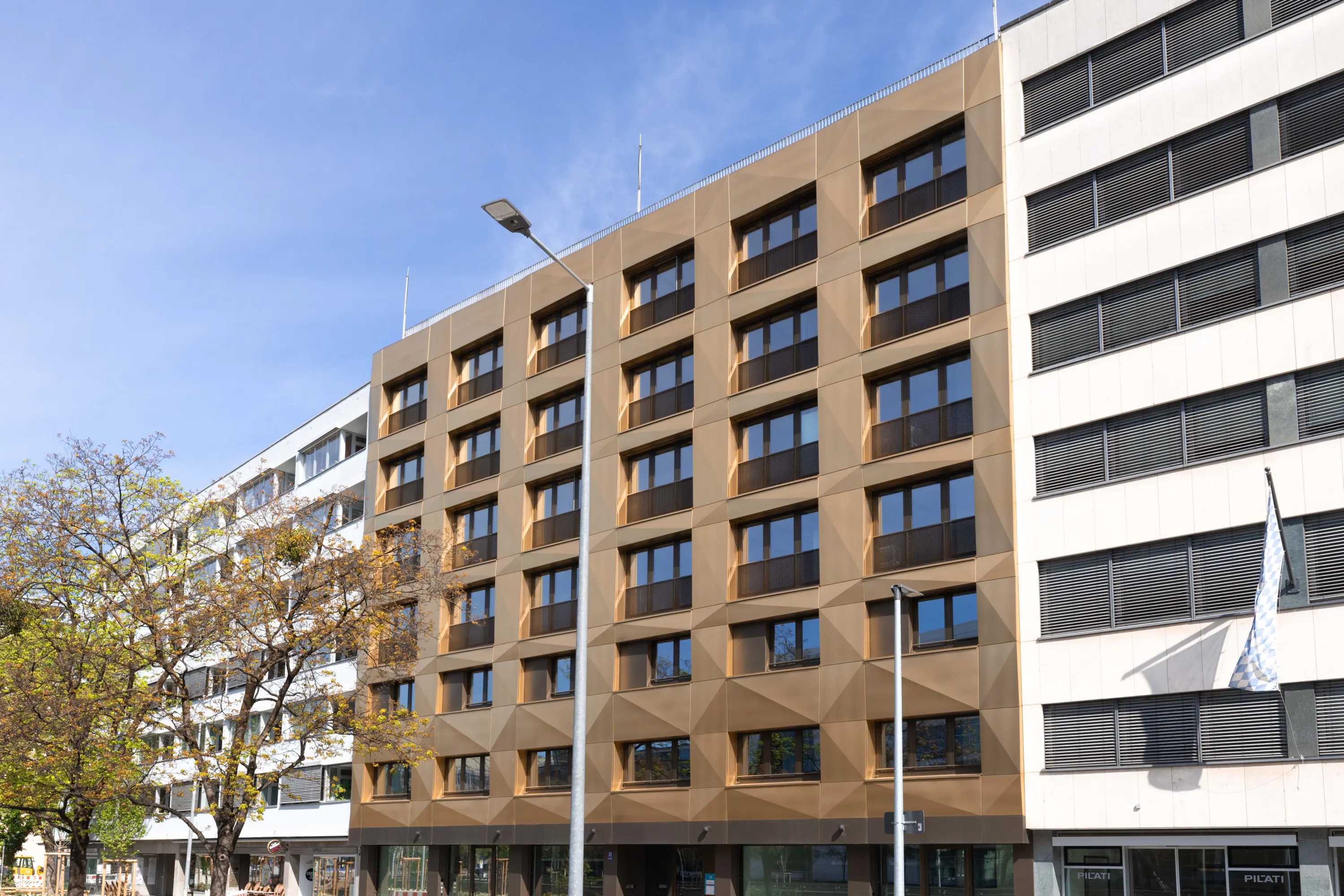 Es ist nicht alles Gold was glänzt. Und doch manchmal im wahrsten Sinn des Wortes Gold wert. Für unser Gebäude Oskar-von -Miller-Ring 33 in München gilt das auf beeindruckende Weise. Hinter dem goldglänzenden, wärmeisolierenden Fassadenkonzept befinden sich sieben Etagen mit modernsten Büroflächen nach dem New-Work Konzept. Die gelungene Transformation von der grauen Maus zum goldenen Schwan zeichnet dieses revitalisierte Gebäude aus.