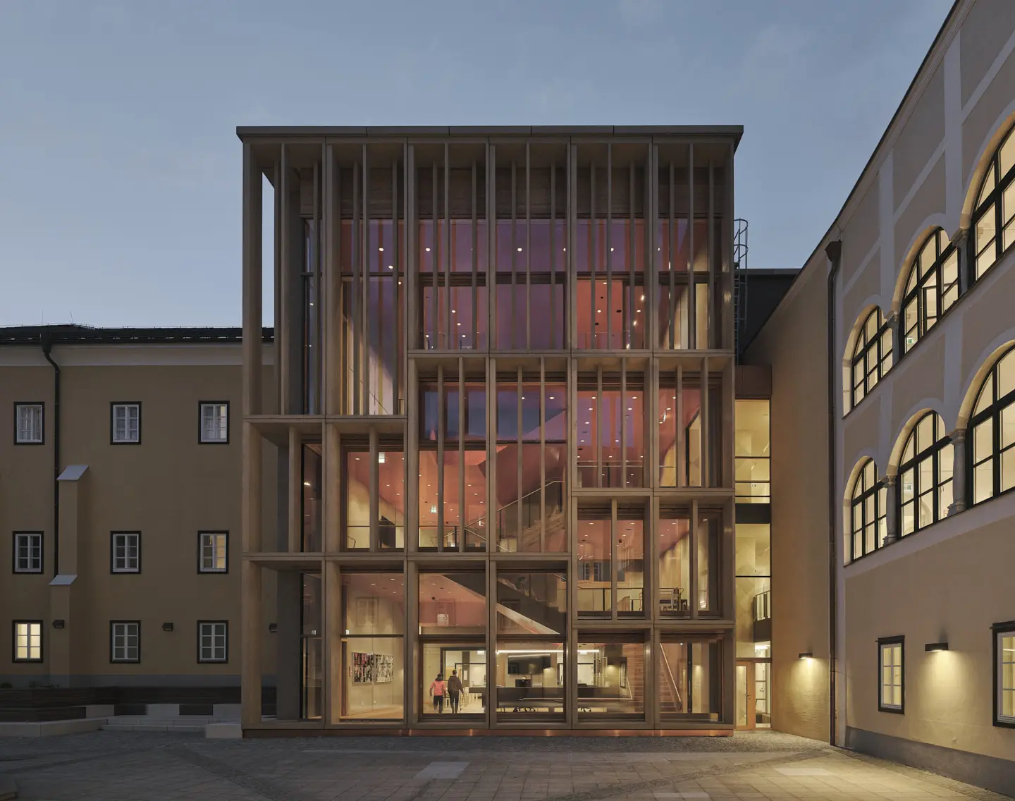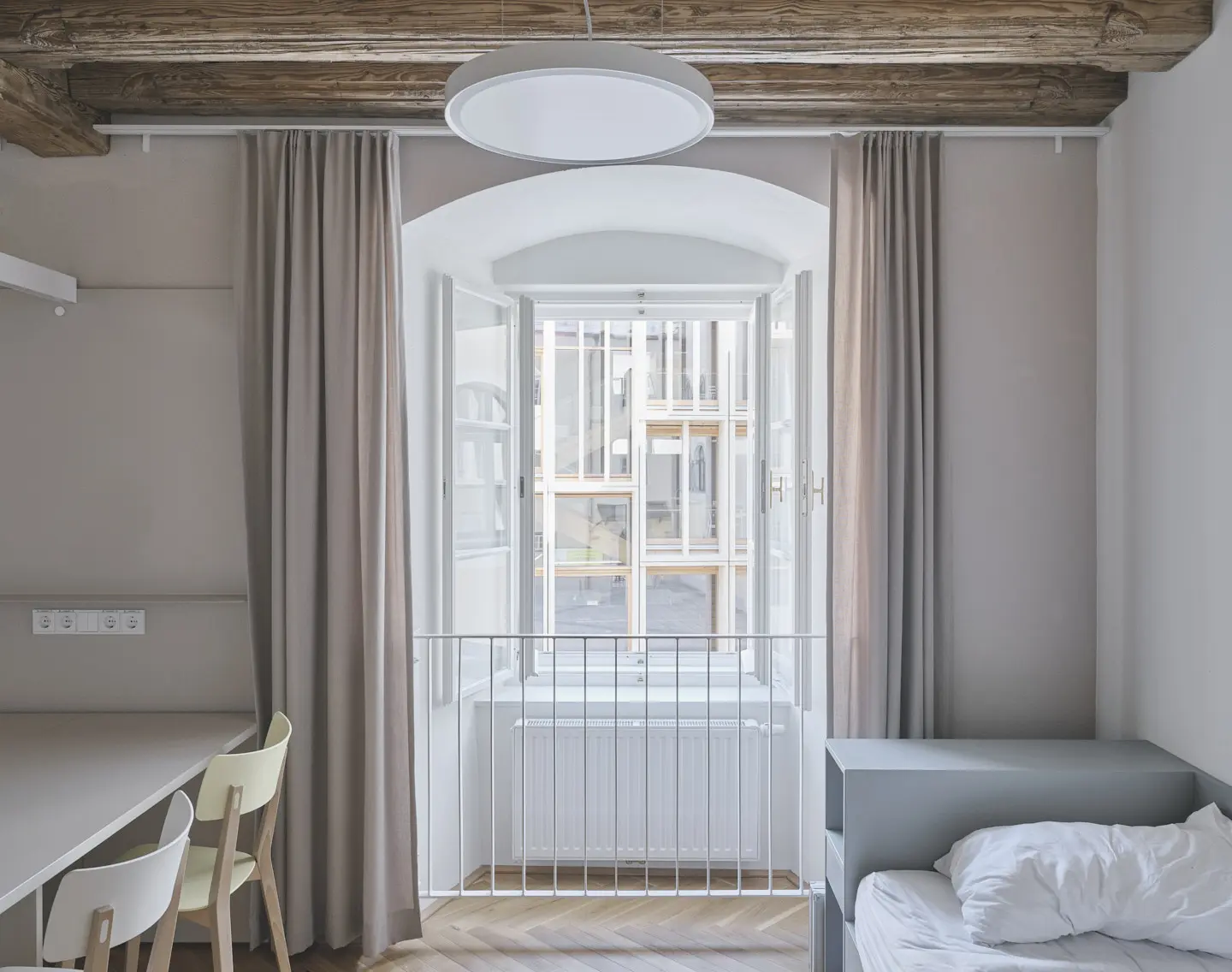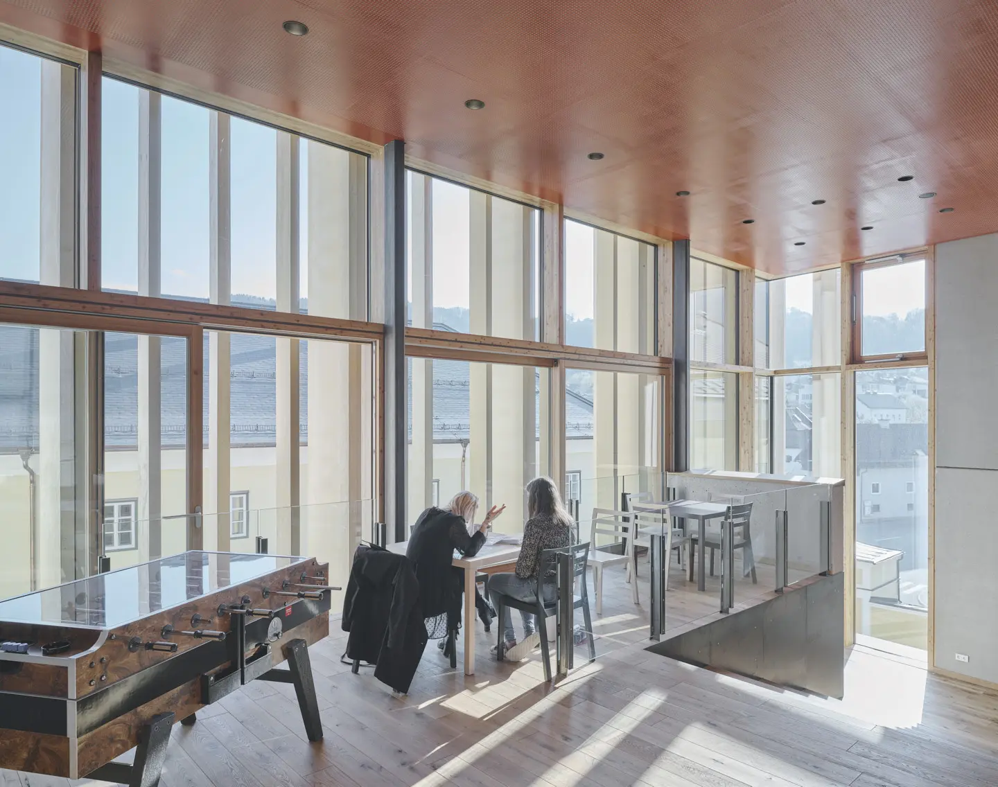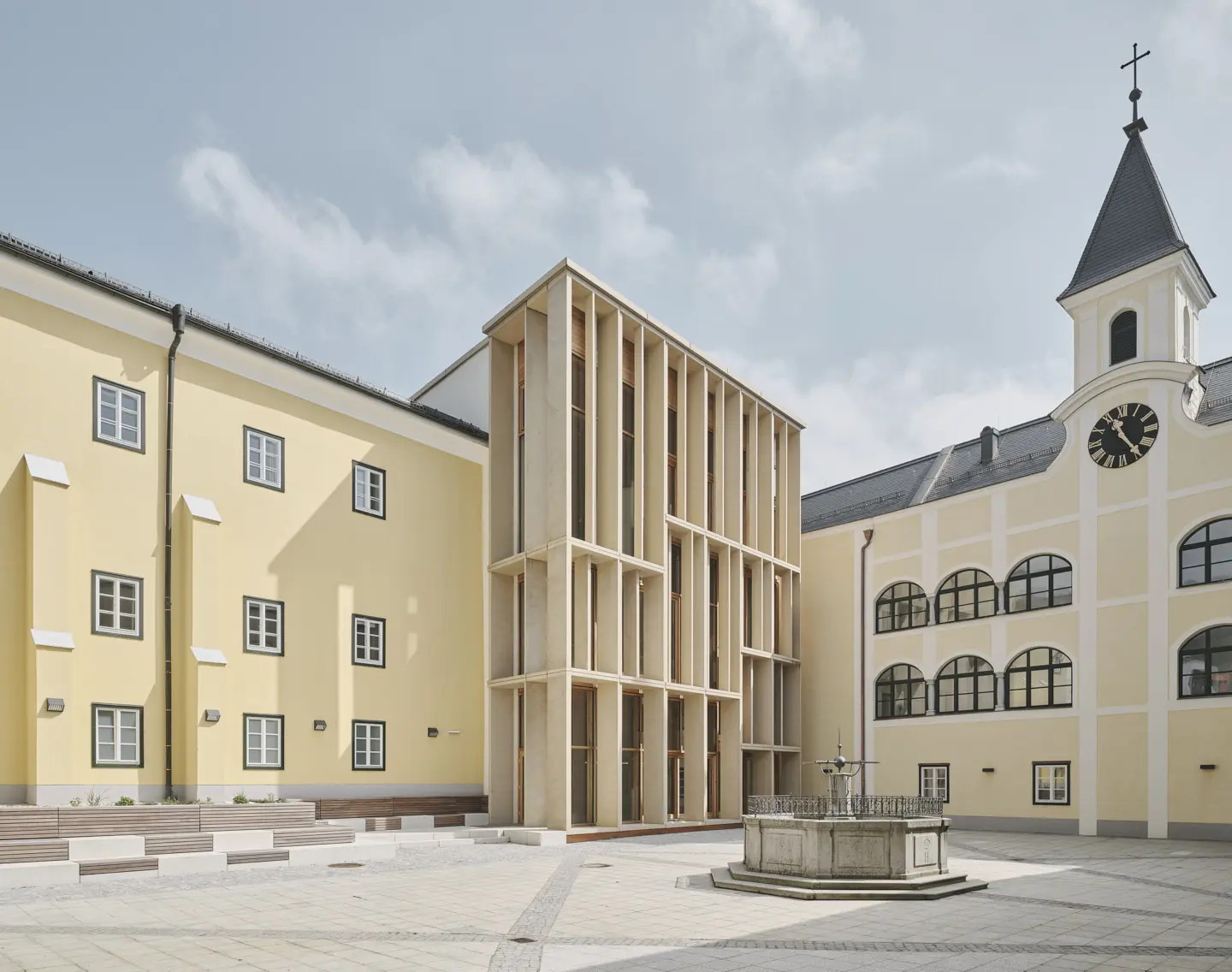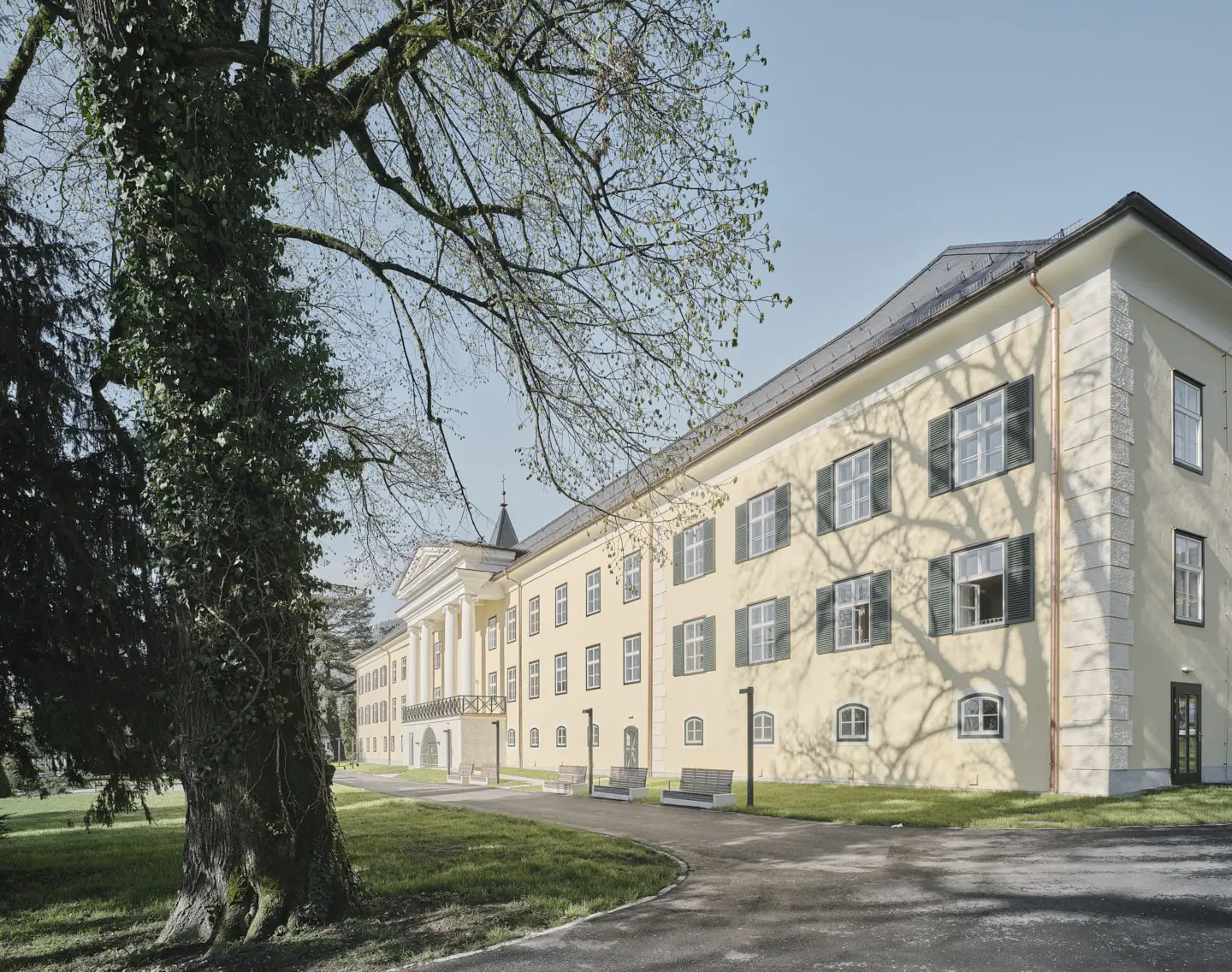Nach einem verheerenden Brand wurde das Schloss Ebenzweier im Zuge einer umfassenden Revitalisierung wiederhergestellt und das hier situierte Berufsschulinternat um einen zentralen ‚Wohnturm‘ ergänzt. Das Äußere des Schlosses wurde in den Originalzustand versetzt, Internatsräumlichkeiten für insgesamt 240 Schüler:innen kompakt im Bestand untergebracht. Zentralraum des Ensembles ist der neu errichtete Wohnturm. Er nimmt die vielen unterschiedlichen Niveaus des Bestandsbaus auf und verknüpft diese zu einer dreidimensionalen Wohnlandschaft mit Galerien, Tribünen, Balkonen, Kuschelecken und Spielflächen.
