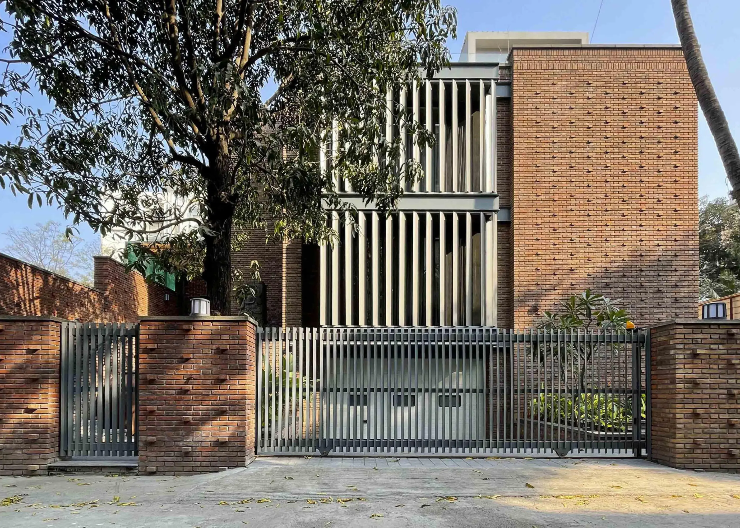 Im Zentrum des Hauses steht der Angan als heiliger Hof – ein Raum, der Kindheit, Feste und Ruhe vereint. Das Projekt verbindet die Tradition der Wadas mit modernen Bedürfnissen und überträgt deren Idee von Gemeinschaft und Offenheit in die Architektur. Zwei Baukörper umschließen den Innenhof, der Privatsphäre bietet und zugleich Transparenz und Multifunktionalität schafft. Materialien wie Ziegel, Holz und Metall spiegeln die warme Sprache traditioneller Bauten wider, ergänzt durch Grünflächen. Die Fassade interpretiert das Jharokha neu: minimalistische Metalllamellen, die Licht, Luft und Verbundenheit fördern.