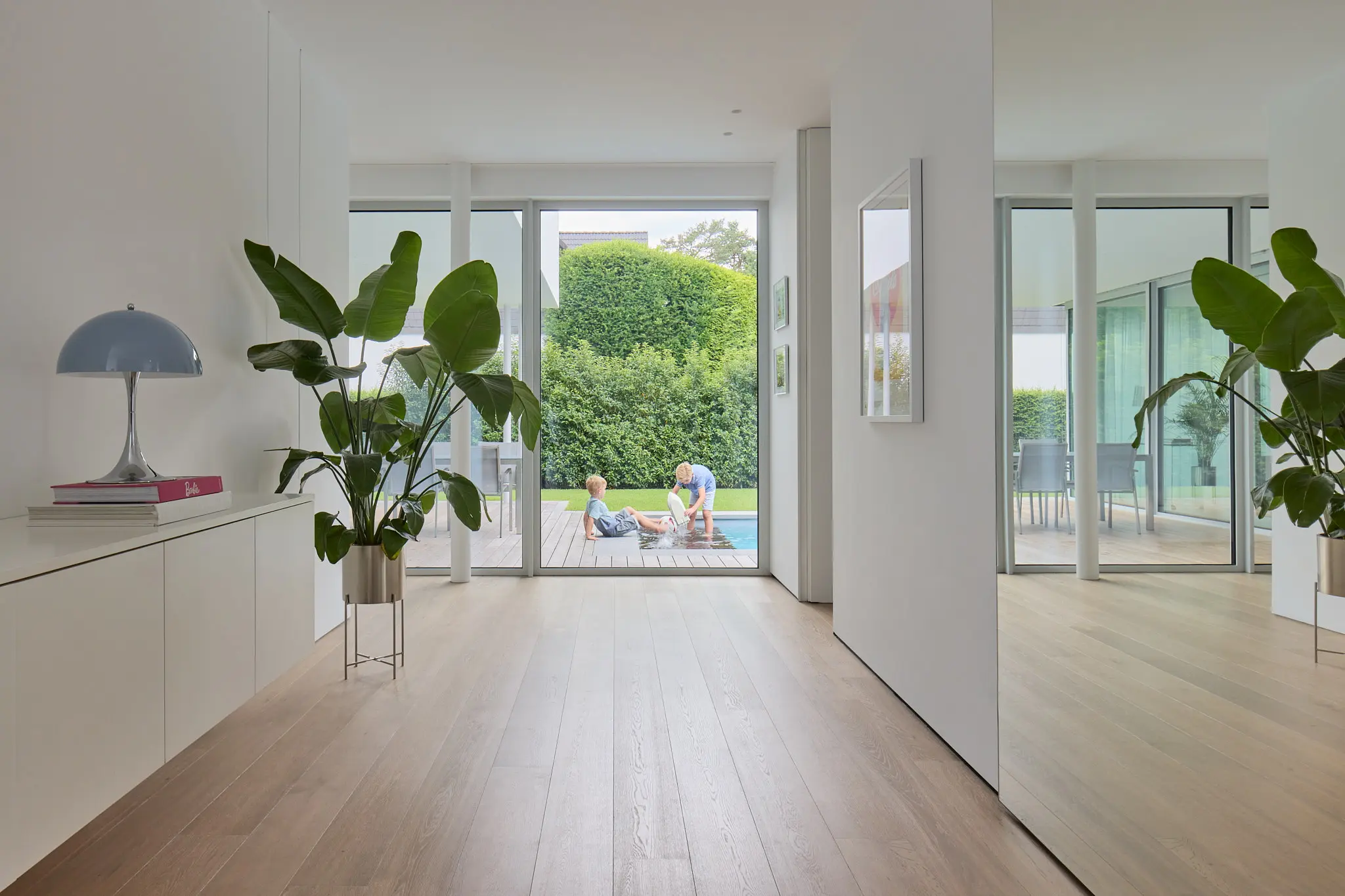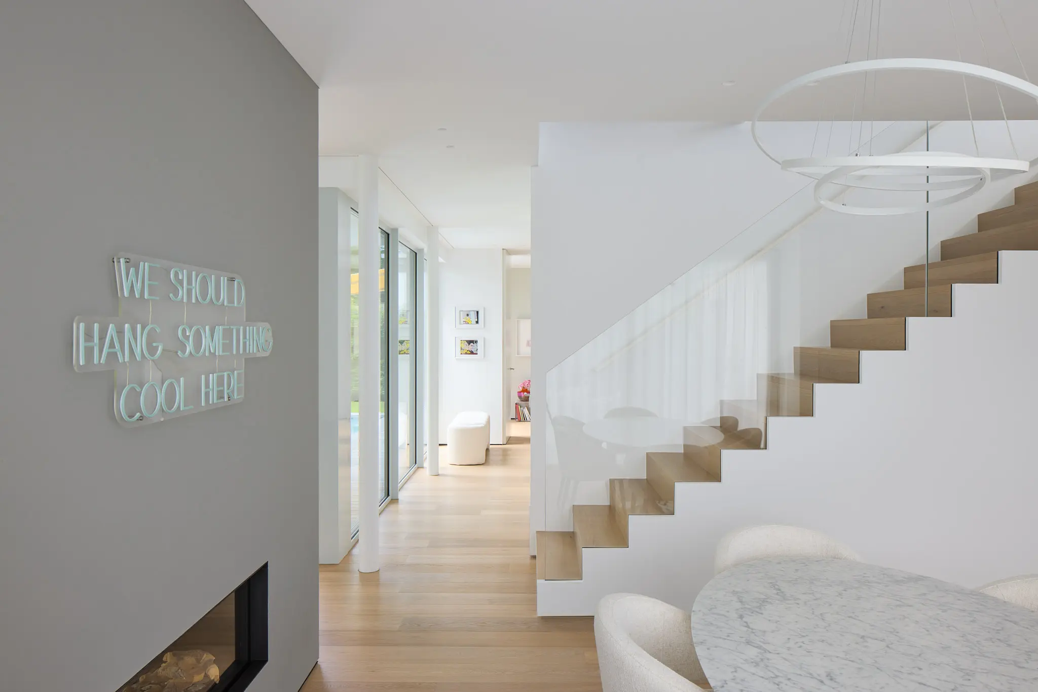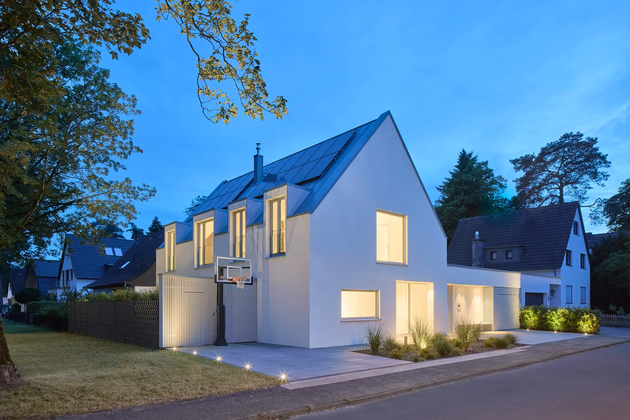 Die Planung des Hauses stand vor zwei zentralen Herausforderungen: einer gewachsenen, historischen Umgebung und einer strengen Gestaltungssatzung. Aus den intensiven Gesprächen mit den Bauherren und den baurechtlichen Rahmenbedingungen entstand ein klares gestalterisches Konzept – die Verschneidung zweier Baukörper: eines funktionalen Riegels und eines klar strukturierten Wohnhauses.