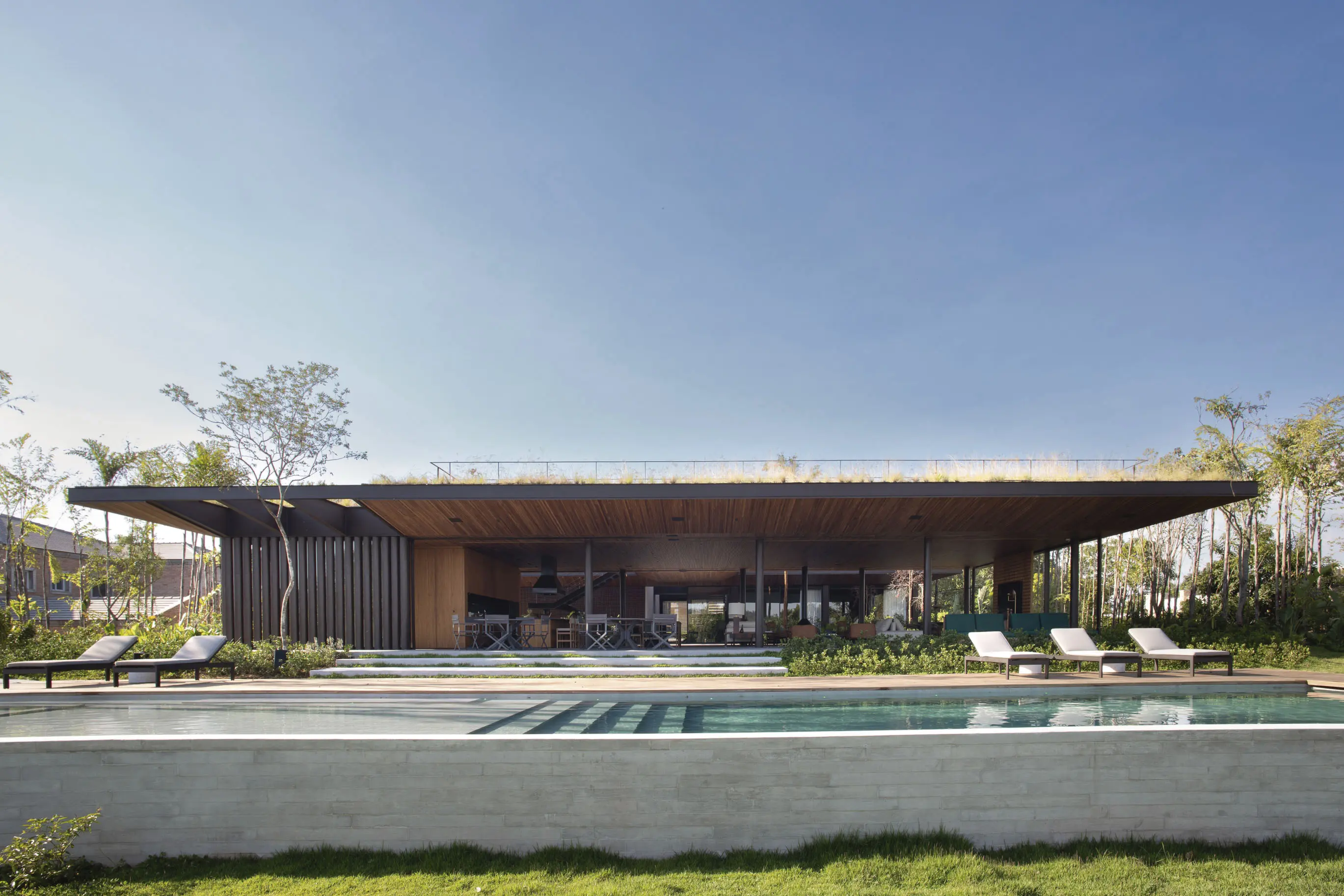 Entworfen für ein Paar im ländlichen Brasilien, vereint diese Residenz zeitgenössisches Design mit ökologischem Bewusstsein. Zwei Baukörper, verbunden durch einen überdachten Übergang, ermöglichen einen fließenden Übergang zwischen Innen- und Außenbereich. Der Sozialpavillon öffnet sich vollständig zur Landschaft und maximiert natürliches Licht und Belüftung. Solaranlagen und lokale Materialien verringern die Umweltbelastung. Autorale brasilianische Möbel vervollständigen einen warmen, funktionalen Raum, der tief mit der Natur verbunden ist.