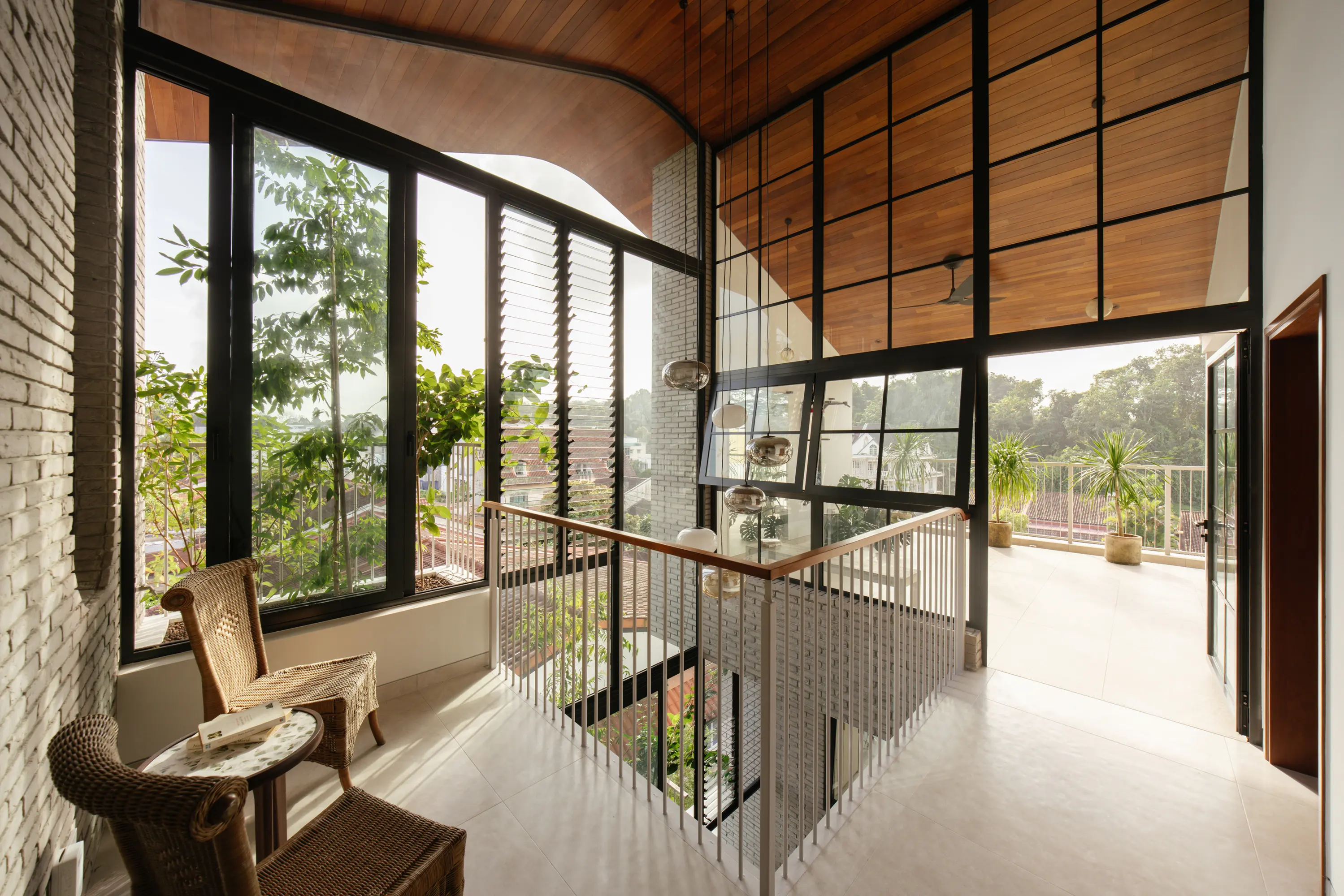 Linked Terraces passt ein eingeschossiges Doppelhaus sensibel an, indem der vordere Teil erhalten bleibt – Erinnerungen und gebundener Kohlenstoff werden bewahrt – und ein dreigeschossiger Anbau den wachsenden Familienbedarf deckt. Geleitet vom Konzept des Verbindens zwischen Vergangenheit und Gegenwart, Mitgliedern und Innen- und Außenräumen, bildet ein gestaffeltes Atrium das Zentrum, bringt Licht und Luft ins Innere und verbindet Gemeinschaftsbereiche. Bepflanzte Terrassen filtern Licht, verströmen Düfte und wirken wie ein Garten. Passive Strategien sichern Klimaneutralität.