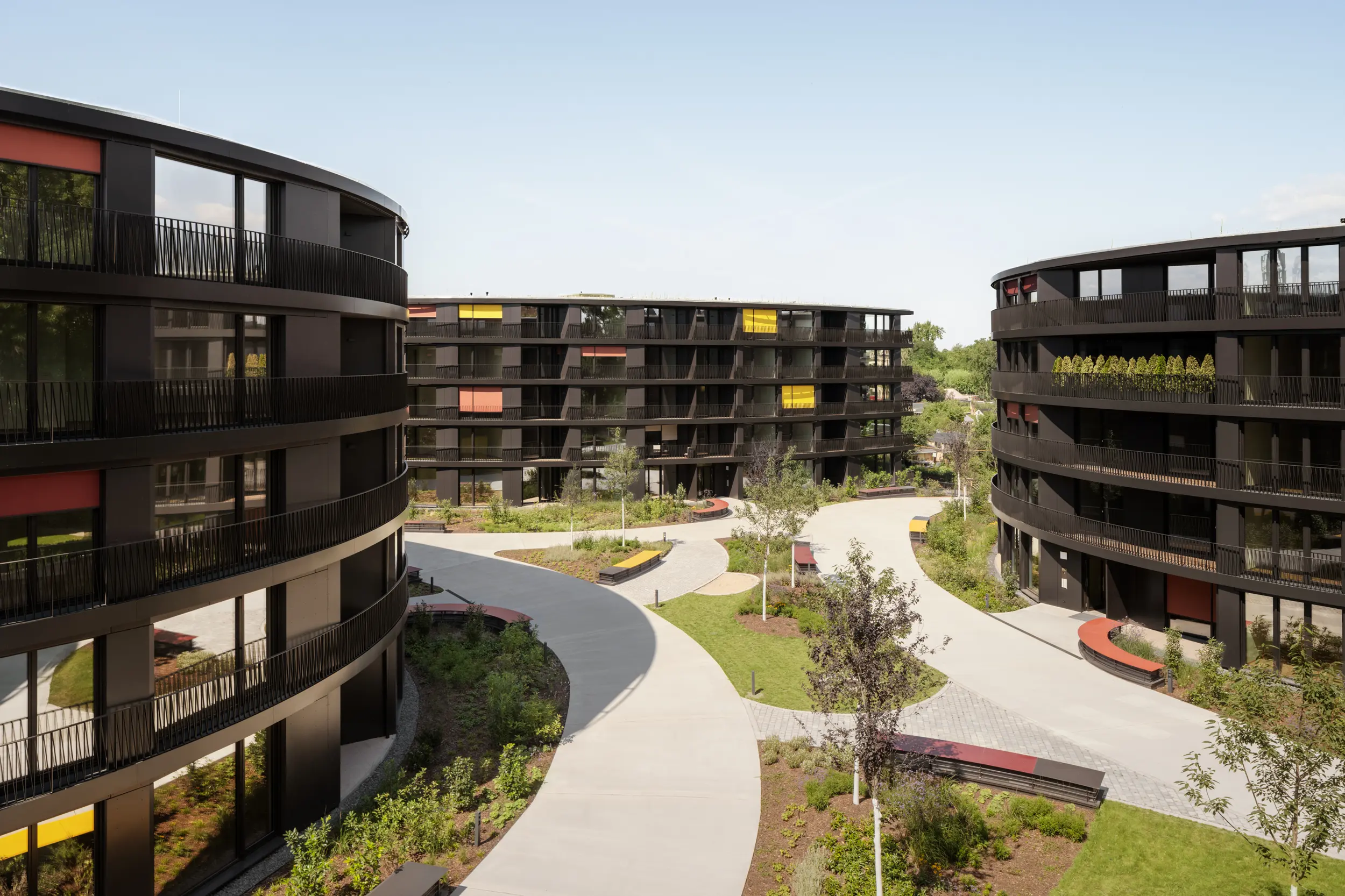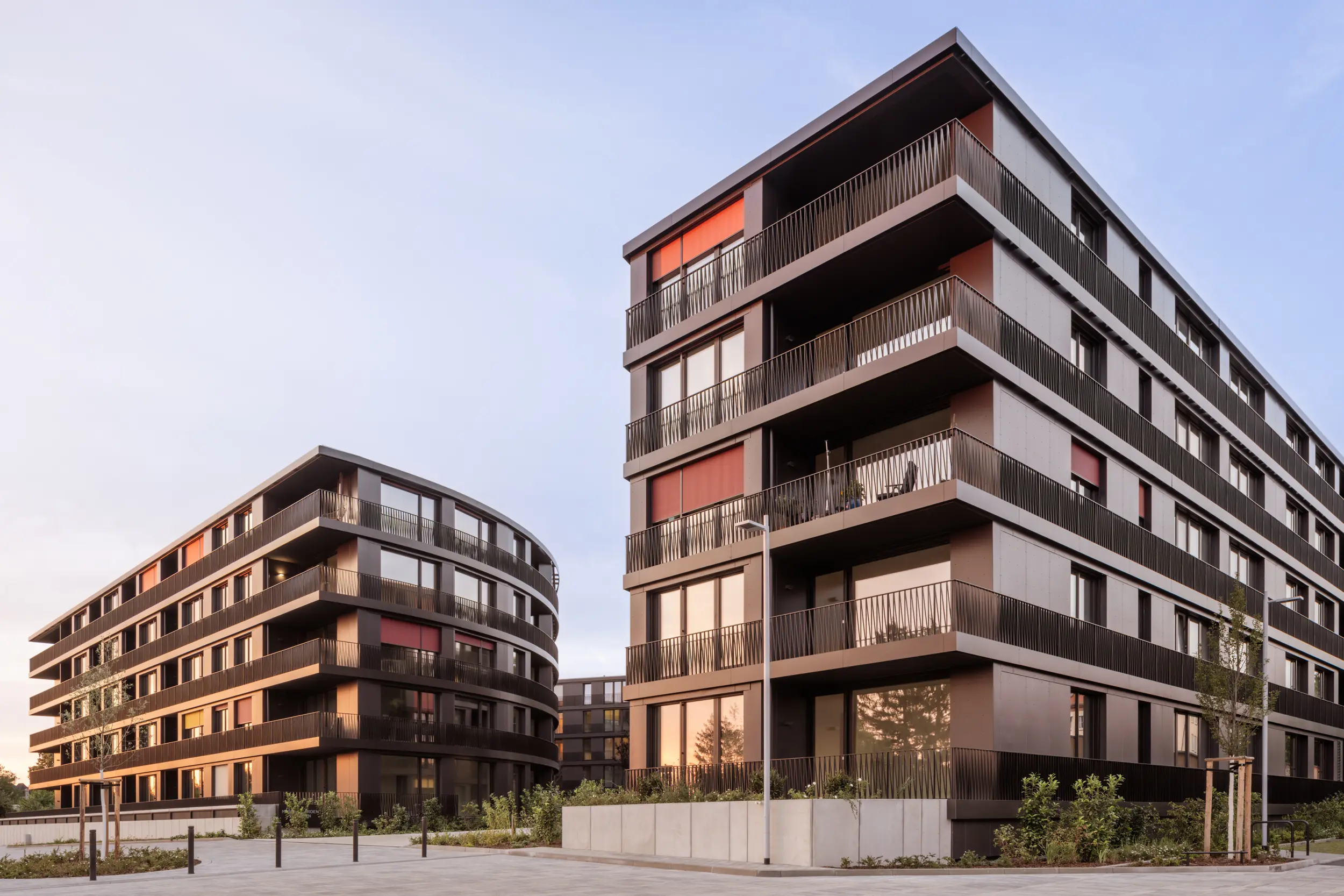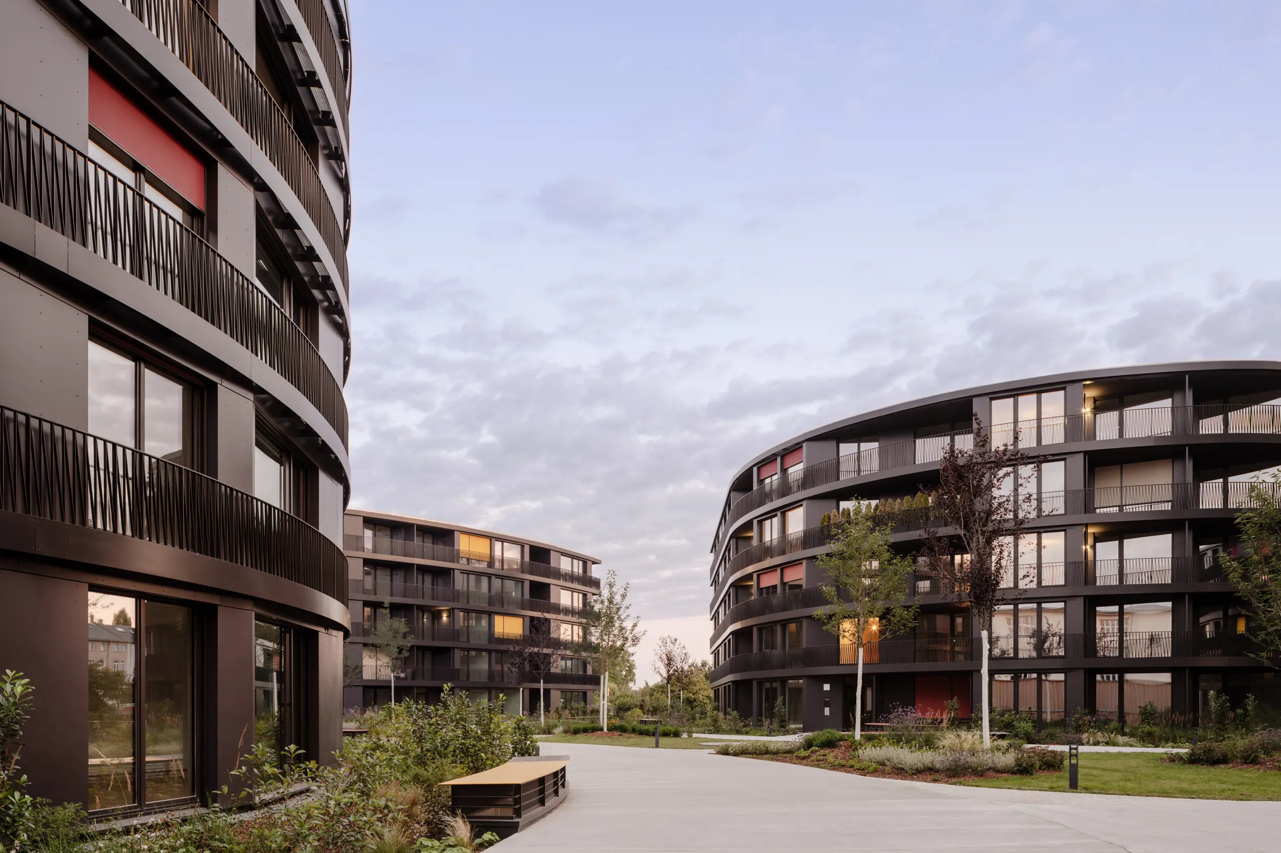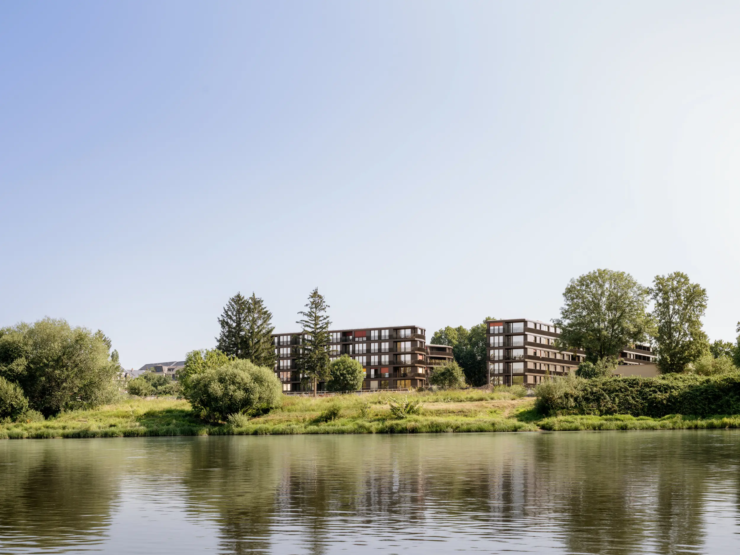 Marina Gardens entfaltet sich zwischen Flusslandschaft und Stadt, wo Elberadweg und Topografie aufeinandertreffen. Vier polygonale Baukörper umschließen einen parkartigen Innenhof, öffnen sich zu Wegen und Ufer und binden die historische Villa sensibel ein. Die tief auberginefarbenen Fassaden setzen einen malerischen Akzent zur grünen Umgebung, während Loggien und große Fenster Weite und Licht ins Wohnen bringen. Der Hof mit dichter Vegetation, Spiel- und Aufenthaltsinseln bildet das Herzstück. Nachhaltige Technik, begrünte Dächer und ressourcenschonende Konzepte machen das Quartier zu einem lebendigen Bindeglied von Naturraum und Urbanität.