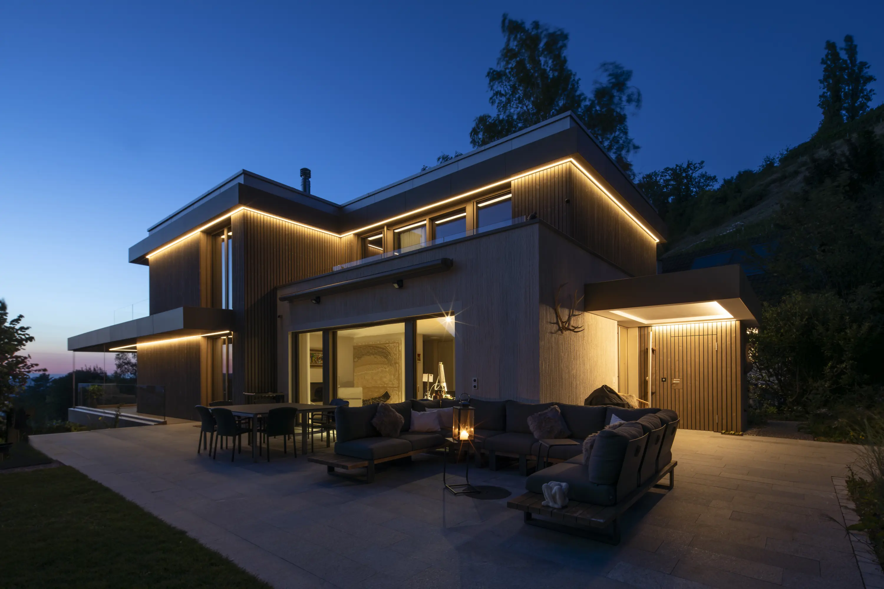 Was macht man, wenn man ein Haus an bester Lage mit einem unglaublich schönen Ausblick ins Tal, über die Stadt hinweg bis ins Nachbarland besitzt, aber das Wohnzimmer und alle Fenster sich zum Wald am Hang hin orientieren? Man dreht das Haus um! Genau das haben wir hier gemacht. Die Aufgabe für Fox Wälle Architekten bestand darin, die Orientierung einer bestehenden Villa an schöner Hanglage zu drehen und zur Aussicht hin zu wenden. Die Bauherrschaft wünschte ein Haus in zeitgenössischem, sich am Minimalismus orientierenden Stil, mit einem Flachdach mit Terrassen.