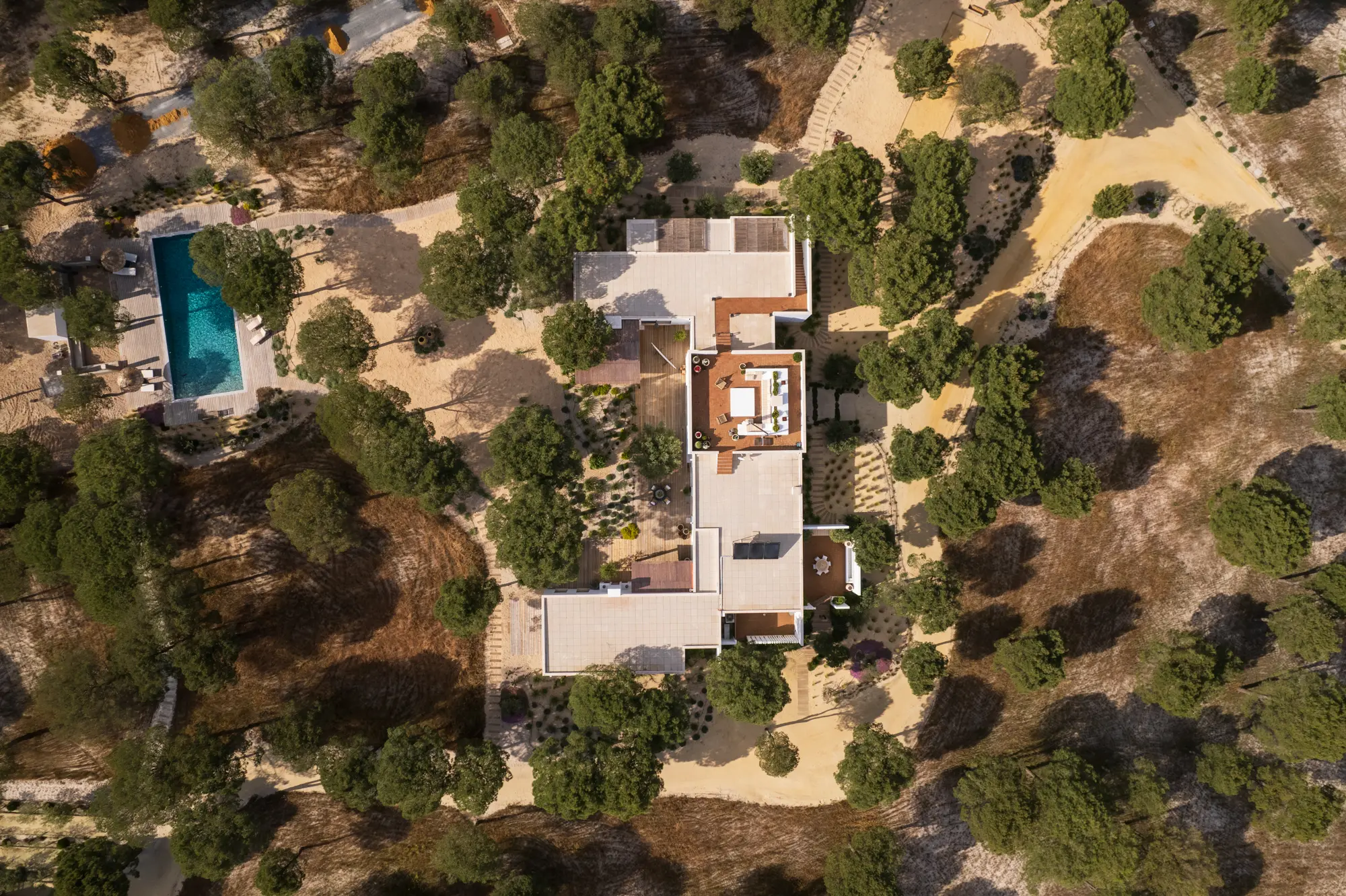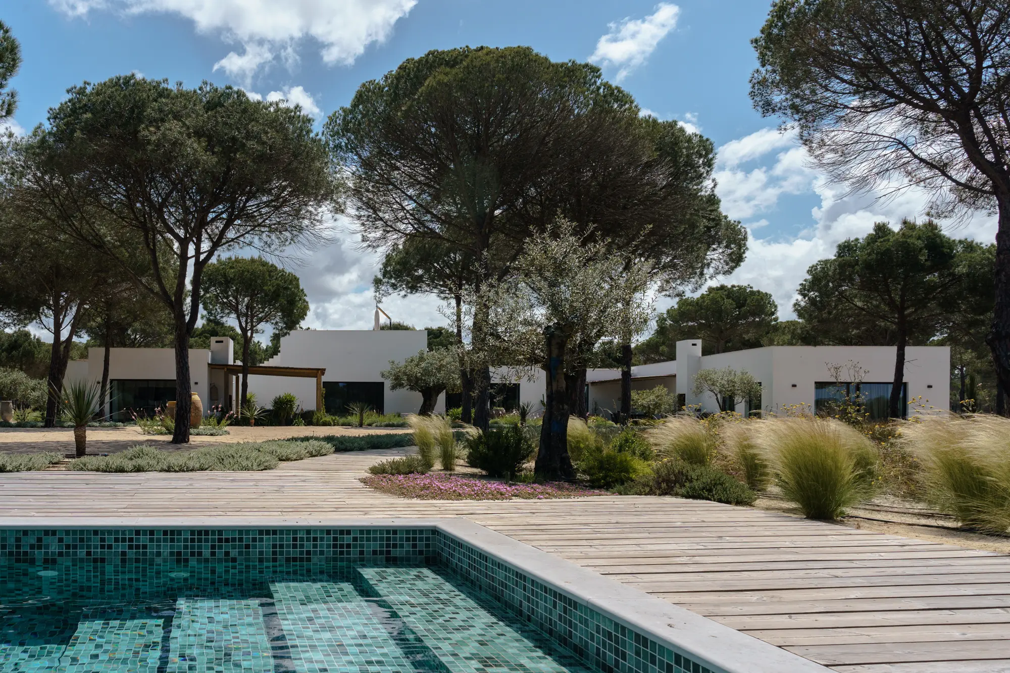 Mitten in den Pinien und Korkeichen von Comporta entwarf SabraB Architecture ein L-förmiges Haus, das sich behutsam in die Dünen einfügt. Ein Hof schafft Lichtspiele auf weißen Fassaden, Glasfronten und Terrassen verbinden innen und außen. Der Wohnbereich öffnet sich zu einem Garten mit Zypressen und Erdbeerbäumen, der private Flügel bietet Suiten mit kräuterbepflanzten Terrassen. Hauptsuite und Büro liegen unter einer Korkeiche, ergänzt durch Dachterrassen und einen Pool, der den Wald spiegelt. Mit klarer Form und organischer Präsenz feiert SabraB Architecture den wilden Charme Comporta.