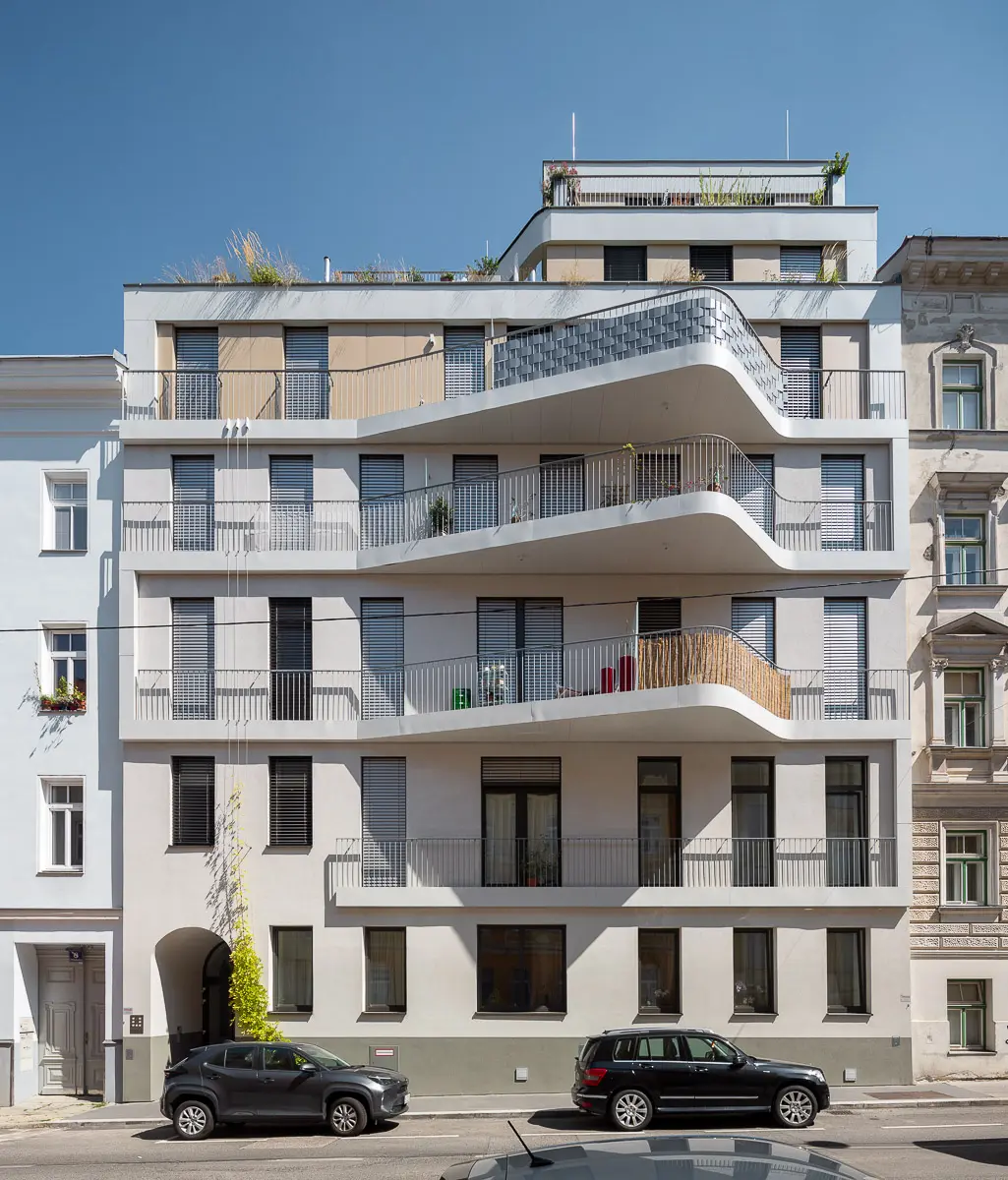 Wohn-Garten“ in der Fröbelgasse 6 erweitert die Wohnnutzfläche durch innovative Nachverdichtung um 82 % – ganz ohne neue Versiegelung. Die energieeffiziente Sanierung reduzierte den HWB von 188 auf 32 kWh/m²a, bei einer jährlichen CO₂-Einsparung von 155 t. Das Gebäude ist barrierefrei, zu 100 % dekarbonisiert und beherbergt ein innovatives Free-Cooling-Forschungsprojekt. Straßenseitige Fassadenbegrünung und begrünte Innenhöfe runden das Konzept ab.