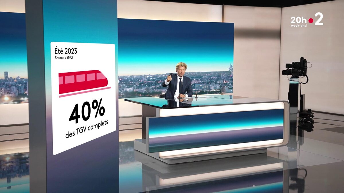 Digitales Design war Hauptinspirationsquelle für die visuelle Identität der France-2-Nachrichten. Ein wandelbares Design aus Responsive Boxes schafft eindeutige Bezugspunkte für Zuschauer. Ein Design, das die Nachrichten besser verständlich macht und einen echten Dialog zwischen Bildern und Information herstellt. Der Opener nutzt einen der zentralen grafischen Codes von France 2: einen Punkt, der sich wie eine Welle auf Studioscreens ausbreitet und zum Logo der Nachrichtensendung wird.
