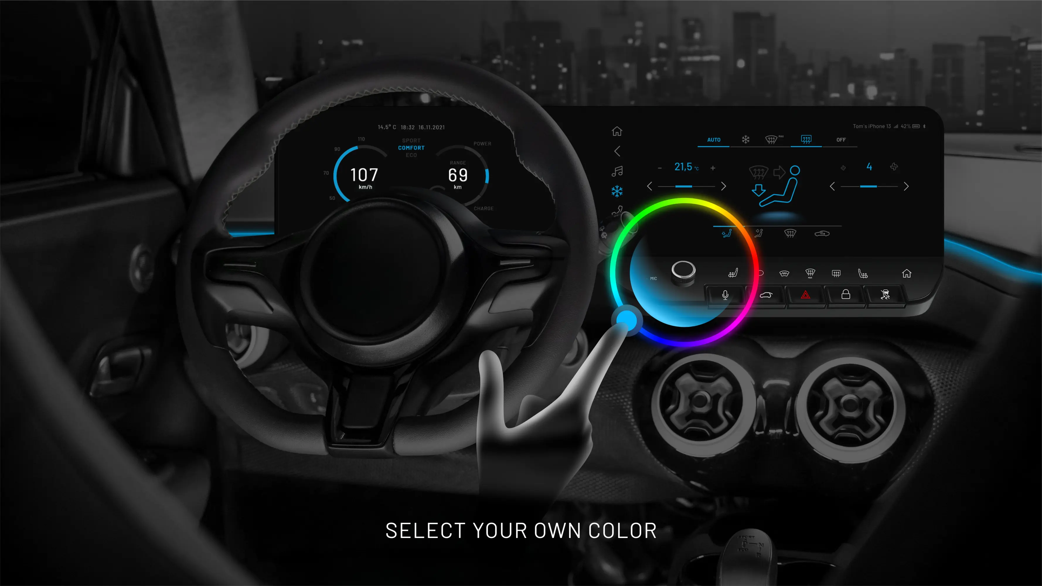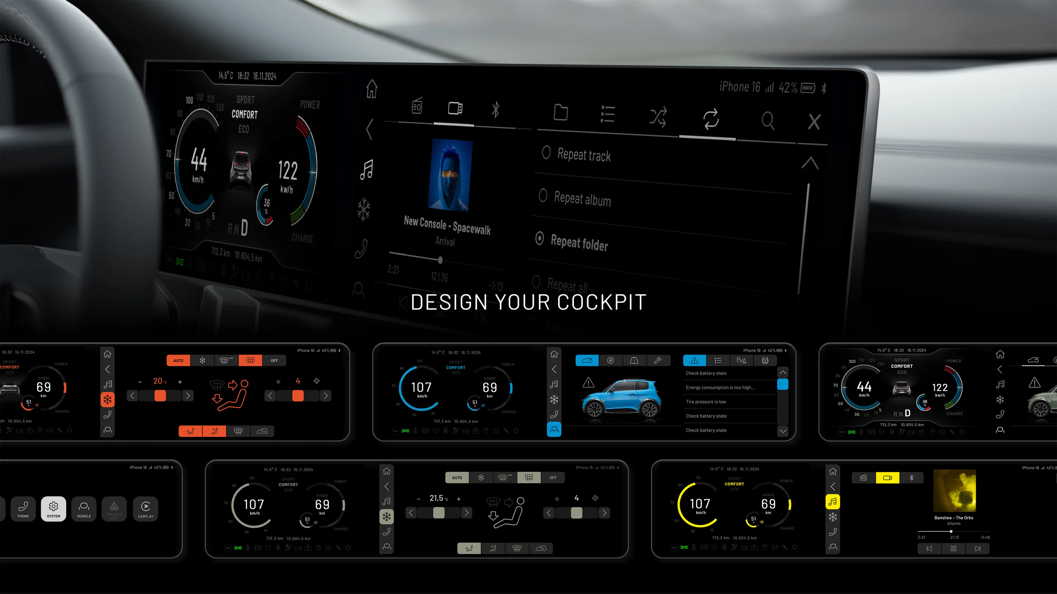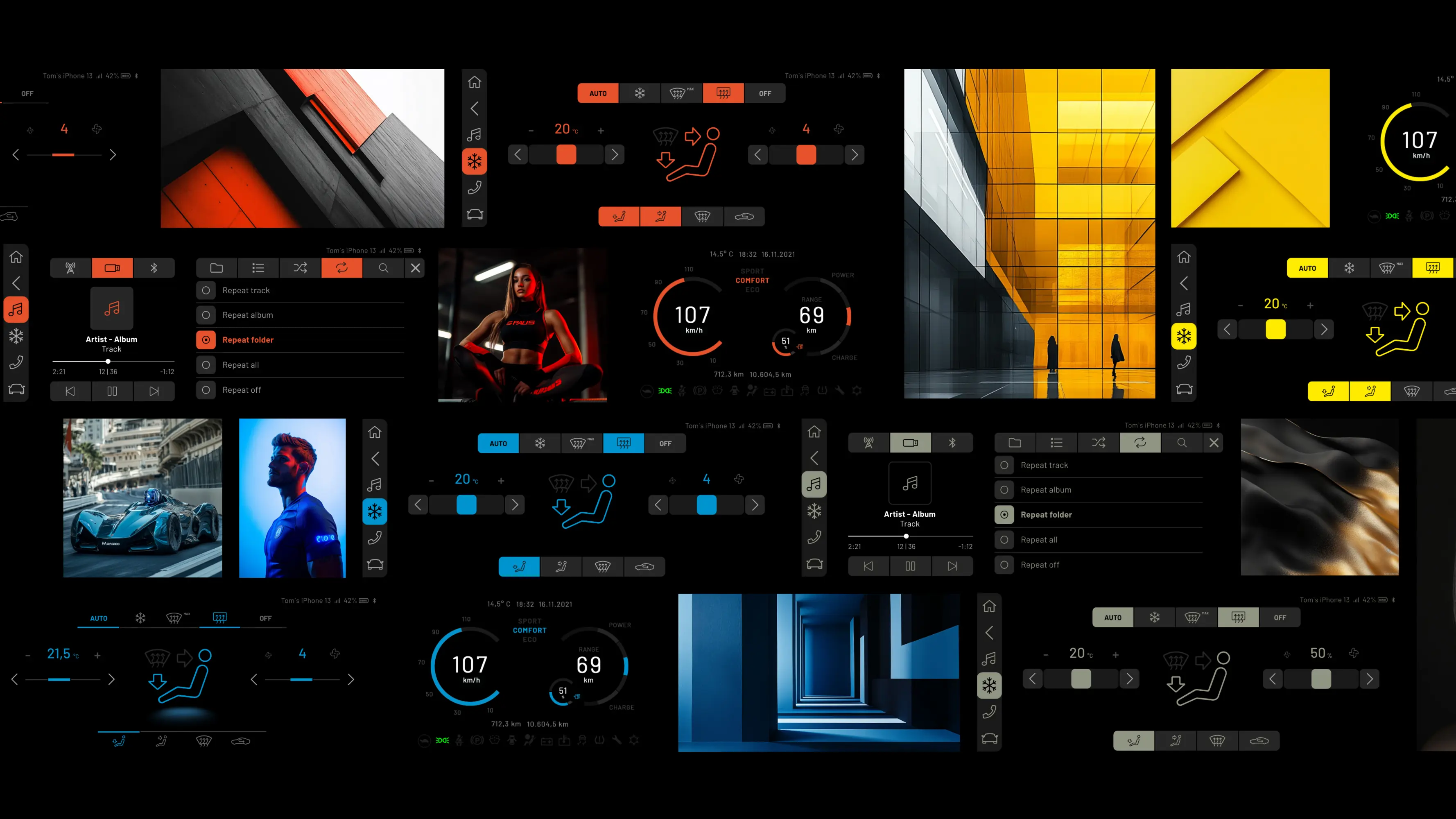 Das HMI Design Concept standardisiert Kernfunktionen und Anforderungen für Infotainment und digitale Cockpits. Es ermöglicht schnelle Anpassungen, personalisierbare Themen, Farben und Schriftarten. Hoher Kontrast, gute Lesbarkeit, klare Strukturen, einfache Navigation und aktuelle UX-Standards sorgen für ein intuitives Nutzererlebnis. Der modulare Aufbau gewährleistet Konsistenz, Flexibilität und schnelle Reaktionen auf Projektanforderungen.
