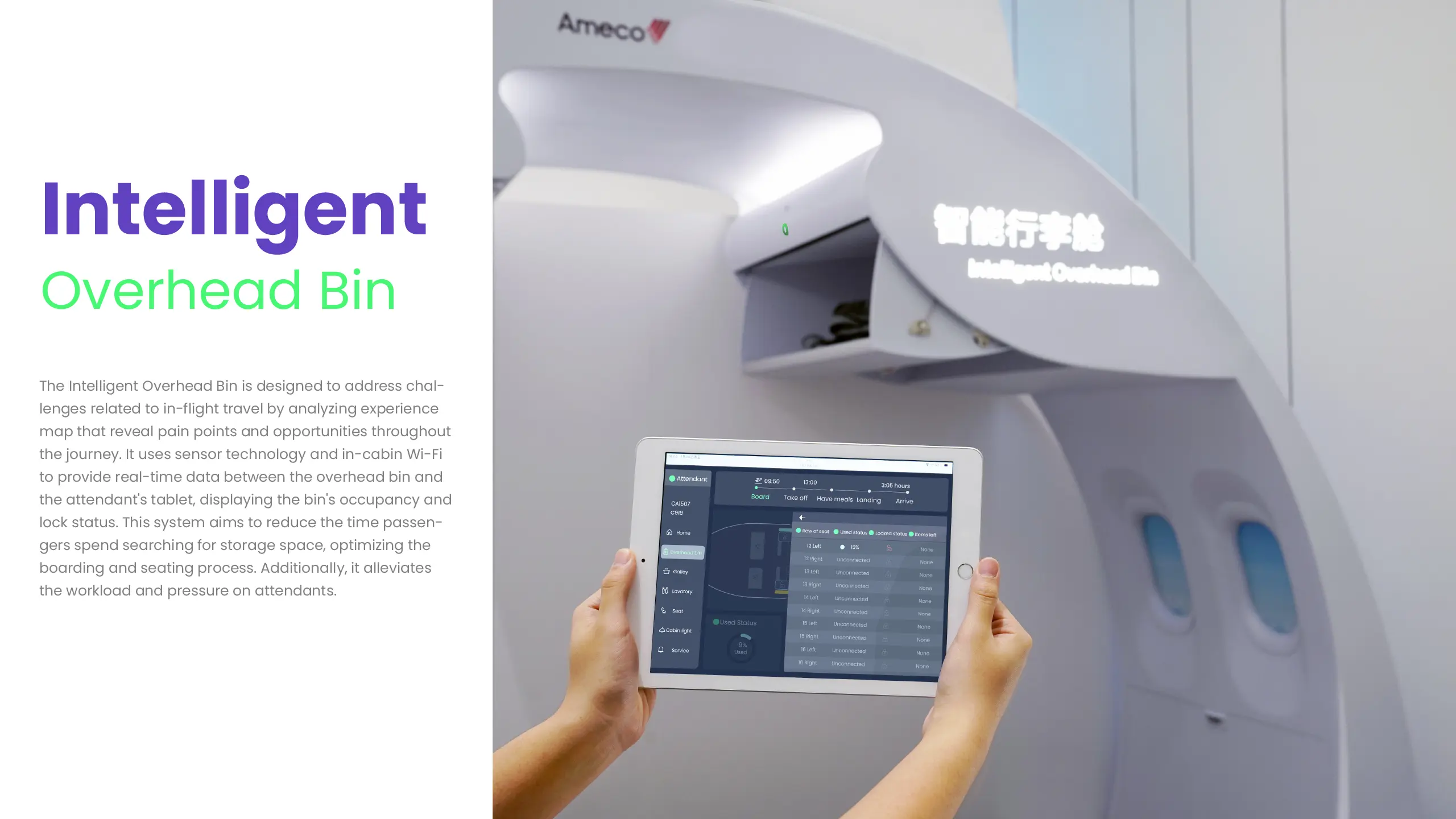 Der Intelligent Overhead Bin verändert das Reisen während des Fluges, indem er die wichtigsten Herausforderungen durch eine detaillierte Analyse der Passagier-Erlebniskarte angeht. Er nutzt Sensortechnologie und Wi-Fi in der Kabine, um Echtzeitdaten zwischen dem Gepäckfach und dem Tablet des Flugbegleiters zu liefern, die die Belegung und den Verschlussstatus des Fachs anzeigen. Dieses innovative System verkürzt die Zeit, die Passagiere mit der Suche nach einem Ablagefach verbringen, und rationalisiert den Einsteigevorgang. Außerdem wird die Arbeitslast und der Druck auf die Flugbegleiter verringert.