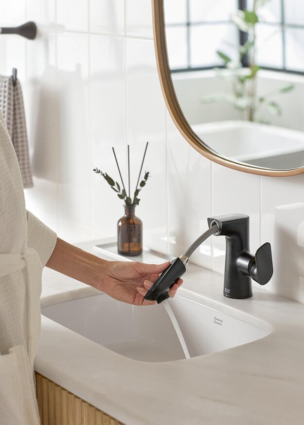 Aspirations von American Standard ist eine Einhebel-Badarmatur mit ausziehbarem Sprühkopf, mit dem jede Ecke des Waschbeckens schnell und einfach gereinigt werden kann. Mit diesem neuen und innovativen Wasserhahn ist die Reinigung des Waschbeckens so mühelos, Putzen wird somit zum Vergnügen! Der große Aktionsradius mit dem einzigartigen ausziehbaren Sprühkopf macht das Spülen, Reinigen und präzise Befüllen einfacher und komfortabler denn je. Mit seinem minimalistischen, zeitgemäßen Design und ausgewogenen Proportionen ist dieser Einhebelmischer die perfekte Wahl für das Badezimmer von heute.