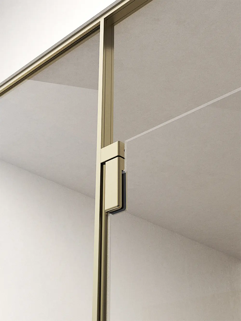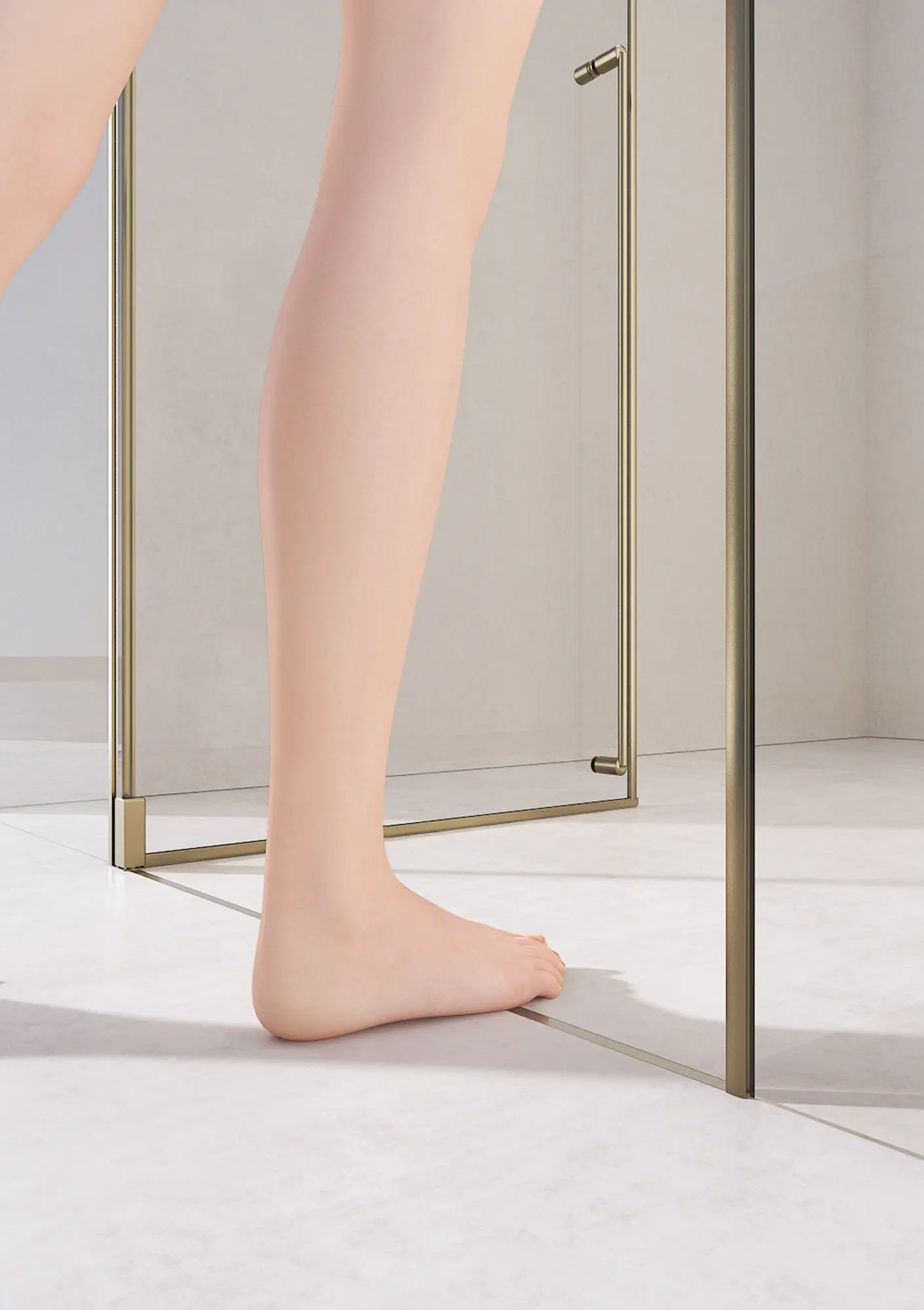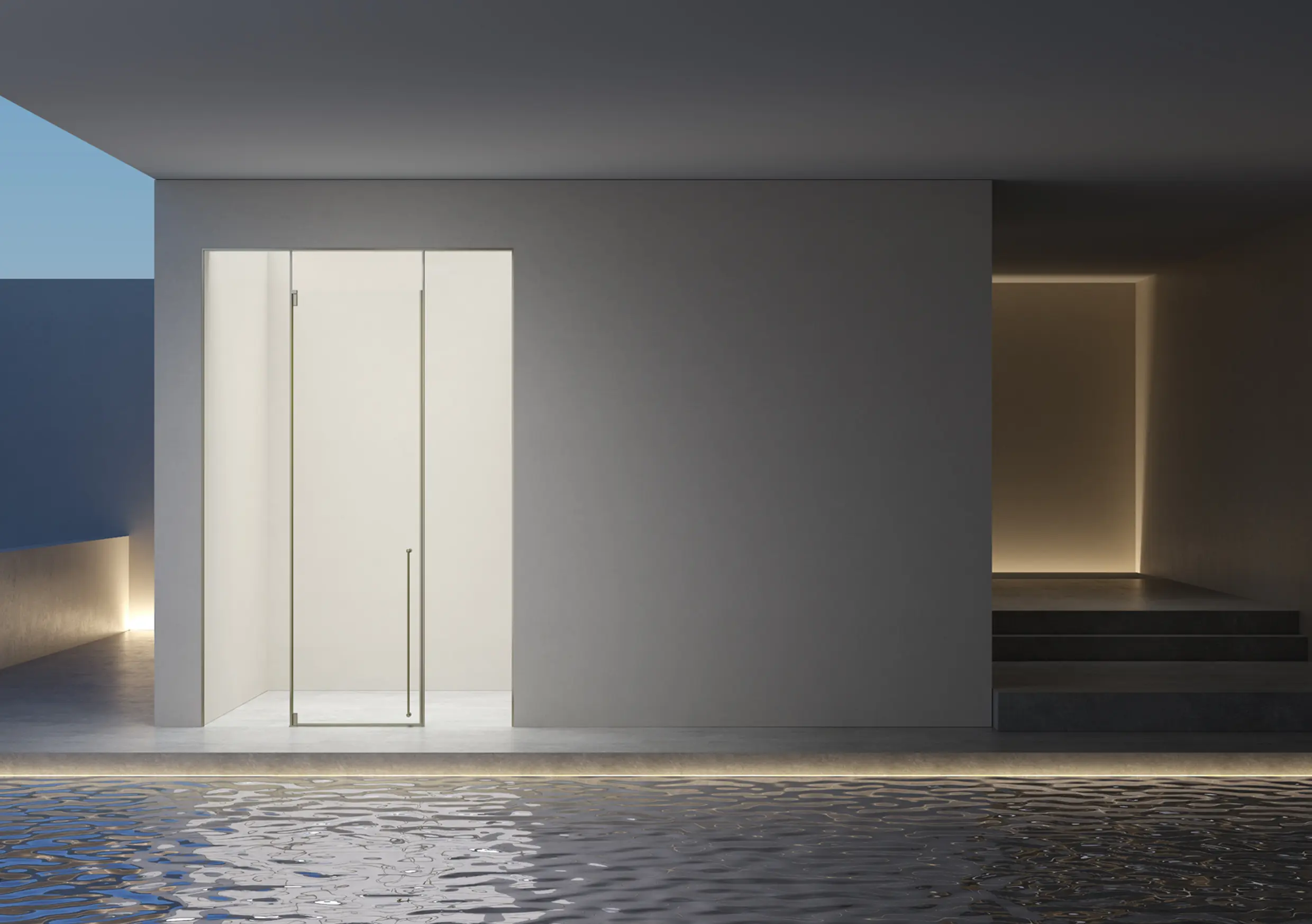 Die Skyview 3.0 bietet ultraschmalen 10-mm-Wandrahmen für maximale Glastransparenz. Kompakte 65 mm × 22 mm Scharniere integrieren sich nahtlos ins Türglas und sorgen für bündigen Einbau. Sie sind in beide Richtungen und um 180° drehbar. Der patentierte Wasserdichte Magnet nutzt bodenmontierte Aluminiumstreifen mit unsichtbarer magnetischer Anziehungskraft. Die Montage erfolgt oberflächenmontiert für Wasserrückhaltung oder flächenbündig für barrierefreien Zugang. Der Magnetstreifen verfügt über Weichdichtungen für Verschluss bei 2 mm Abstand für reibungslosen Betrieb. Ein versenkter Griff im unteren Bereich gewährleistet die Zugänglichkeit.