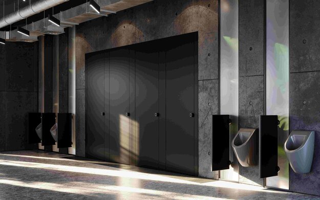 Die WC-Trennwand »Blackline« setzt durch die konsequente Verwendung von mattschwarzen Oberflächen neue Akzente in der Gestaltung öffentlicher Sanitärbereiche. Der ergonomische Türgriff mit gut sichtbarer Frei-Besetzt-Anzeige bietet eine praktische Lösung für stark frequentierte Umgebungen und zeigt, wie Design und Funktionalität nahtlos ineinandergreifen können.