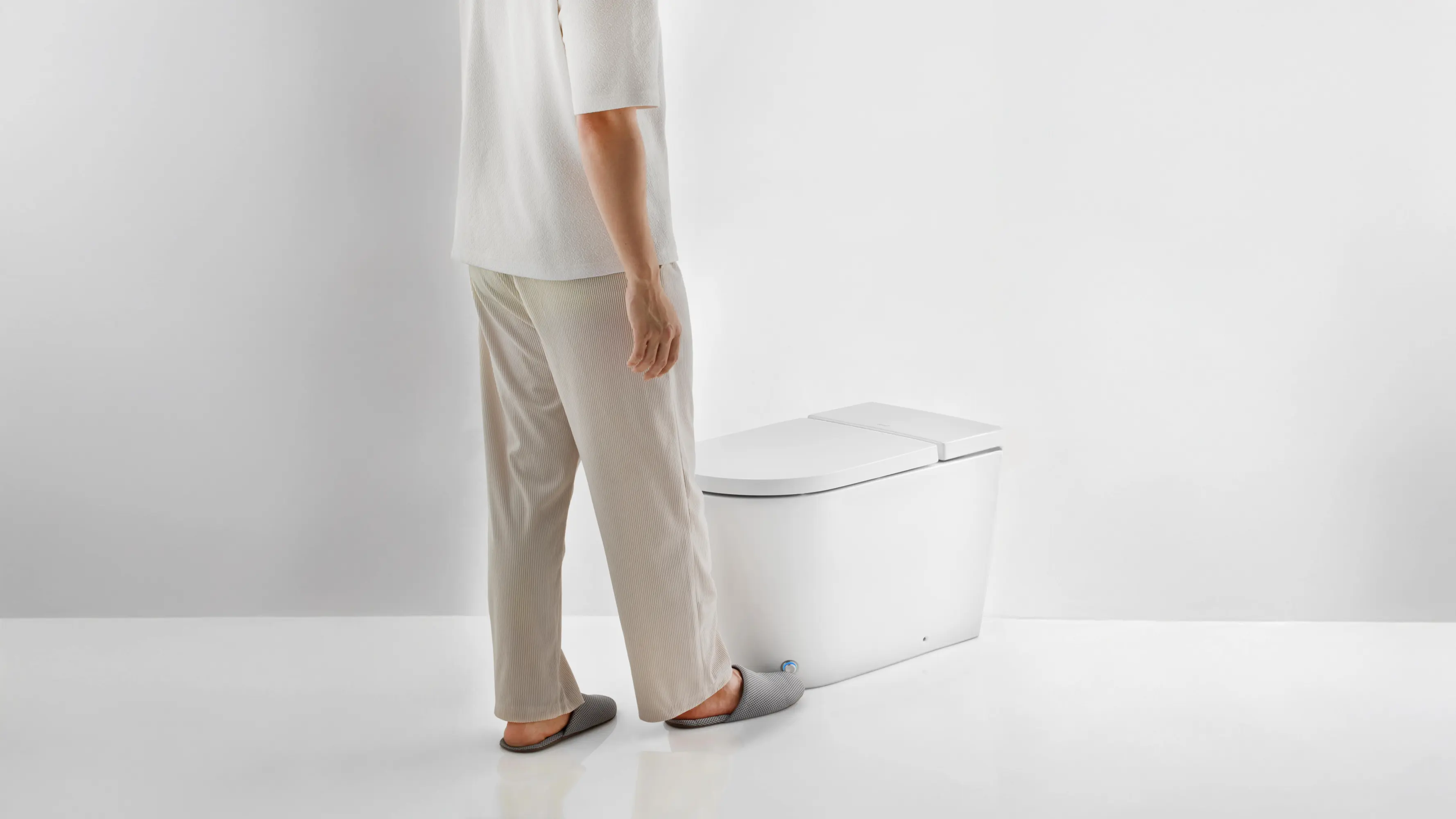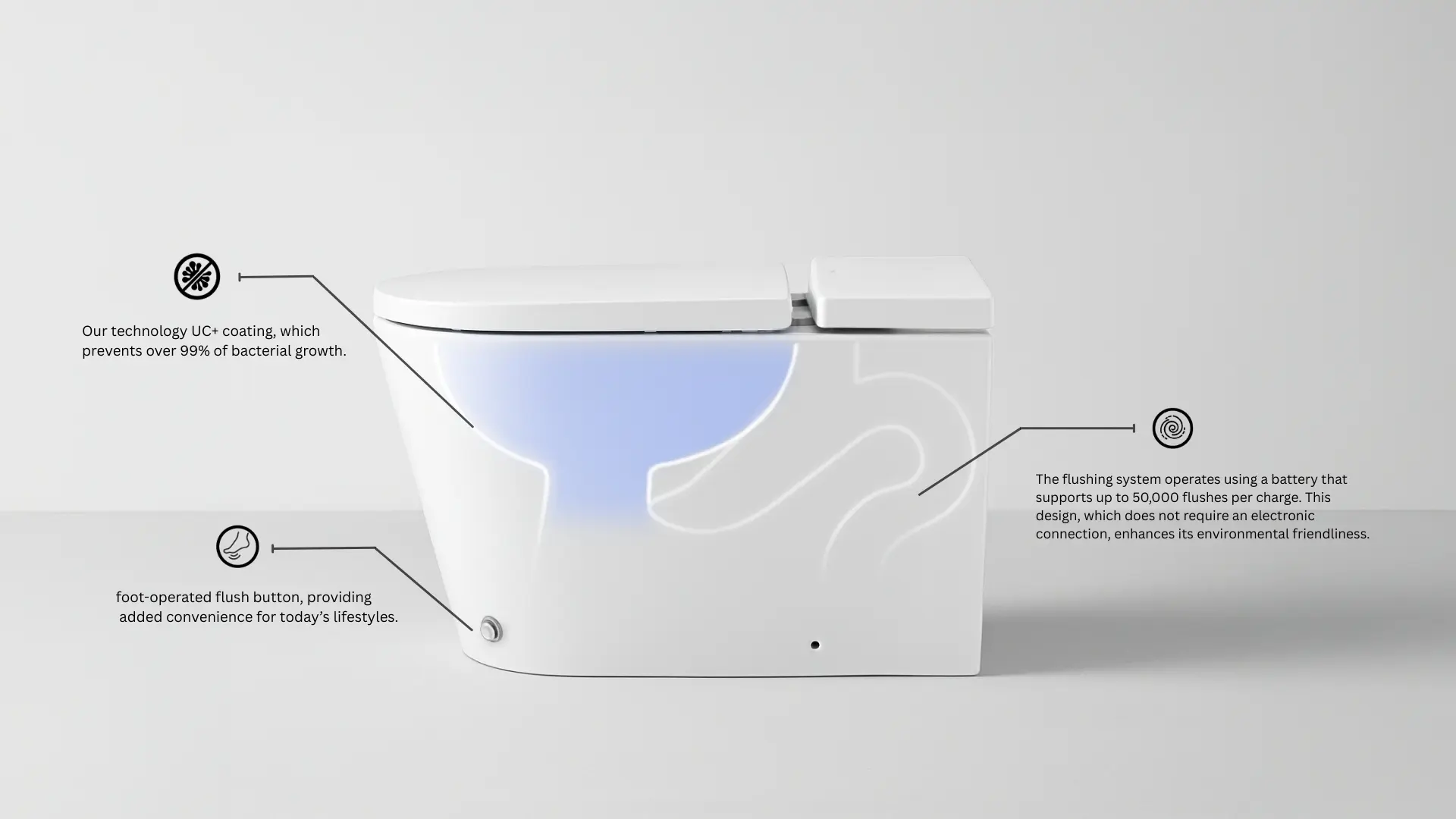 Duact ist ein minimalistisches, spülkastenloses WC mit klaren Linien, das über eine berührungslose Spülung per Kick-Sensor und eine hygienische, schmutzabweisende UC+-Beschichtung verfügt, die zu 99 % antibakteriell ist. Es wird mit einem energieeffizienten 6,0-V-Gleichstromsystem betrieben und verbraucht nur 4,5 Liter pro Spülung. Das spülkastenlose Design reduziert das Gewicht der Toilette um 20 %, was eine kompaktere Verpackung und einen effizienten Transport ermöglicht und somit sowohl Nachhaltigkeit als auch ein überlegenes Benutzererlebnis bietet.