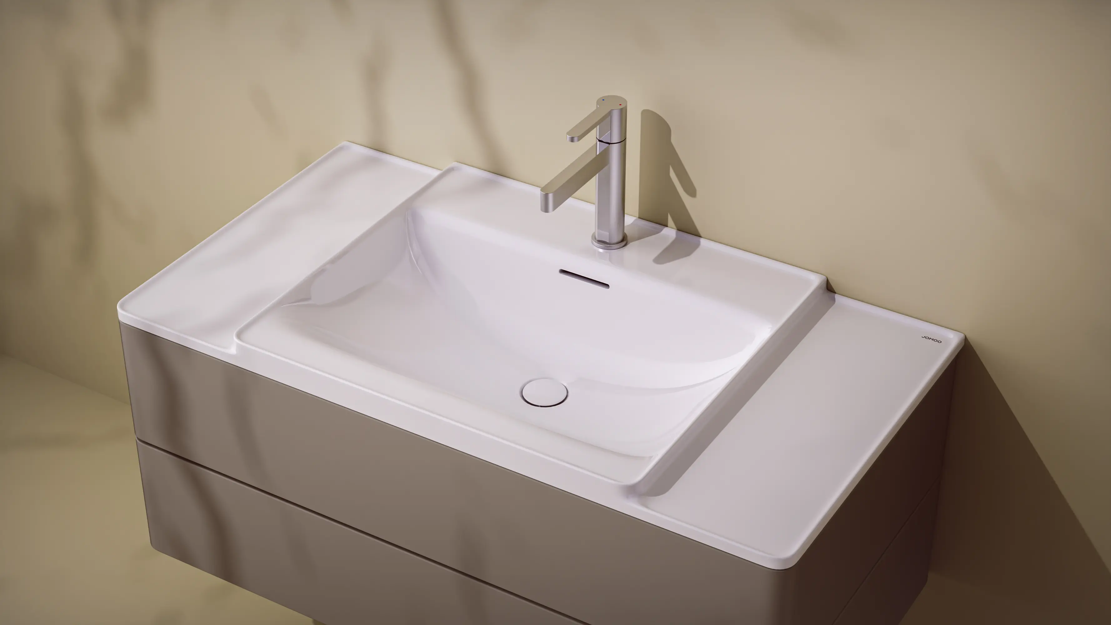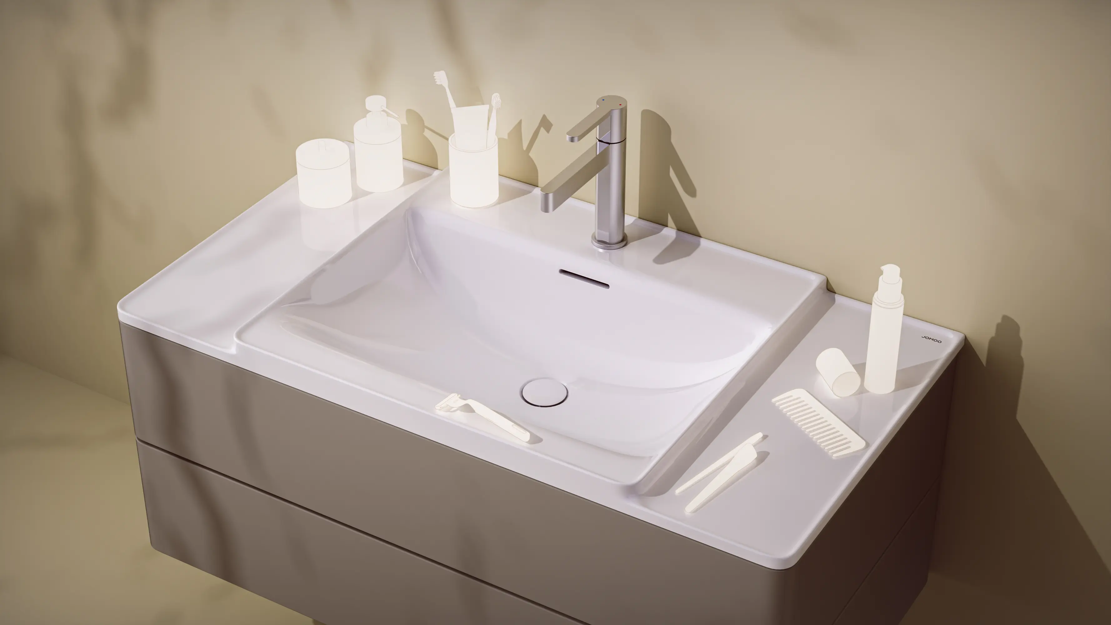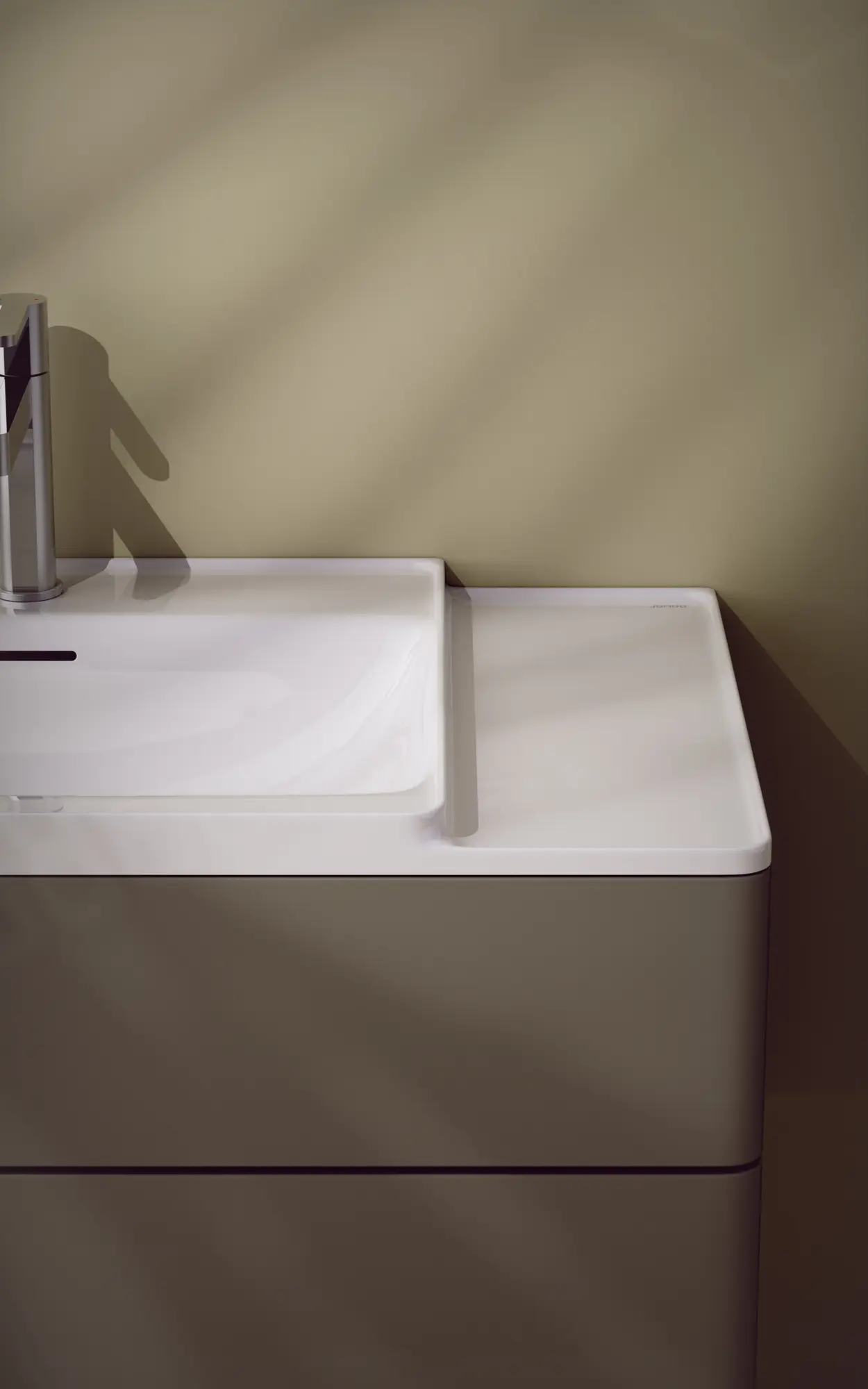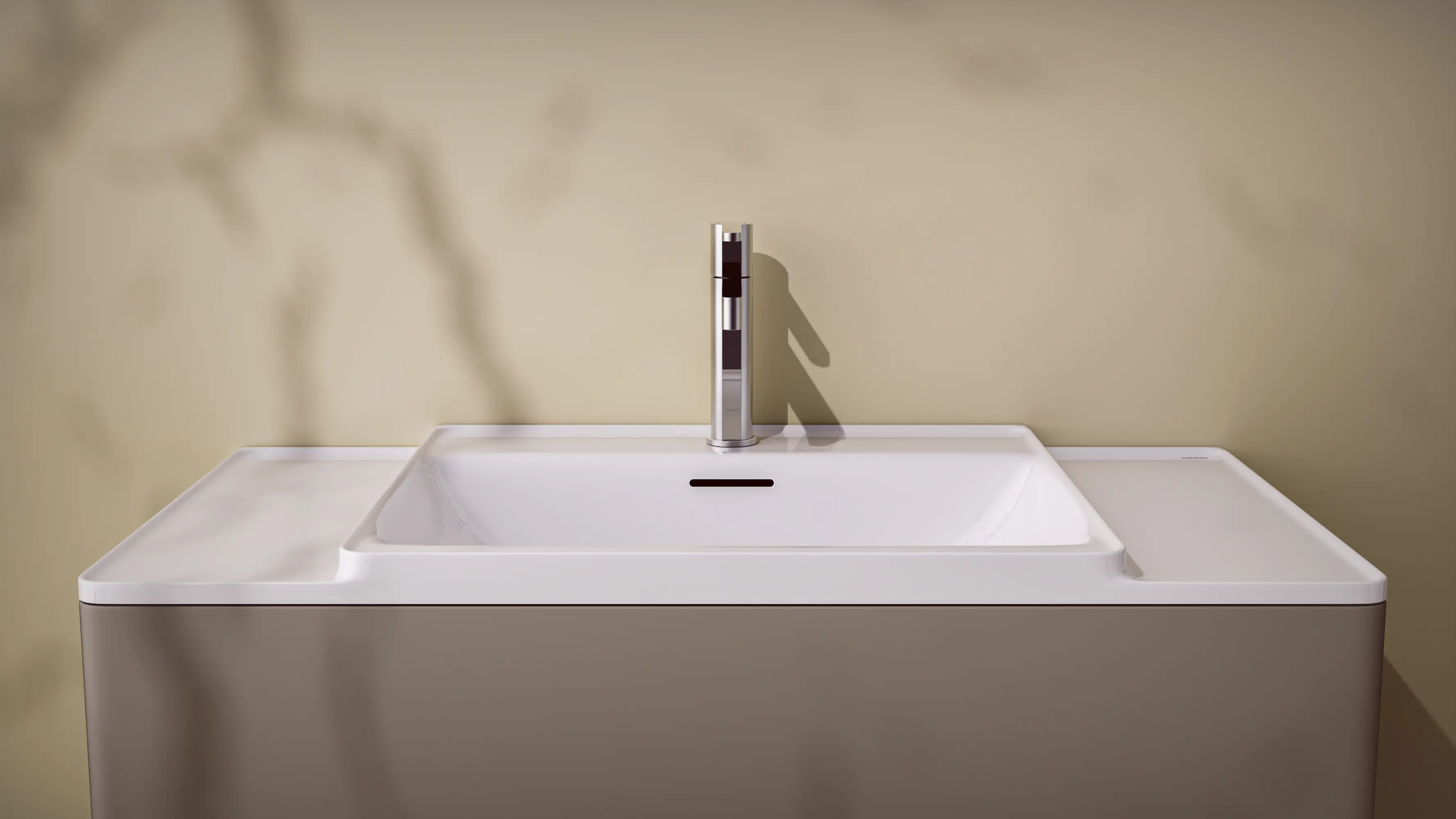 ISLE rahmt und erhöht den Nassbereich und integriert seitliche Ablagen elegant, wodurch Charakter und Funktionalität in den Waschraum einziehen. Es hält Wasser zurück, verhindert Spritzer und schafft eine Zone für griffbereite oder dekorative Gegenstände. Im zentralen Rahmen sammelt eine vertiefte Armaturenbank Tropfen, während der vordere Bereich temporär schmutzige Objekte aufnimmt. Eine spezielle Nano-Glasur und weiche Formen sichern Ablauf, Reinigungsfähigkeit und Hygiene. Zirkoniumkeramik ermöglicht präzise Details, steigert die Haltbarkeit und verhindert Glasurrisse über die Zeit.