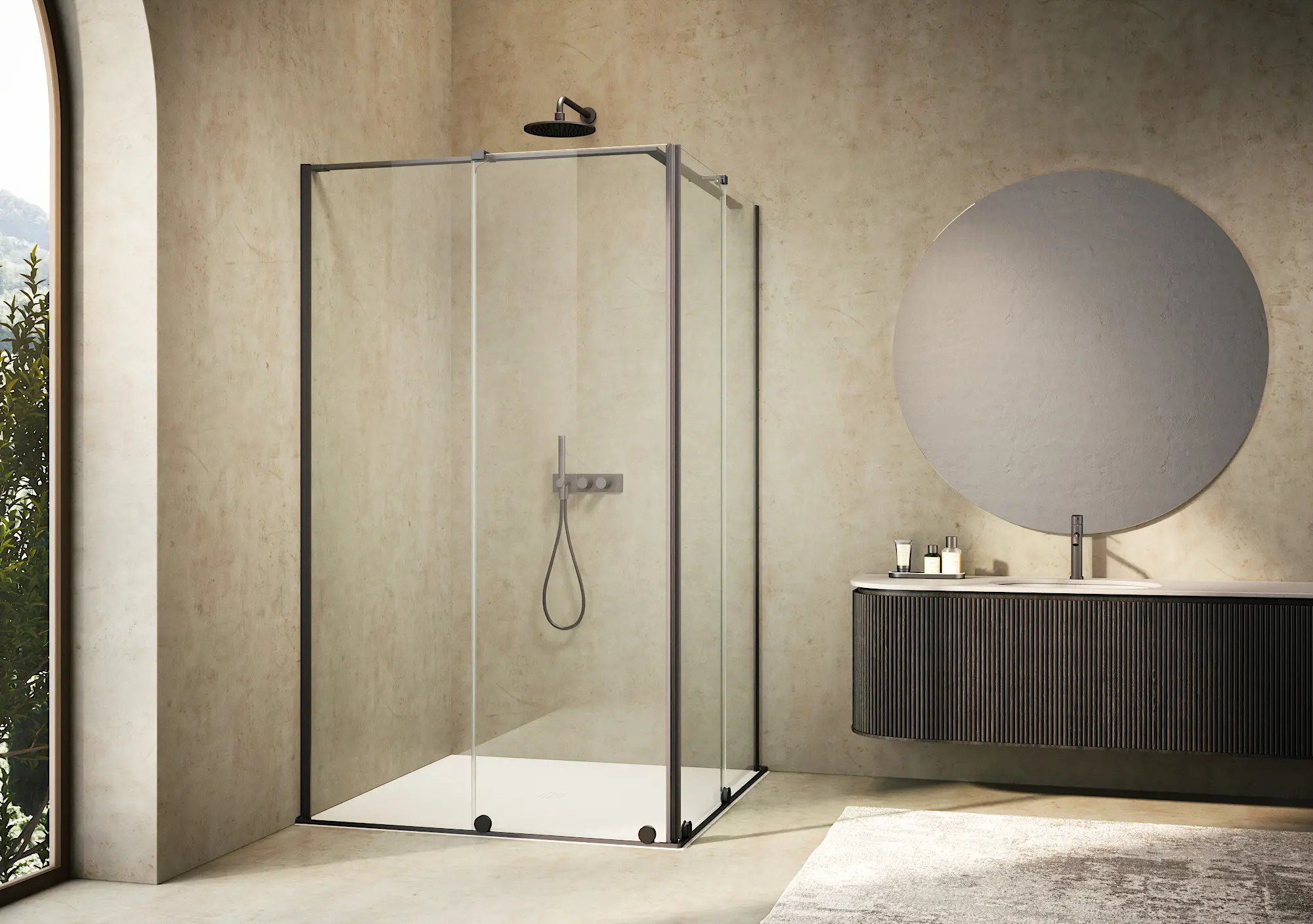 Die Serie S-LITE als Schiebetüren mit Festfeld und Seitenteil, überzeugt durch hohe Transparenz und einzigartiges Design. Gefertigt aus 8/6 mm starkem, gehärtetem Sicherheitsglas (ESG) gemäß DIN EN 12150, garantiert sie höchste Stabilität. Ein besonderes Highlight ist der raffinierte Glasausschnitt, der ein Überlappen der Scheiben elegant vermeidet und somit die Reinigung enorm erleichtert – exklusiv entworfen vom römischen Designstudio Talocci + Pallocca. Hochwertige Edelstahlrollen mit Höhenverstellung sorgen für ein sanftes Gleiten, der silikonfreie Wandanschluss und die schmale Griffleiste bieten maximalen Komfort und zeitlose Ästhetik.