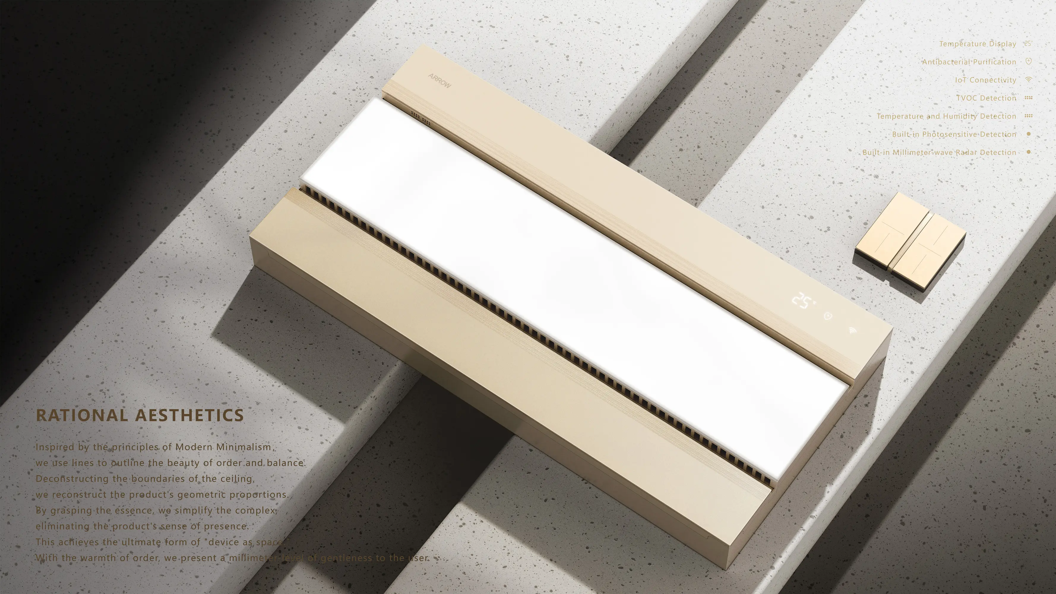 Die Badezimmerheizung Symmet zeichnet sich durch rationale Linien aus, die Ausgewogenheit und Ordnung schaffen. Sein Doppelturbinenmotor treibt ein um 120° oszillierendes Flügelrad an und lenkt den Luftstrom intelligent: Der innere Ventilator regelt die Temperatur, der äußere umgeht Hindernisse. Ein Doppelkanalsystem erneuert die Atmosphäre, vertreibt Feuchtigkeit und sorgt für Frische. Das schwebende Bedienfeld aus entspiegeltem Glas minimiert Nähte und bietet raffinierte taktile Interaktion. Eine Berührung aktiviert atmendes Licht für intuitive Steuerung. Drei Ambiente-Funktionen machen das Duschen zu einem eleganten Ritual.