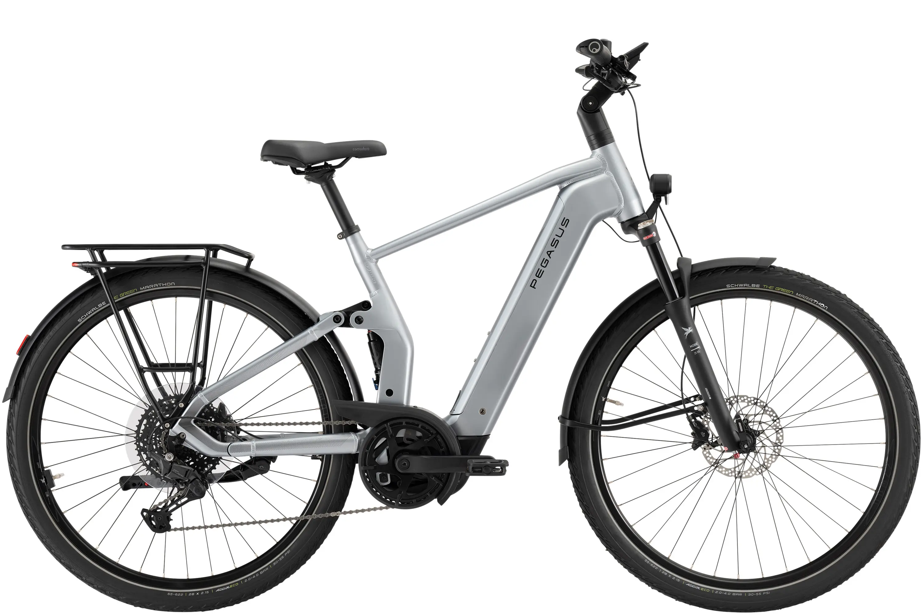 Das Pegasus Premio EVO FS10 Lite bietet Fahrkomfort auf höchstem Niveau und setzt zugleich ein Statement für elegantes E-Bike-Design. Der formschöne Hydroforming-Rahmen überzeugt mit klarer, harmonischer Linienführung, in die das Federbein dezent integriert ist. Auch das Rücklicht mit moderner Bremslichtfunktion fügt sich formschön in den Gepäckträger ein. Der Bosch Performance Line CX Motor mit bis zu 100 Nm sorgt für dynamische Unterstützung, während das große Kiox 500 Farbdisplay smarte Konnektivität liefert. Nachhaltig produzierte Schwalbe-Reifen runden das Konzept ab – ein E-Bike, das Design, Technik und Komfort gleichermaßen verbindet.