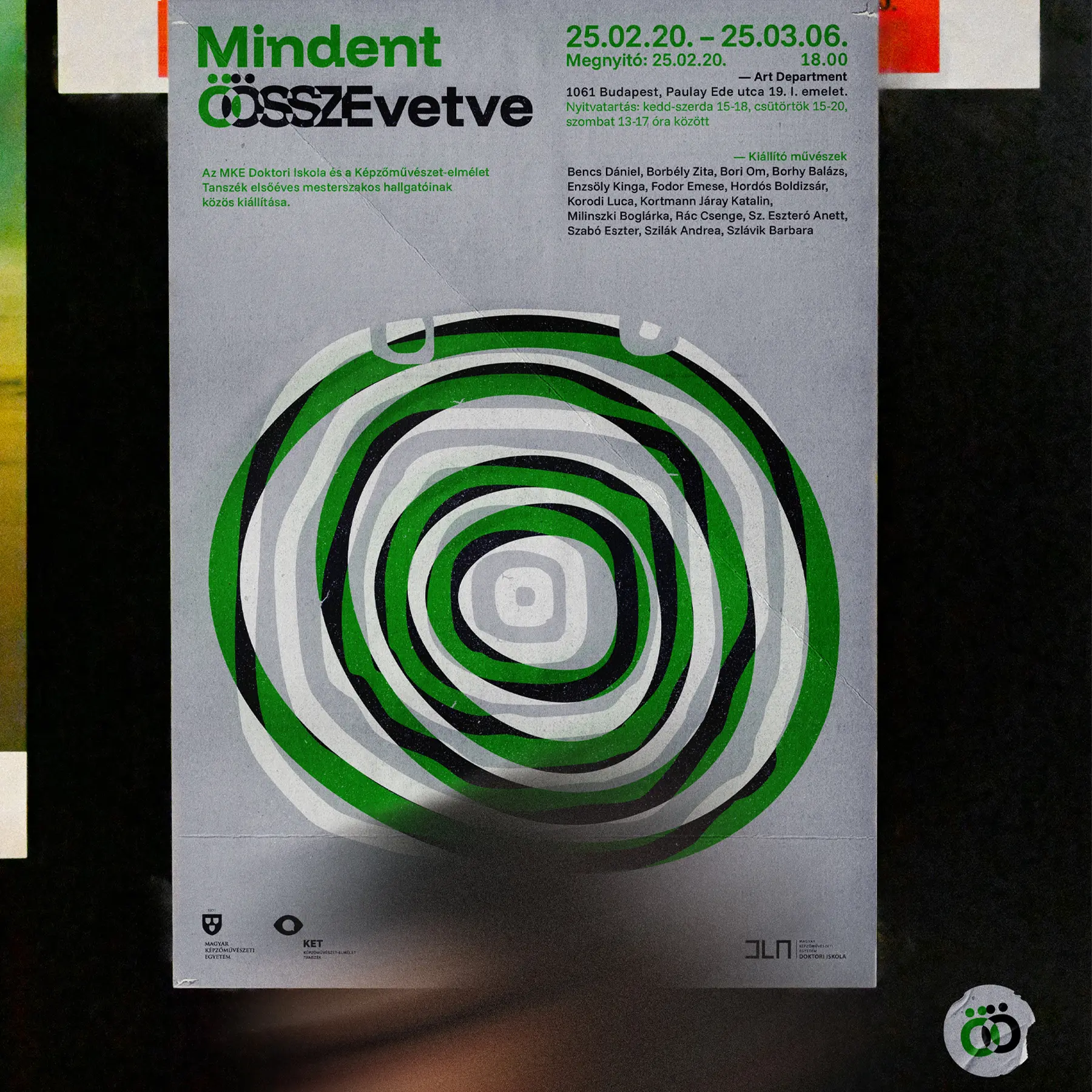 Die visuelle Identität der Ausstellung Mindent Összevetve (dt. Alles in allem) entstand in Zusammenarbeit zwischen der Doktorandenschule der Ungarischen Universität der Bildenden Künste und den Erstsemester-MA-Studierenden des Fachbereichs Kunsttheorie. Das grafische Leitmotiv erforscht, wie sich die Werke verflechten, einander beeinflussen und die enge Verwobenheit der Elemente widerspiegeln. Das Design verkörpert die Idee der Schnittpunkte: Wo künstlerische Praktiken zusammentreffen, Wege kreuzen und neue Verbindungen zwischen organischen und nicht-organischen Strukturen entstehen.