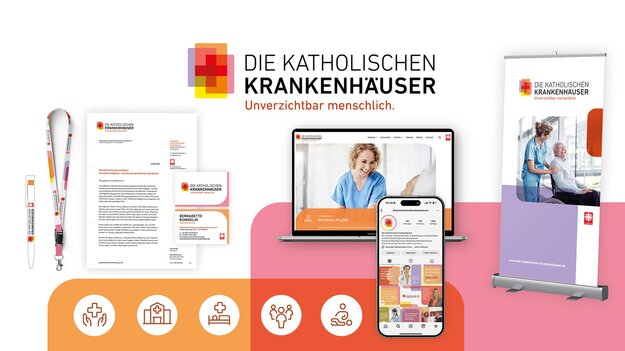 Überraschend, emotional und einprägsam – das ist der neue Auftritt des Katholischen Krankenhausverbands Deutschland e.V. Logo und CD spiegeln die Vielfalt der Arbeit der katholischen Krankenhäuser wider mit einem frischen, mutigen Farbspektrum und einer klaren Message in Bildern und Claim. Die neue Marke zeigt und sagt deutlich, was im Mittelpunkt bei allen Themen rund um Krankenhäuser stehen muss: der Mensch. Das Rebranding ist eine große Weiterentwicklung des vorherigen, starren Looks mit dem Fokus auf Verbandsstrukturen und die Abkürzung kkvd. Es bietet die Chance, im Gesundheitsbereich und der politischen Welt komplett neu aufzutreten.