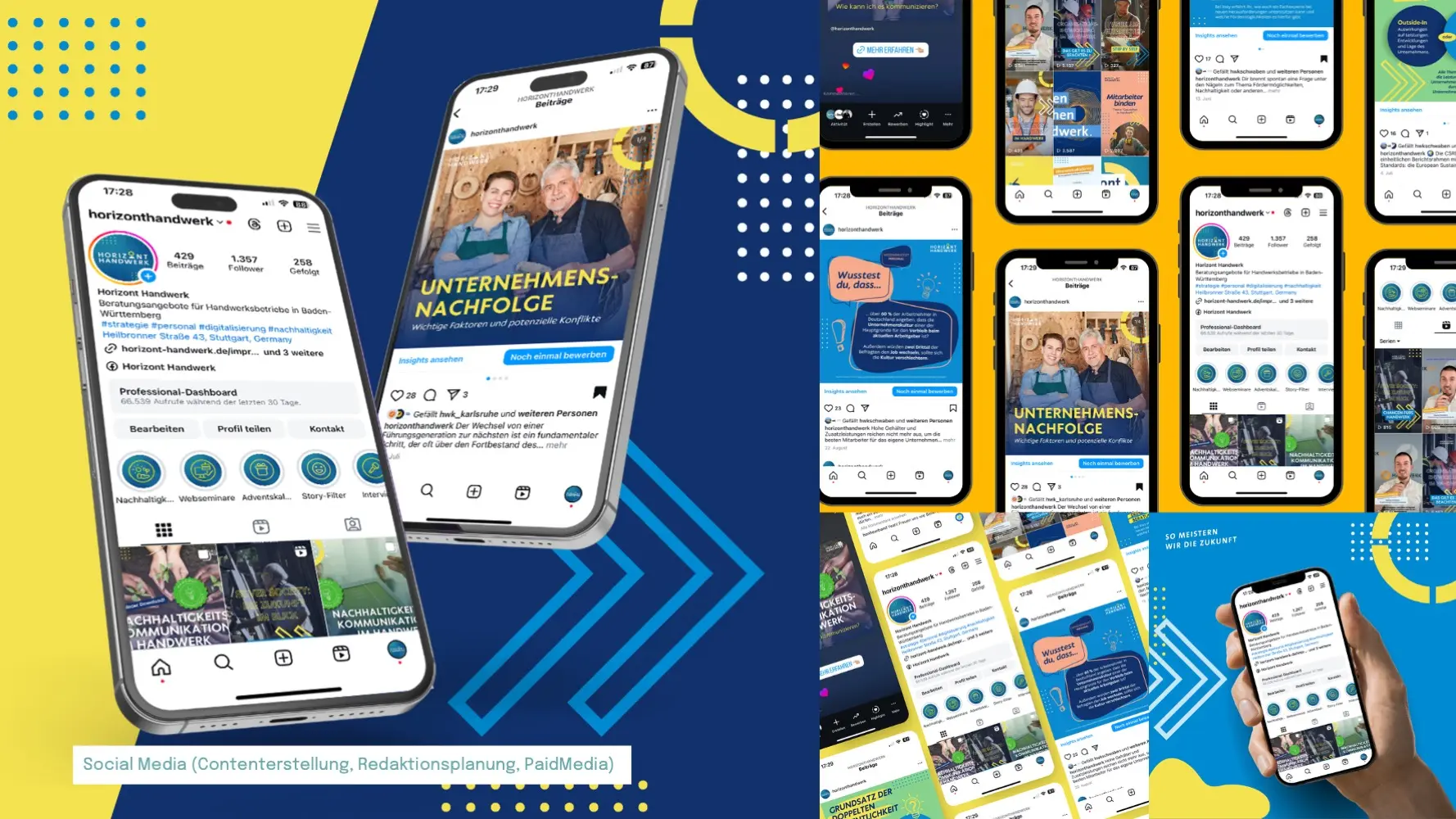 Die Initiative Horizont Handwerk unterstützt Handwerksbetriebe in Baden-Württemberg bei Zukunftsfragen. Schwerpunkte sind Personal, Digitalisierung, Strategie & Transformation sowie Nachhaltigkeit. Die Angebote reichen von Beratung, Workshops und Austauschgruppen bis hin zu Publikationen. So können Betriebe aller Gewerke im Handwerk kommende Herausforderungen meistern. Wir begleiten seit mehr als 5 Jahren die Kommunikation: von der Kommunikationsstrategie, Online-Redaktion, umfassenden Social-Media-Betreuung, Content-Produktion, Erfolgsmessung und Weiterentwicklung von Projekten wie Frauen im Handwerk, Klima-Ampel oder Ehrenamtsakademie.