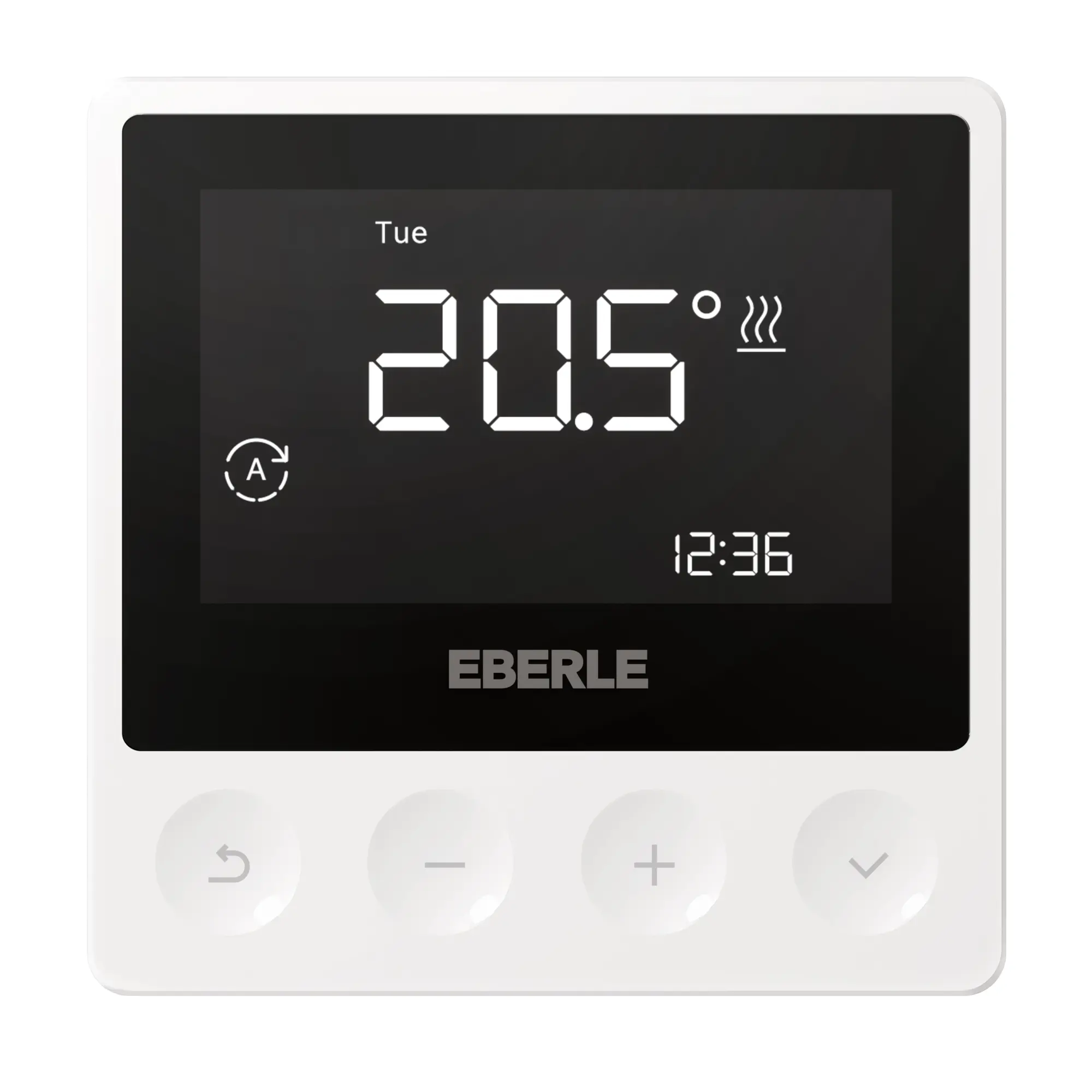 EBERLEs neuer Aufputz-Temperaturregler ATR 4000 überzeugt mit modernem Design, einfacher Installation und intuitiver Bedienung. Der digitale Aufputzregler hat durch seine geringe Aufbauhöhe von 21 mm, sein kompaktes Format 86x86 mm und die zeitlose Farbe eine hochwertige Optik. Das große, elegante Display mit Digitalanzeige lässt sich über ein intuitives Menü steuern. Der schwarze Hintergrund mit weißer Schrift ermöglicht das Ablesen des Displays auch im Dunklen. Der ATR 4000 ist in der Heizen/Kühlen-Variante (ATR 4500) und der Advanced-Variante (ATR 4800) erhältlich – beide Modelle erfüllen die EU Ecodesign Richtlinie LOT20.