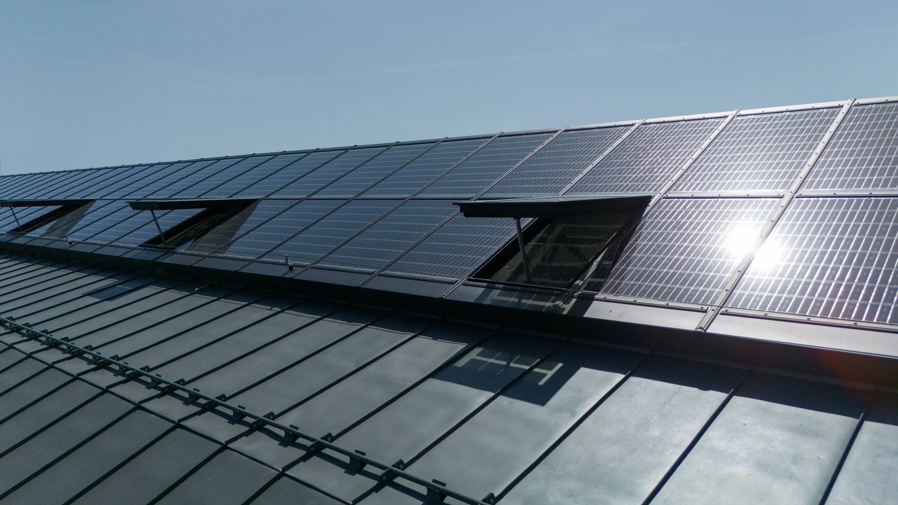Das LAMILUX Glasdach PR60 PV macht Energie sichtbar: bündig integrierte BIPV‑Gläser (gebäudeintegrierte Photovoltaik) erzeugen Strom, zeichnen einen grafischen Rhythmus aus Licht und Schatten und sorgen für wirksame Verschattung – ohne die architektonische Klarheit zu stören. Frei konfigurierbare Geometrien, variierbare Zelllayouts und Systemoffenheit ermöglichen maßgeschneiderte, denkmalverträgliche Lösungen im Neubau und in der Sanierung; optional mit Lüftungs-/Rauchabzugsflügeln. PR60 PV vereint Ästhetik, Effizienz und Zukunft – und verbessert die CO₂‑Bilanz.
