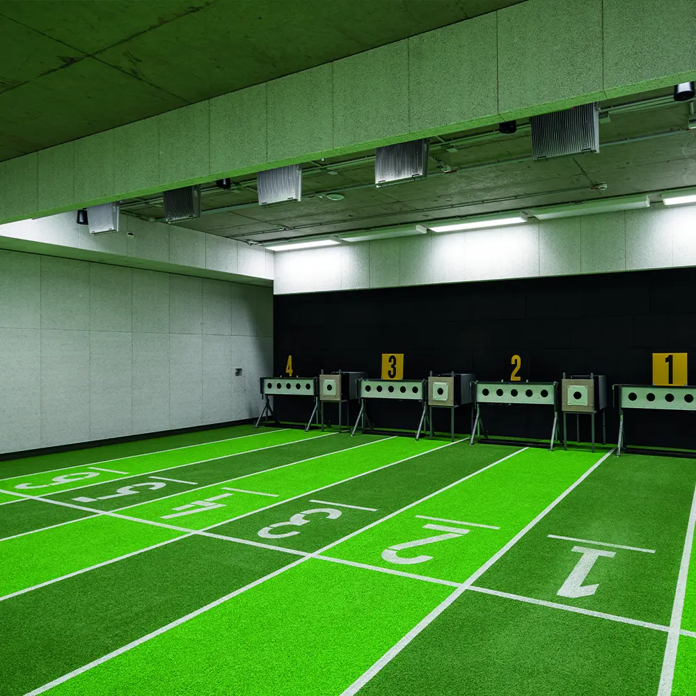 Im Leistungszentrum Altenberg entstand die weltweit erste schussfeste Laufbahn – realisiert mit dem nachhaltig zertifizierten REGUPOL champion AG System. Dieser Laufbahnbelag ist Cradle to Cradle Bronze-zertifiziert und verfügt über eine EPD. Die fugenlose, rutschfeste Oberfläche mit hochwertigem EPD-Granulat sorgt für gleichmäßigen Kraftabbau, hohe Langlebigkeit und ist effizient verlegbar. In Kombination mit elastischem Sportboden und Schießblöcken entsteht eine multifunktionale, sichere und langlebige Trainingsumgebung - exemplarisch für innovatives Sportstätten-Design mit Verantwortung.