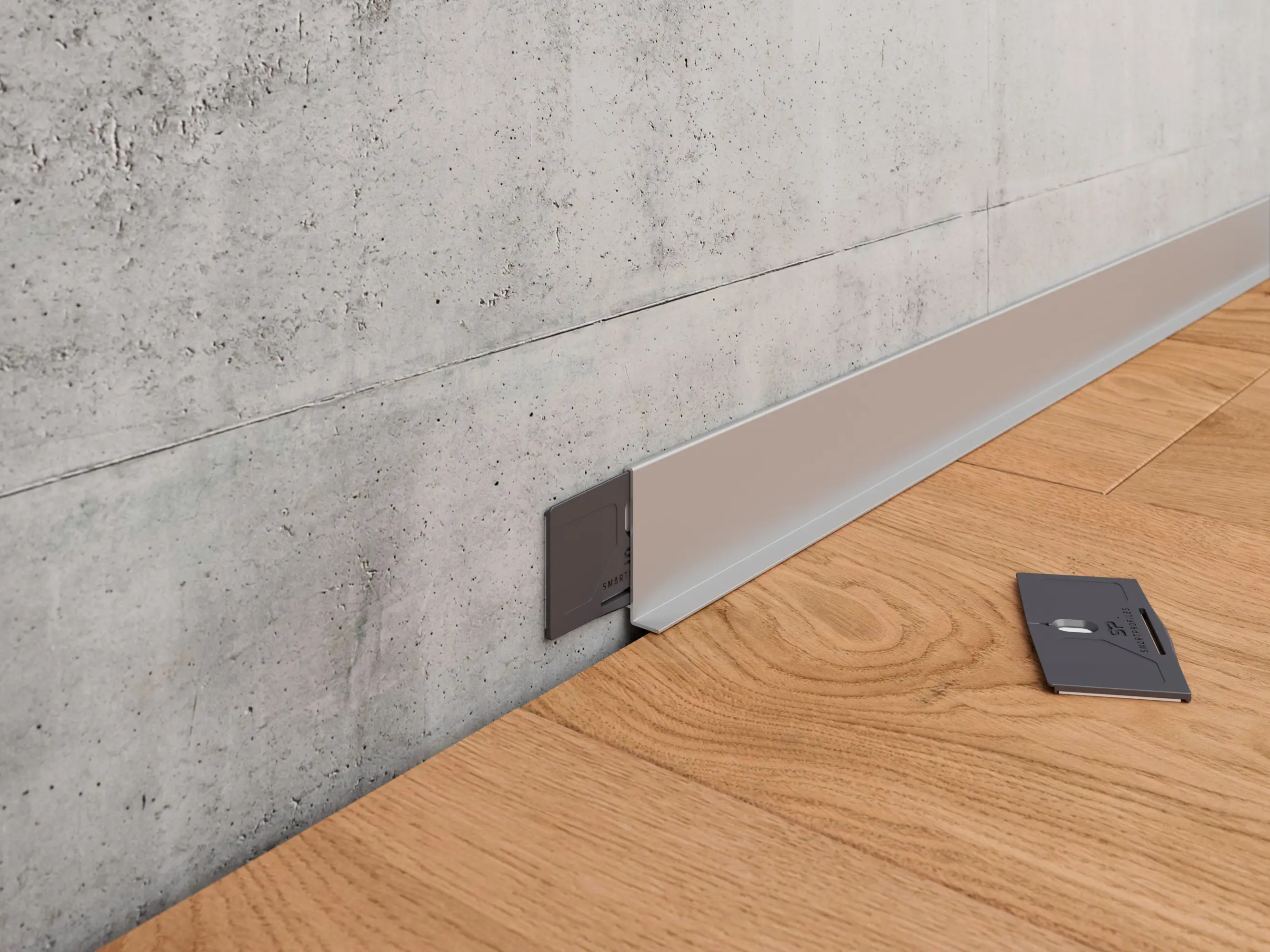 Das zum Patent angemeldete SP-SL50 Sockleisten-System ist mit nur 3 mm Aufbau die weltweit filigranste Sockelleiste mit Clips-Funktion. Die Montage erfolgt über einen smarten Montage-Clip, der an die Wand geklebt oder geschraubt wird – die Leiste wird dann eingehängt und aufgeclipst und lässt sich jederzeit wieder werkzeuglos entfernen. Hergestellt aus nahezu 100 % recyceltem Aluminium ist sie sehr flexibel, resistent und vollständig wiederverwertbar. Eckverbinder ersetzen Gehrungsschnitte, die speziellen Montage-Clips verhindern die Übertragung von Trittschall. Serienmäßig in 6 Oberflächen erhältlich, jede andere Oberfläche ind. möglich.