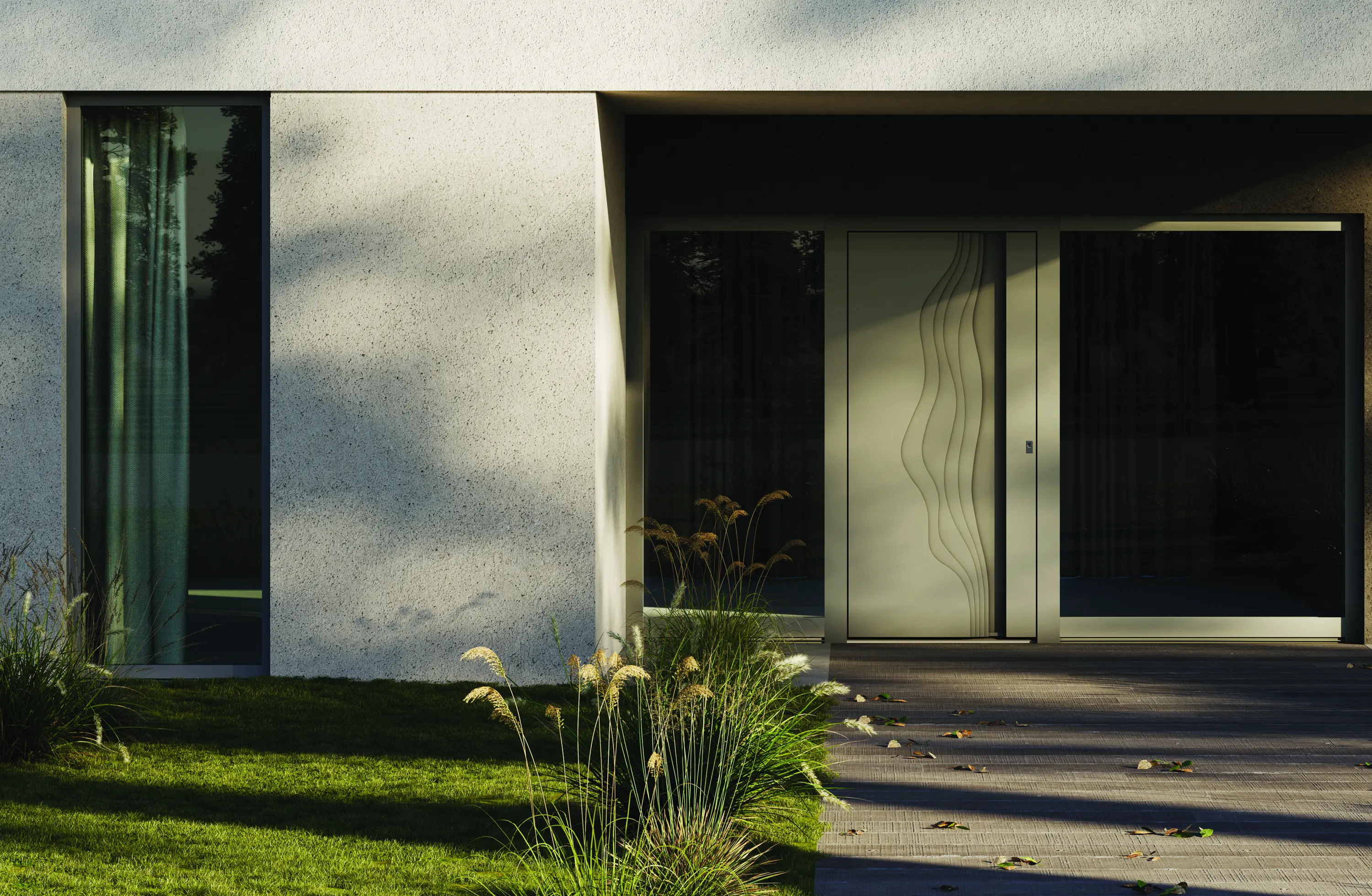 Terra ist eine Eingangstür, die das Konzept der Tür als dreidimensionales Objekt neu interpretiert. Ihr Design ist von den Isohypsen eines kartografischen Geländes inspiriert. Die Linien der Landkarte werden auf die vertikale Oberfläche übertragen und bilden jeweils die Konturen von aufeinander liegenden Aluminiumplatten. Diese Schichten treten allmählich zurück und geben den Blick auf einen tieferen Kern aus Aluminium, Stein oder ESG- Glas frei. Diese Tiefenwirkung macht einen traditionellen Griff hinfällig - der Griff wird zu einem integrierten Teil der Tür, der sich nahtlos an den Türrahmen anpasst.