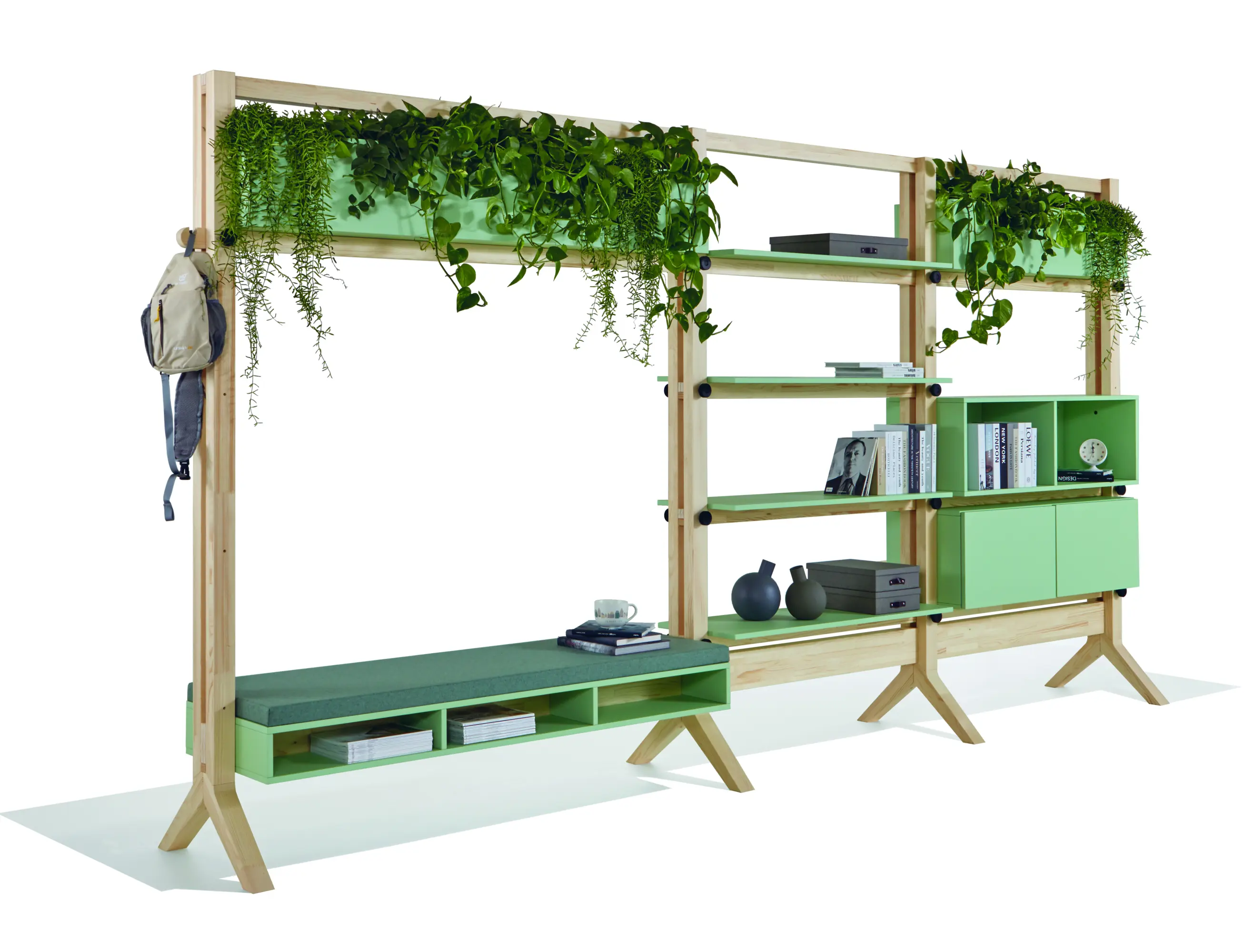Das Regalsystem HOCKEY ist ein Raumtrenner für moderne und offene Arbeitsumgebungen. HOCKEY besticht durch die einzigartige Verbindung aus Design, Funktionalität und Nachhaltigkeit. Die skulpturale warme Anmutung der Holzbauweise ist neben den multifunktionalen Anwendungsmöglichkeiten die Kernidee hinter dem Design. Die Stützen und Zargen sind aus Leimbindern in heimischem Fichtenholz gefertigt. HOCKEY ist modular, lässt sich flexibel kombinieren und jederzeit wieder umbauen. Das Sortiment umfasst neben Regalelementen und Lockers auch Sitzmodule mit Magazinfächern, Pflanzkästen, Pinnwände und Whiteboards.