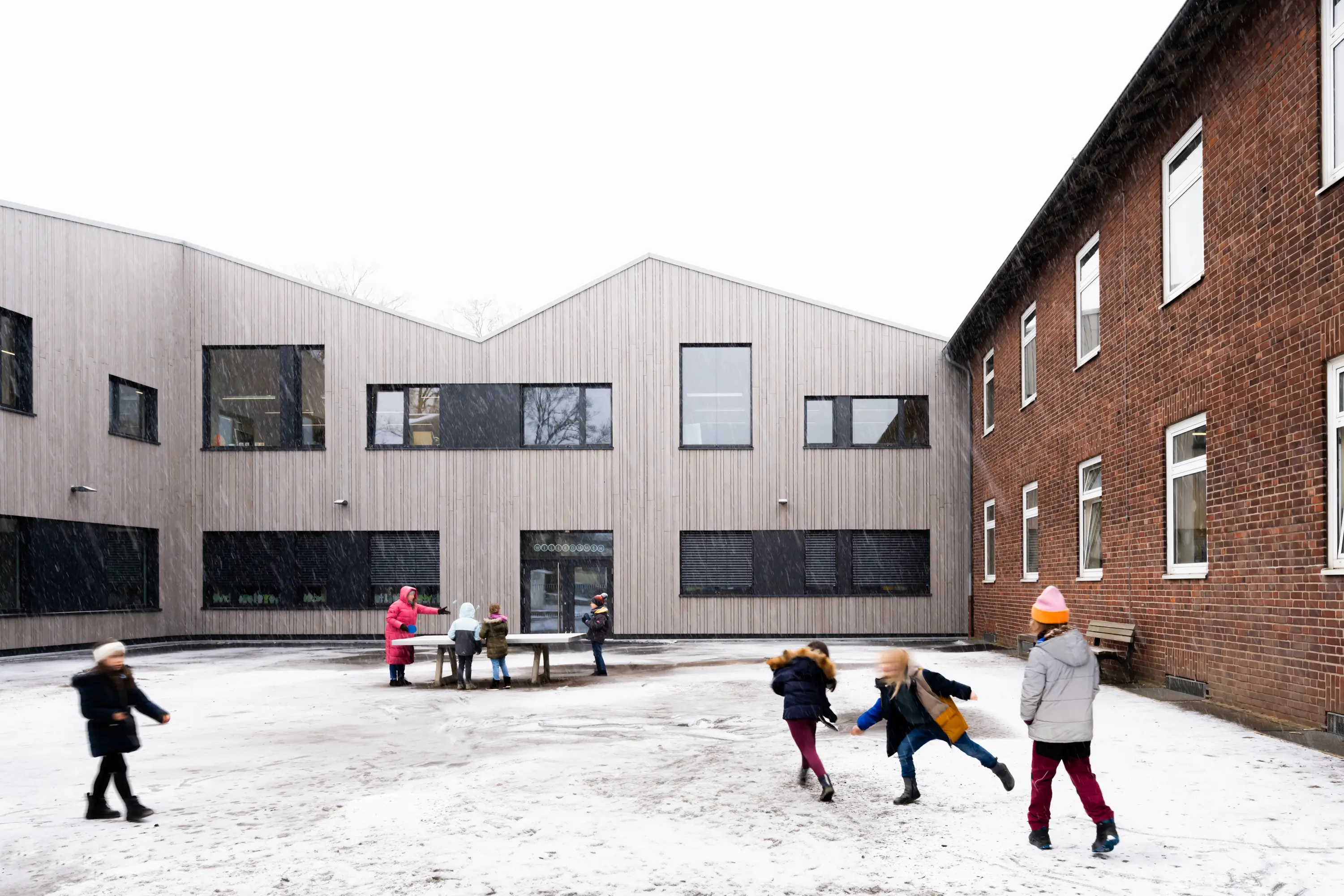 Es galt zwei in die Jahre gekommene Bestandsgebäude aus den fünfziger Jahren zu sanieren und durch mehrere Neubauten zu einem gesamtheitlichen Ensemble zu verbinden. Das neu entstandene „Lerndorf“ mitten in der Stadt mit seinen vier Gebäuden schafft genau das. Der Holzneubau in Systembauweise vermittelt in seiner Gestaltung zwischen der Bestandsbebauung und dem Neubau, indem er die Satteldächer der Nachkriegsmoderne weiterbaut und in eine Landschaft aus geneigten Dachflächen überführt. Die bauliche Lösung von Sehw schafft eine hohe Raumqualität und zudem sozialen Mehrwert durch an die moderne Pädagogik angepasste informelle Lernbereiche.