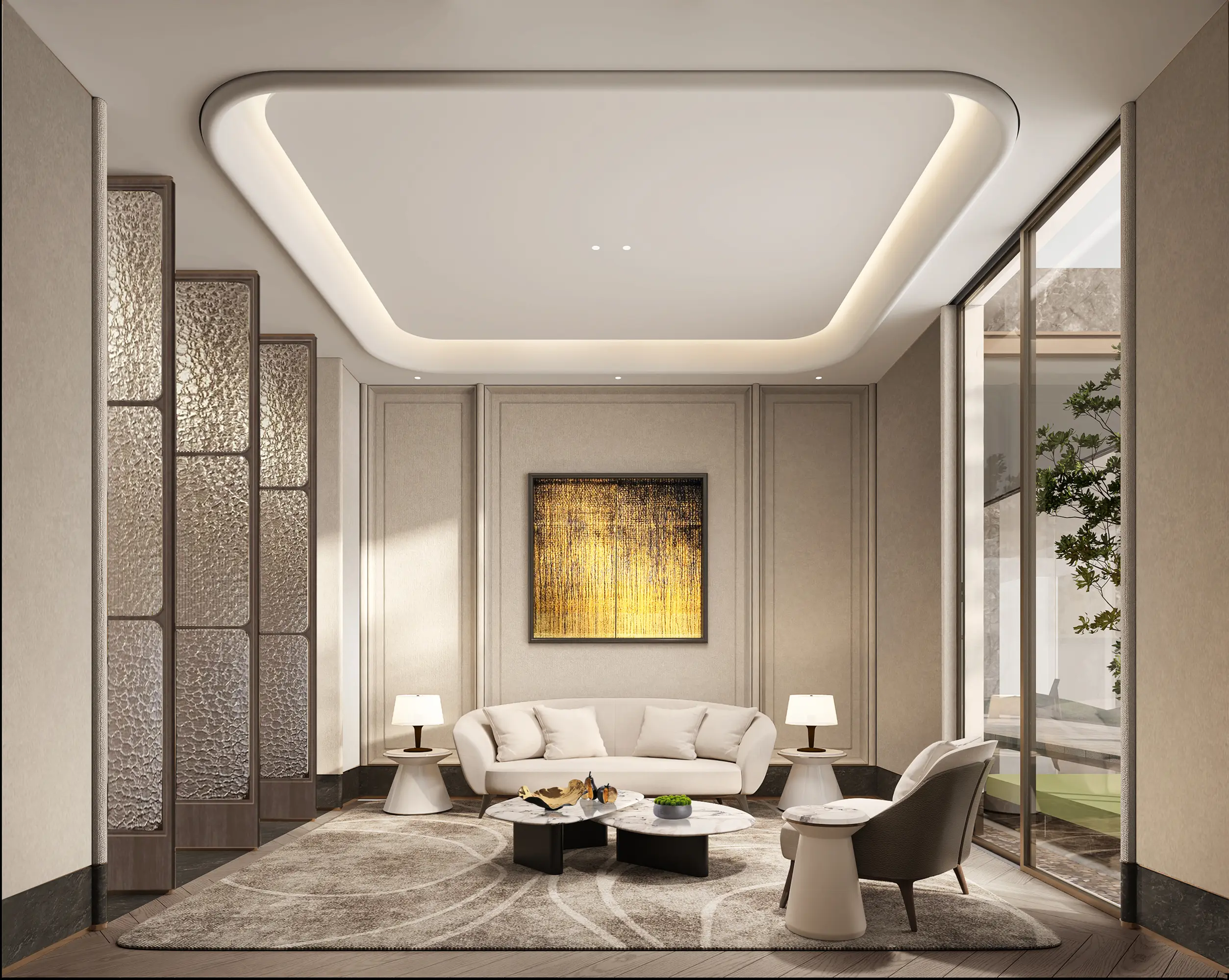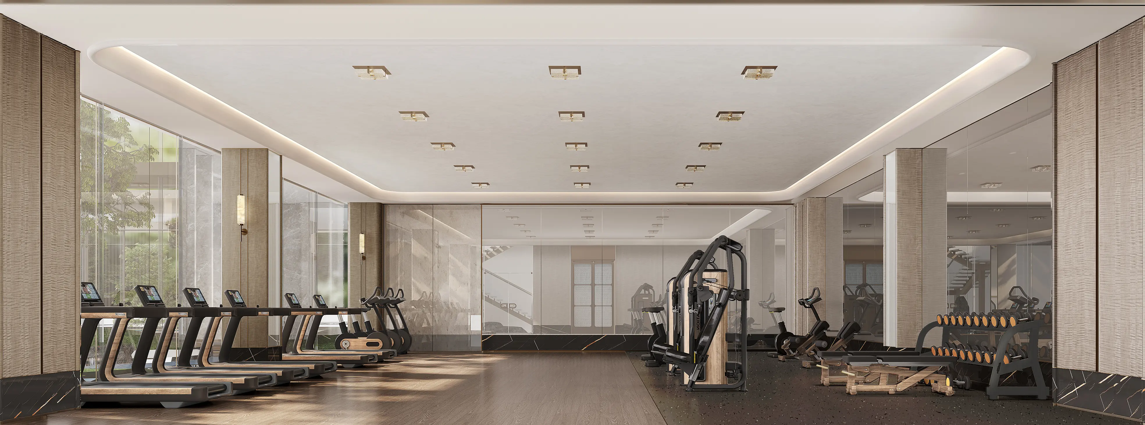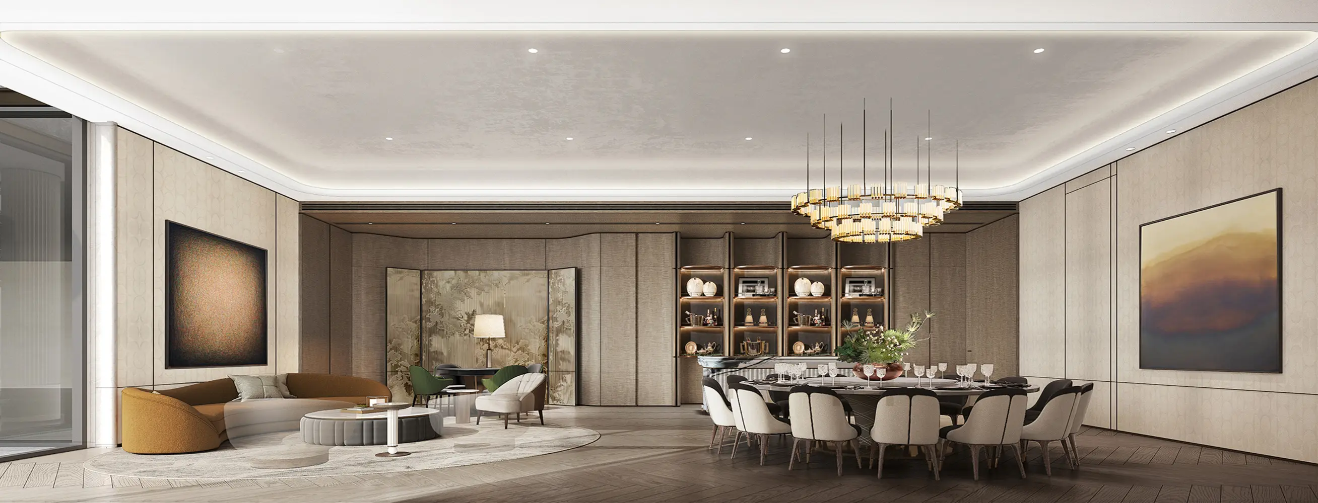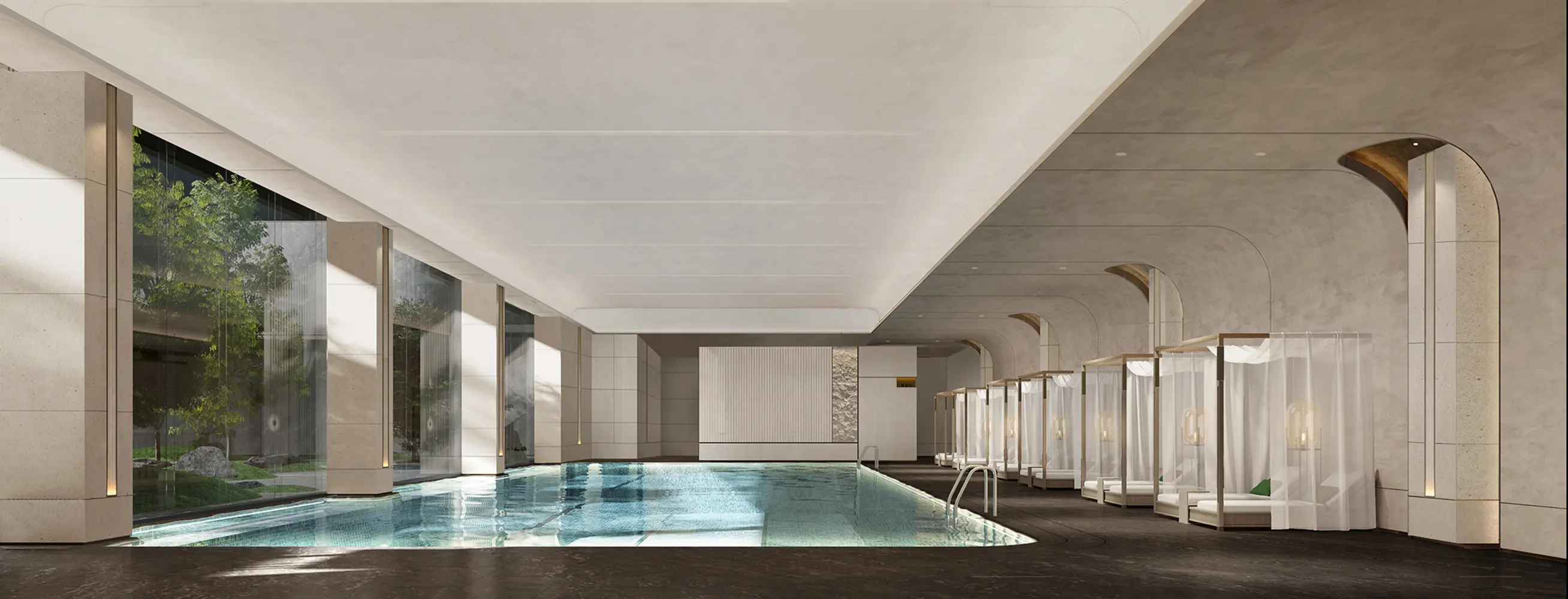 Huafa TIMES SEAL in Nanping, Zhuhai, mit fünf Wohntürmen. Die Verkaufsgalerie bietet Einblicke in zukünftiges Wohnen mit funktionalen, lebensnahen Räumen. Enthält Empfang, Verhandlungsbereiche, Pool, Fitness und SPA für ein rundum angenehmes Erlebnis. Das Design verbindet ost-westliche Ästhetik, modern und traditionell. Warme Innenräume schaffen wohnliche Atmosphäre. Pool und Fitnessbereich fördern Wellness und spiegeln einen gesunden, eleganten Lebensstil wider.