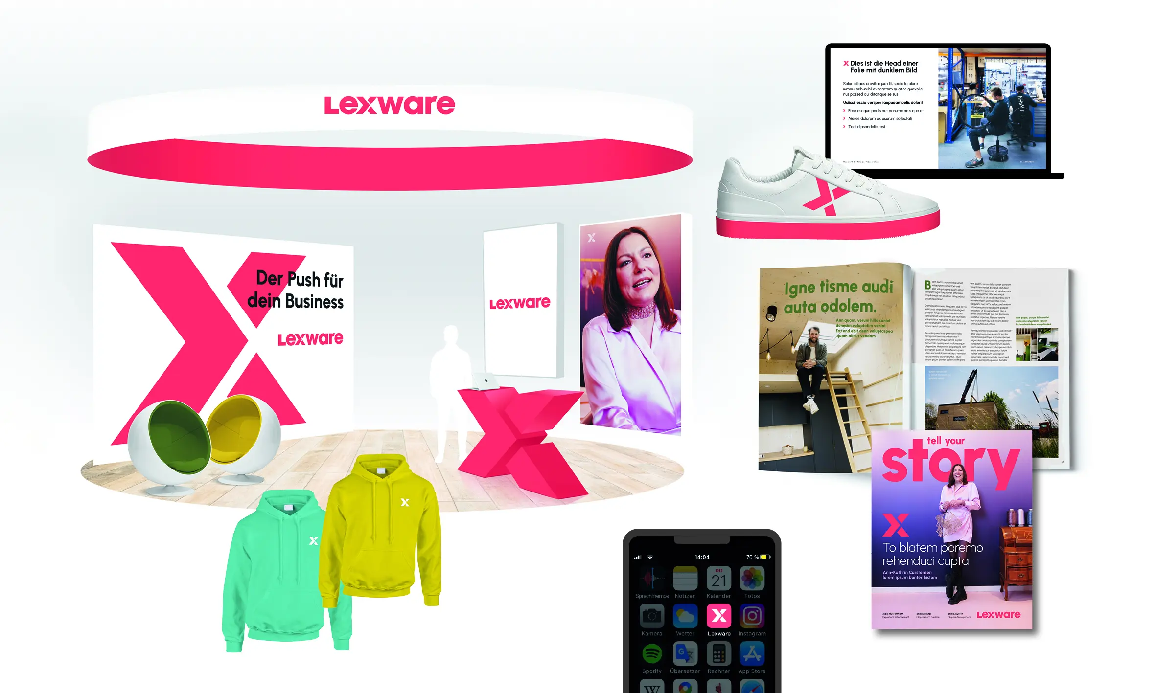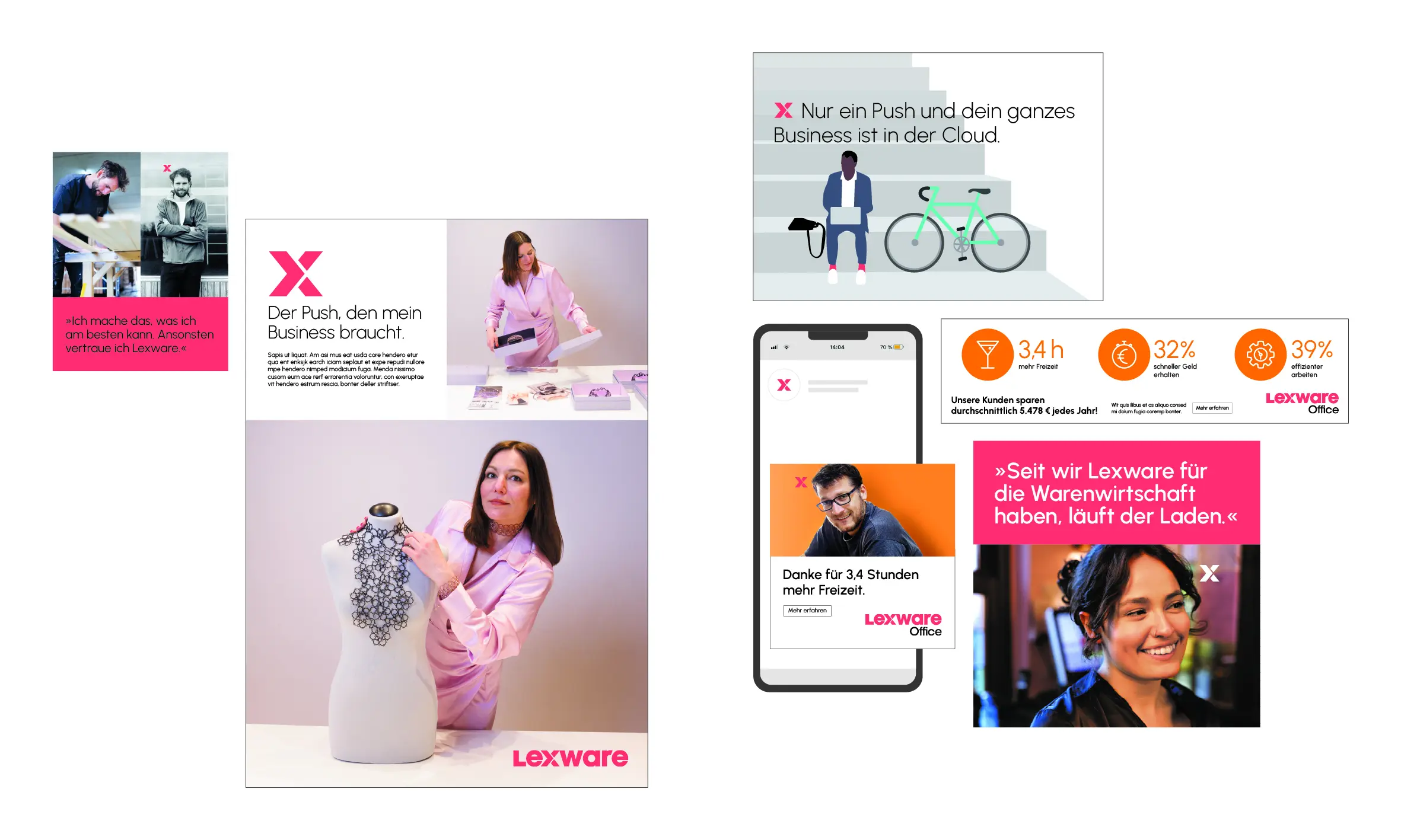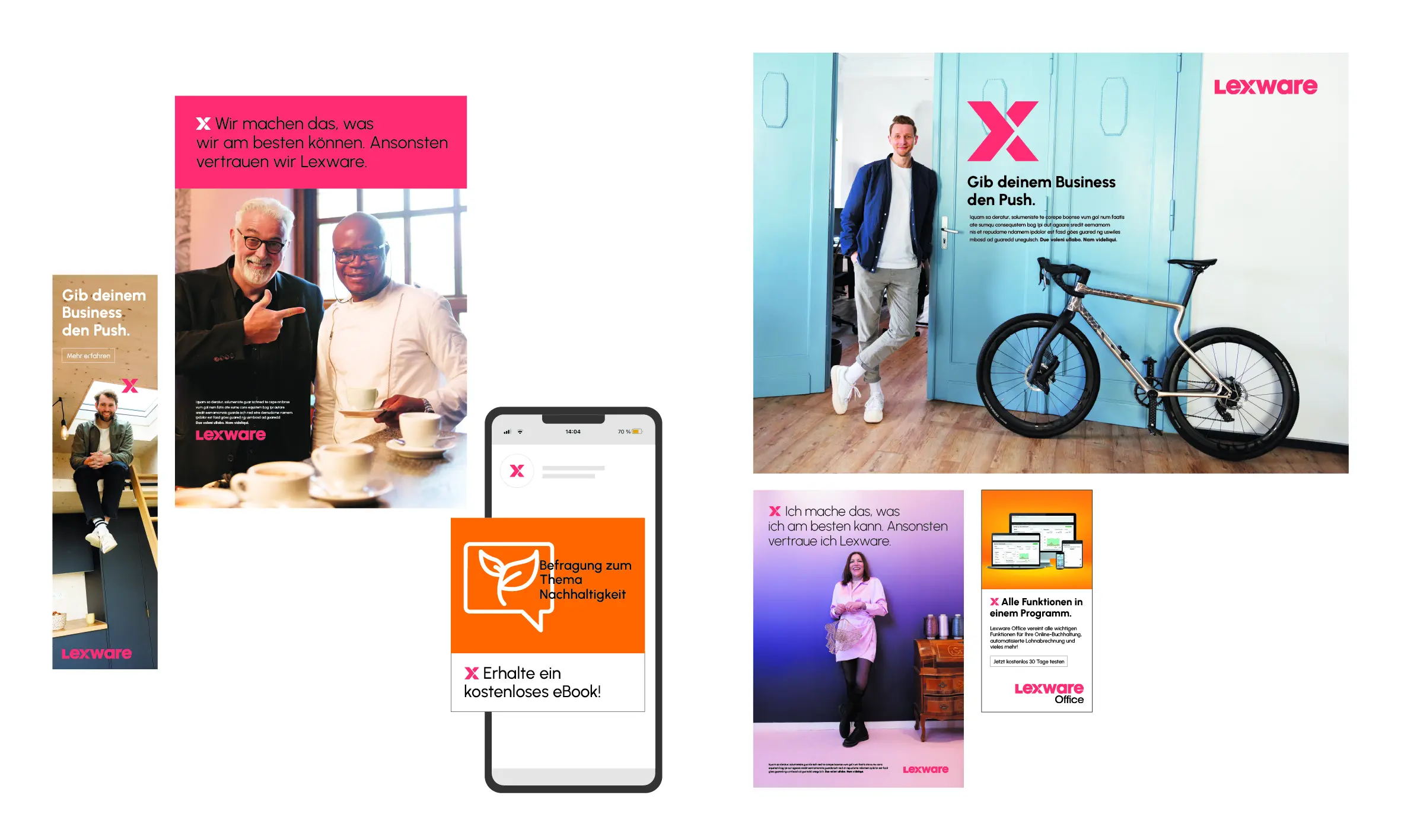 Lexware ist Deutschlands Marktführer für kaufmännische Software-Lösungen. Aufgabe war die Entwicklung eines neuen Markenauftritts von der Strategie über das Design bis zur Kommunikation. Die neue Botschaft lautet: „Lexware macht es dir einfacher erfolg-reich zu sein. Lexware gibt deinem Business den Push“. Diesen „Push“ inszenieren wir auch gestalterisch: im neuen Markenzeichen und als eigenständiges Brand Signal in der Kommunikation. Mit einem Minimum an Regeln erzeugt das neue Lexware Corporate Design zudem einen unverwechselbaren Markenauftritt, der alle Anforderungen der unterschiedlichsten Mediengattungen und Touchpoints erfüllt.