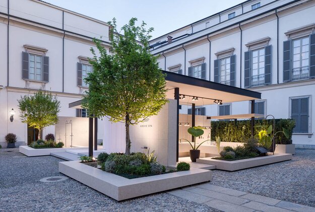 Basierend auf dem „Aquatecture“- Konzept – der Verschmelzung von Wasser und Architektur – enthüllte die GROHE SPA-Installation im Innenhof des Palazzo Reale vier Räume, die die Bedeutung und Wichtigkeit von Wasser in der Architektur sowie die Vorteile dieser Verbindung für Gesundheit und Wohlbefinden hervorhoben. Sie verschmolz auf durchdachte Weise Natur und Architektur, um immersive Räume zu schaffen, die die Essenz des GROHE SPA, „Salus per aquam“, widerspiegelten. Diese sorgfältig kuratierten Räume zollten gleichermaßen dem ehemaligen Garten Tribut und schufen darüber hinaus sinnliche Bereiche zum Nachdenken und Energie spenden.