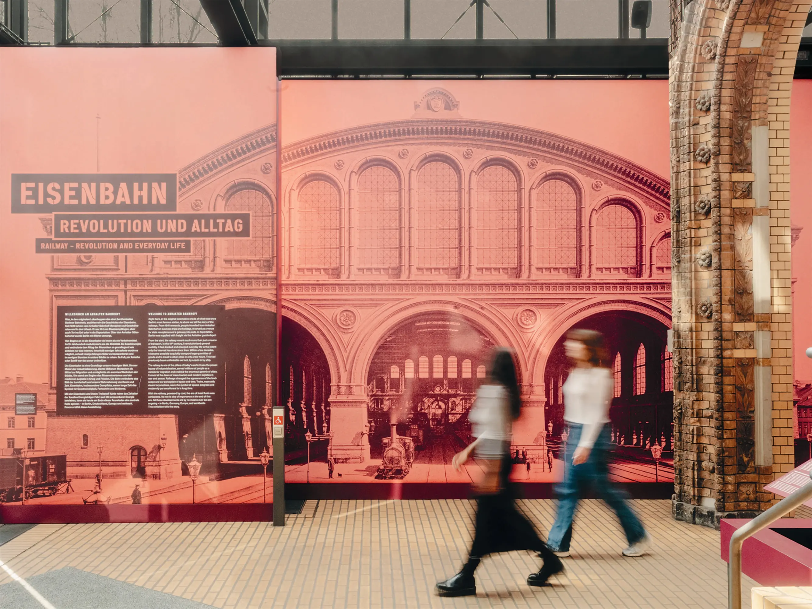 Die neue Dauerausstellung „Eisenbahn: Revolution und Alltag“ im Deutschen Technikmuseum Berlin zeigt auf 1.700 qm im historischen Lokschuppen die Entwicklung der Eisenbahn bis 1914. Sie thematisiert Innovationen und ordnet die Eisenbahngeschichte in kulturelle und politische Kontexte ein. Zugleich schlägt sie den Bogen zu heutigen Debatten um Nachhaltigkeit und Mobilität. Großformatbilder, mediale Inszenierungen und interaktive Stationen machen Geschichte lebendig; Exponatinseln strukturieren und vertiefen die thematische Vermittlung. So entsteht ein eindrucksvolles Ausstellungserlebnis, das jedes Jahr über 700.000 Besucher:innen begeistert.