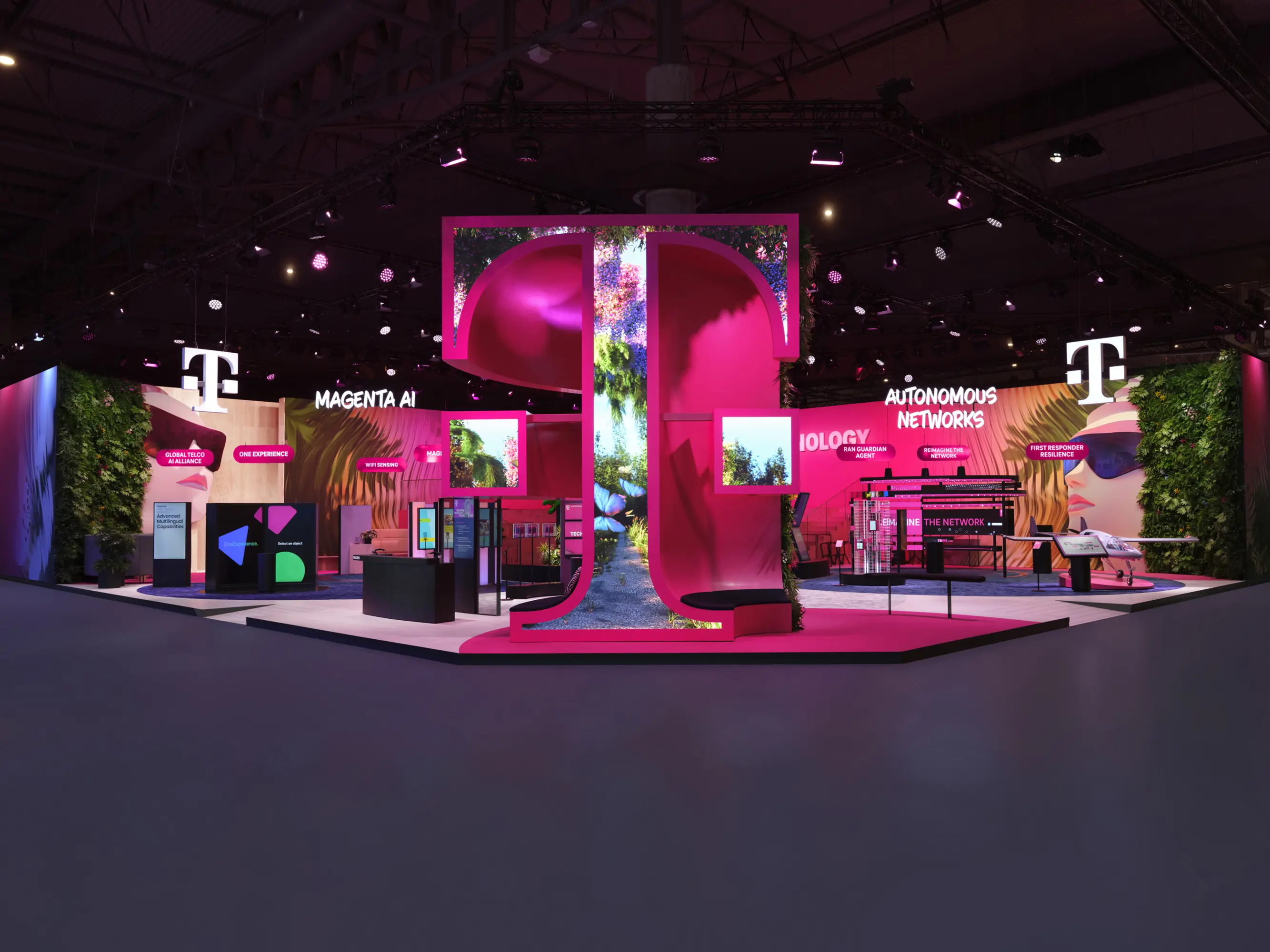 Mit dem Auftritt auf dem Mobile World Congress 2025 in Barcelona inszenierte die Deutsche Telekom unter dem Motto „Shaping Technology for All“ ein Markenerlebnis, das Menschen, Natur und KI verbindet. Eine ikonische 3D-T-Logo-Installation zog Besucher in eine offene, kreisförmige Architektur mit interaktiven Exponaten. Das lebendige Standdesign unterstrich die Rolle der Deutschen Telekom als Global Leading Digital Telco.