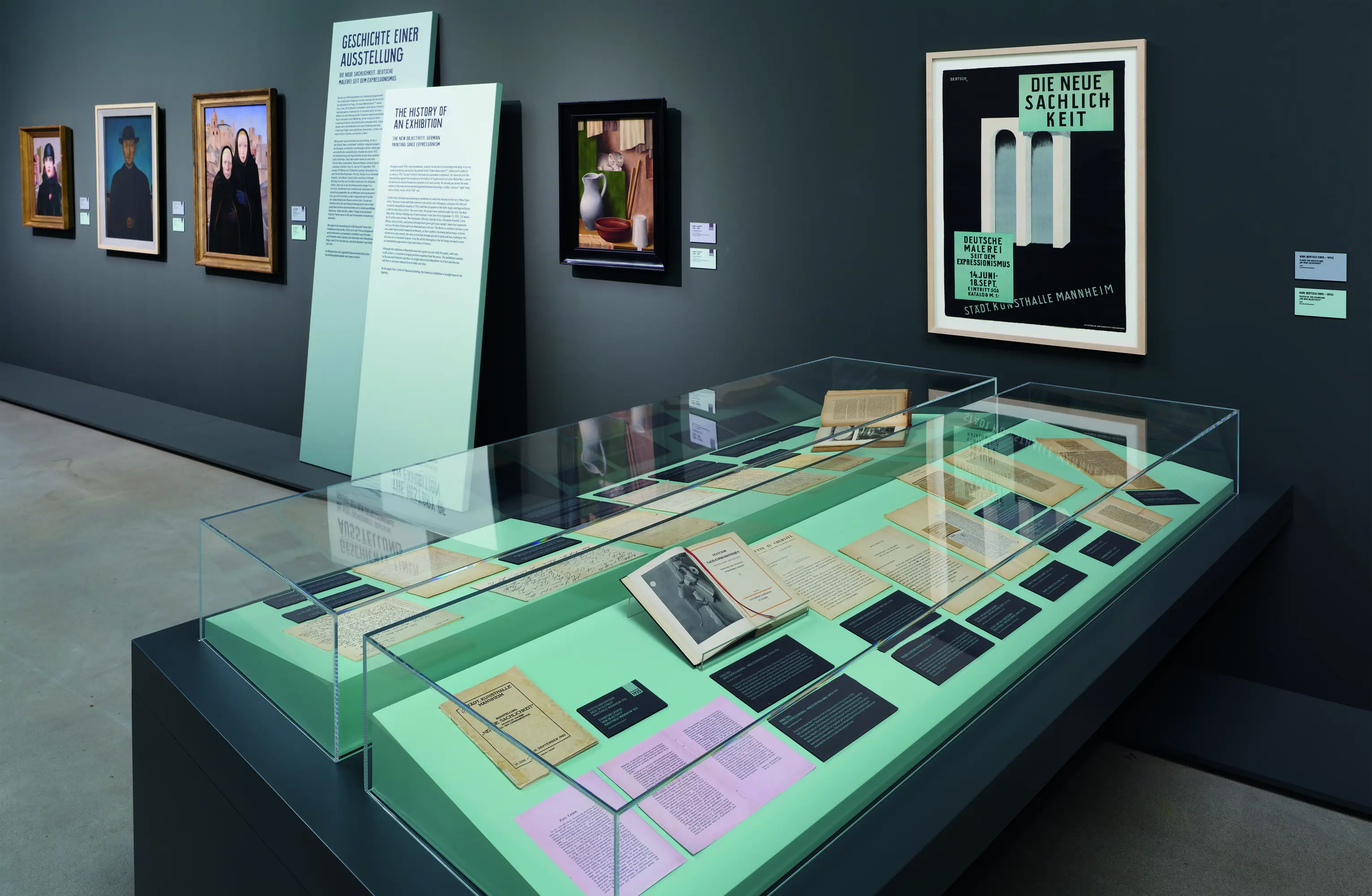 Die Szenografie versetzt Besucher ästhetisch in die Zeit der Neuen Sachlichkeit. Inspiriert von den asymmetrischen Perspektiven vieler Werke, sind auch raumgliedernde Elemente nicht rechtwinklig angeordnet; an die Wände gelehnte Keilrahmen mit Infotexten suggerieren Fragmenthaftigkeit und gliedern die Bildfolgen. Gezielte Farbakzente strukturieren die Räume. Ebenfalls wurde eigens eine Schrift auf Basis des Originalplakats von 1925 entwickelt. Video-Projektionen auf transluzenten Stoffbahnen schaffen traumhafte Rückblicke in die 1920er-Jahre. Ein Raum mit immersiven Animationen erweckt die verlorene Originalausstellung wieder zum Leben.