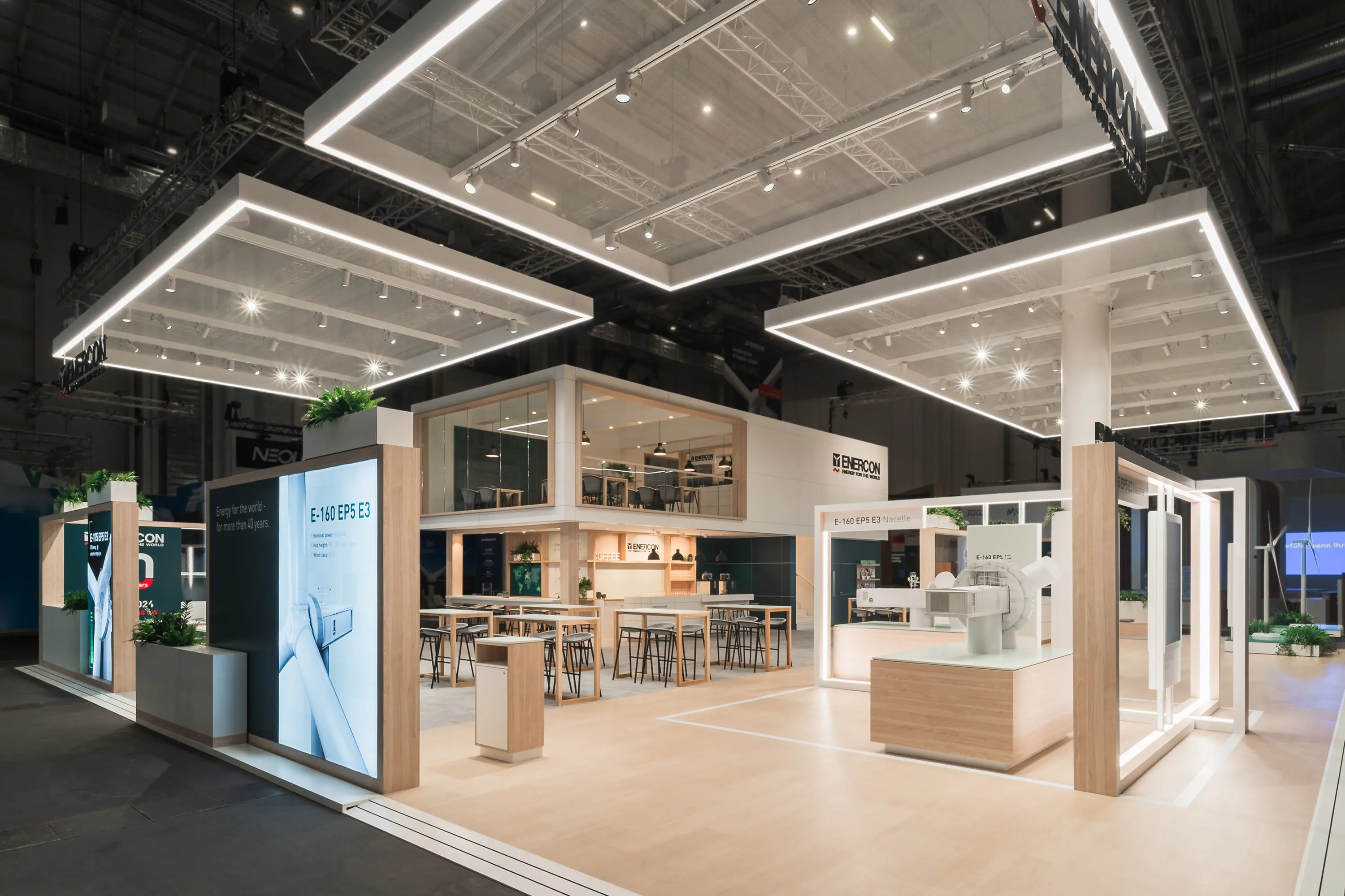 ENERCON präsentiert zur Wind Energy 2024 eine neue, nachhaltige Markenarchitektur. Inspiriert von der kompakten und effizienten Bauweise der neuen ENERCON Windenergieanlagen, kombiniert der zweigeschossige Stand Funktionalität mit natürlicher Wärme. Modular aufgebaut und für sechs Jahre nutzbar, ermöglicht das Konzept den Bau flexibler Standgrößen von 12 bis 500 qm. Ressourcenschonung, Wiederverwendbarkeit und zeitloses Design stehen im Fokus – ein klares Bekenntnis zu Nachhaltigkeit und Effizienz im Messebau.