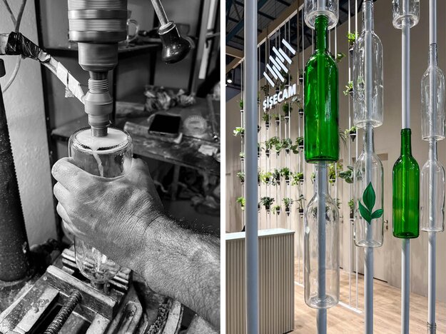 Das Engagement von Sisecam für eine nachhaltige Zukunft diente als Inspiration für unser Ausstellungsdesign. Wir begaben uns auf eine bemerkenswerte Reise und arbeiteten mit lokalen Glashandwerkern zusammen, die ihr Handwerk über Jahrhunderte verfeinert haben, um eine erstaunliche Fassade zu schaffen. Durch sorgfältiges Bohren von Flaschen mit Produktionsfehlern haben wir eine atemberaubende Präsentation geschaffen, die Tradition mit Innovation verbindet. Eine zusätzliche Ebene der Nachhaltigkeit wurde hinzugefügt, als einige dieser Flaschen mit Pflanzenillustrationen verziert waren, ein Beweis für die Verbindung von Kunst und Handwerkskunst.