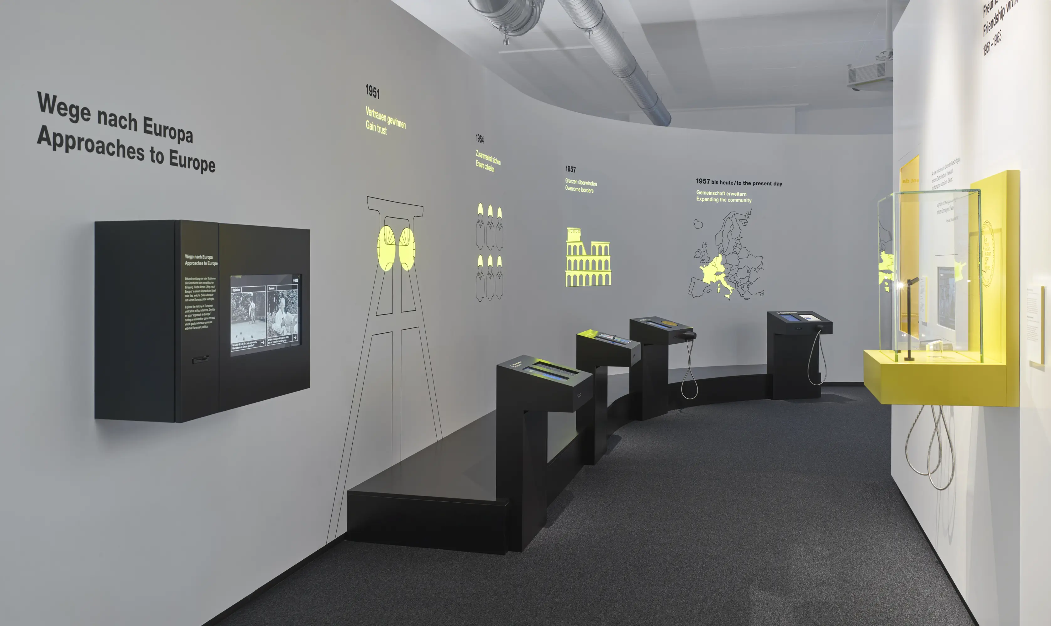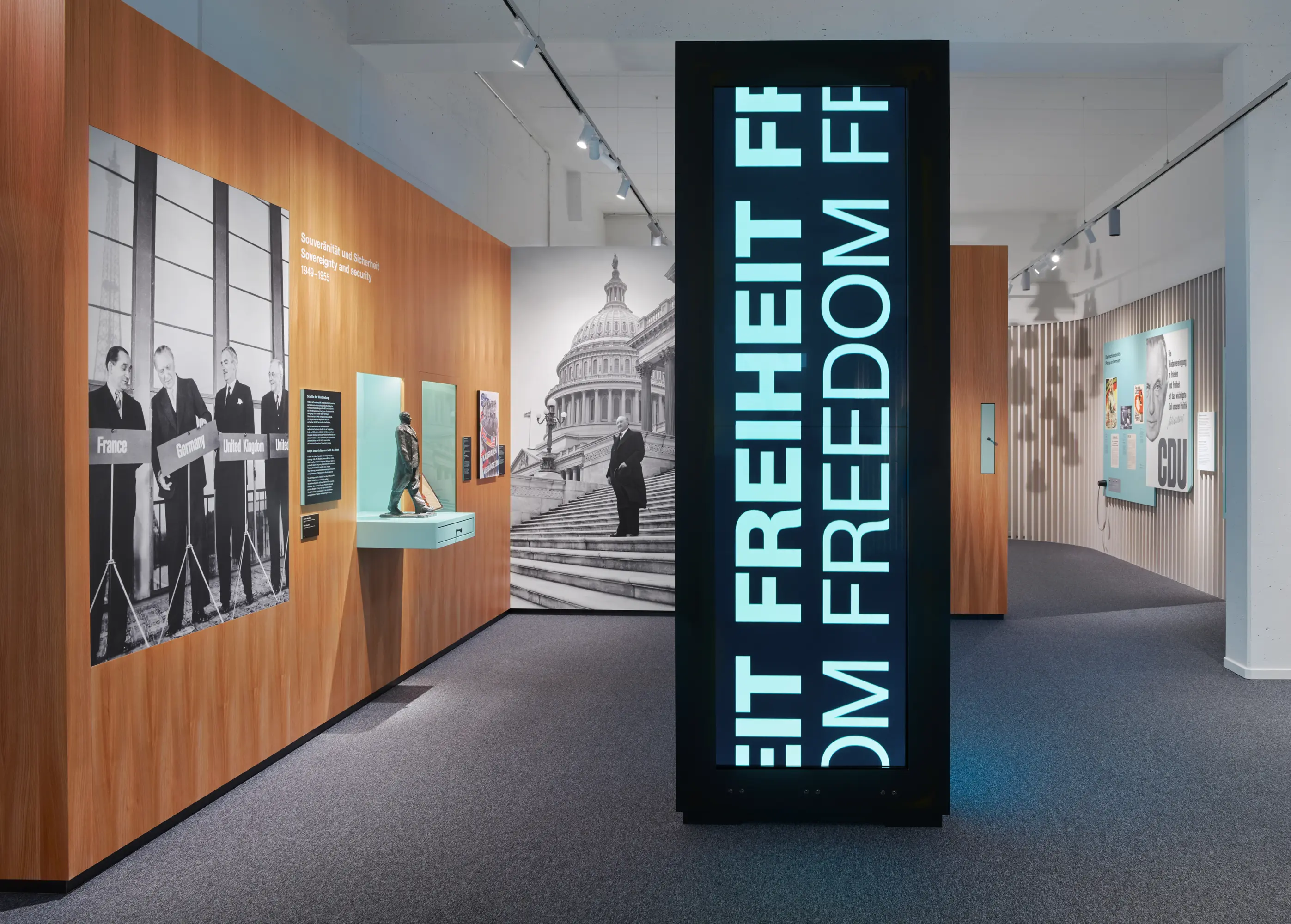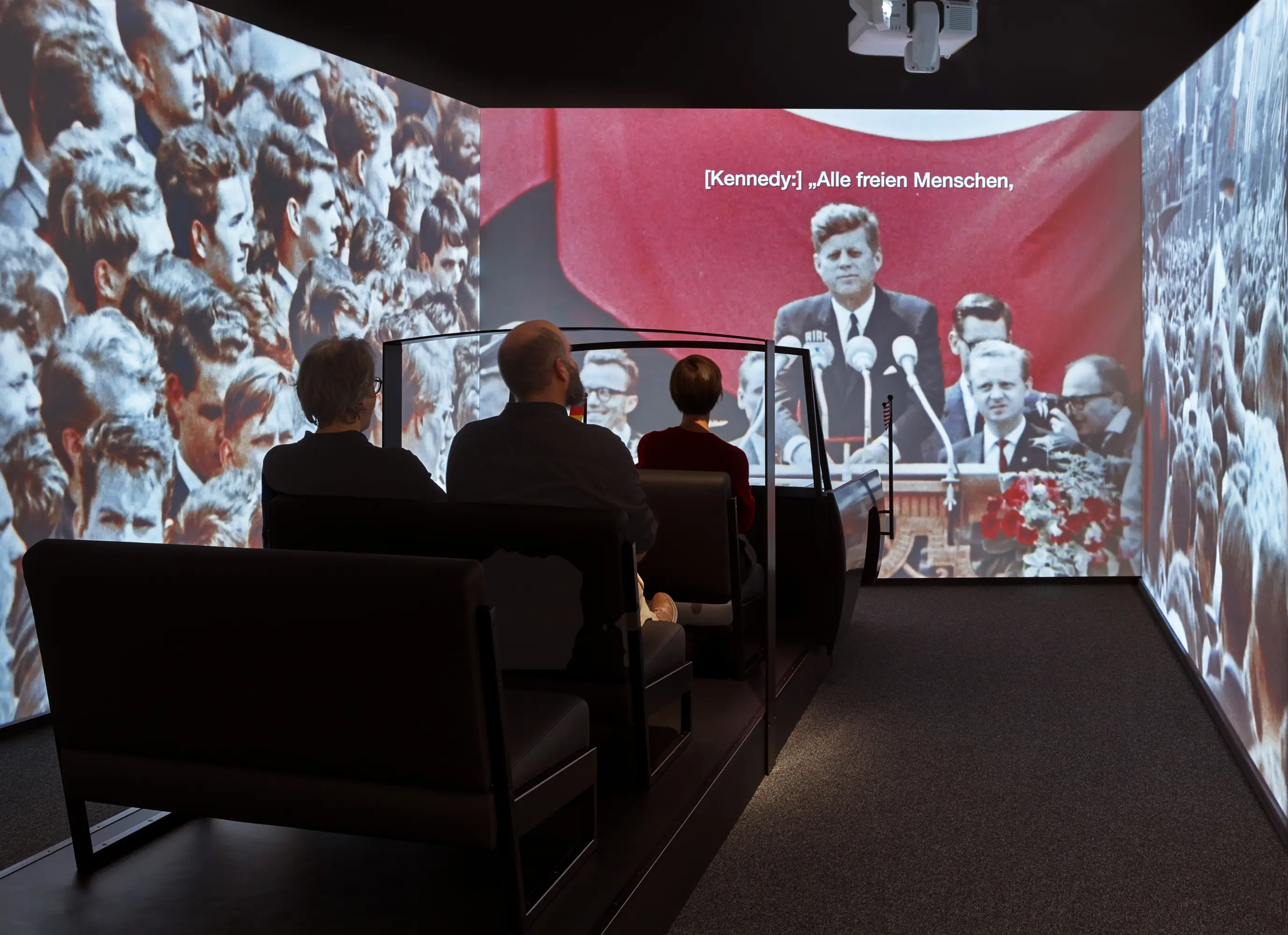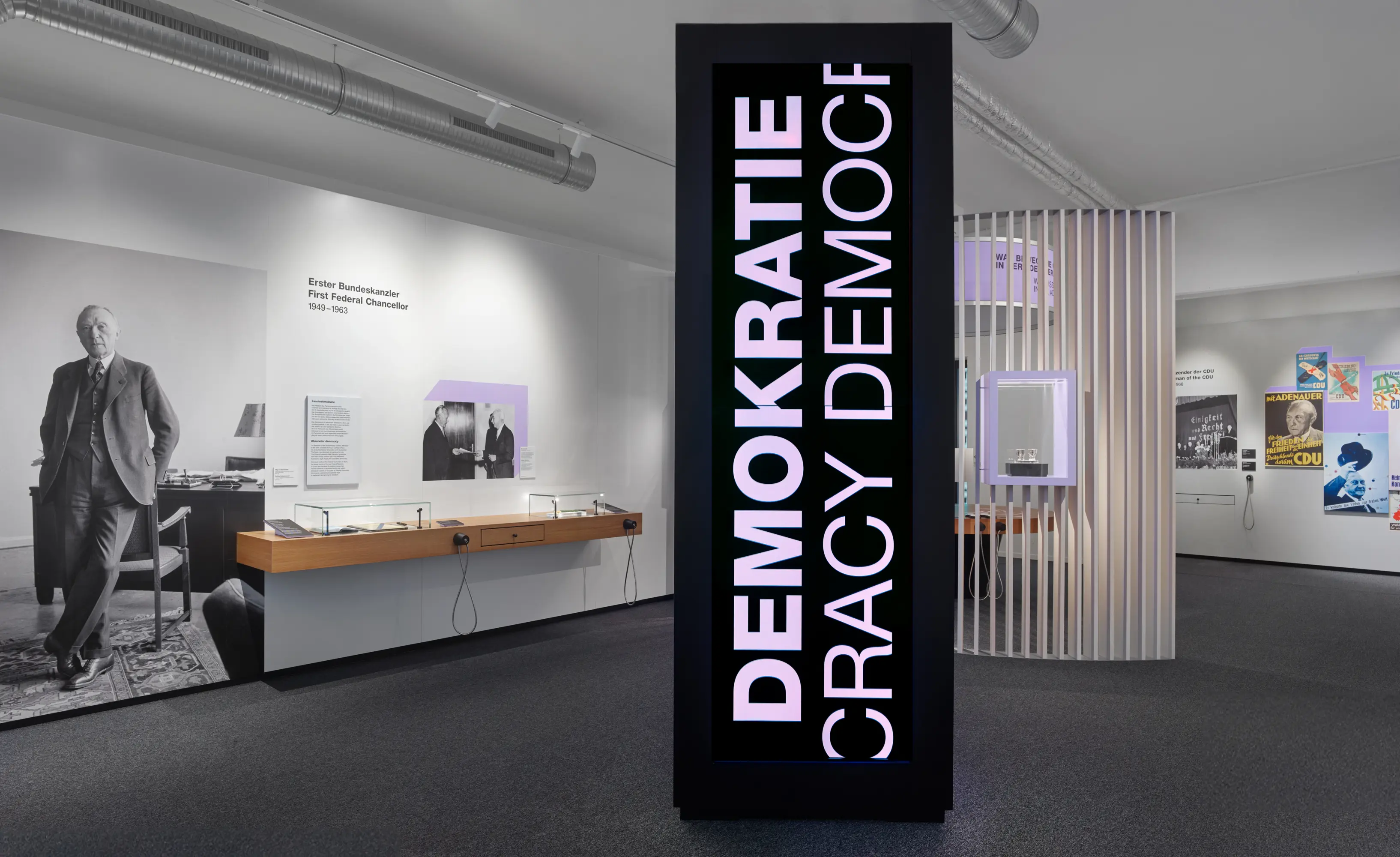 Die multimediale Ausstellung nimmt den demokratischen Neubeginn Westdeutschlands in den Blick, den Konrad Adenauer maßgeblich gestaltete – als erster Bundeskanzler der Bundesrepublik Deutschland von 1949 bis 1963. Auf über 400 qm vermitteln interaktive Medienstationen und faszinierende Objekte Einblicke in Adenauers Leben und die Bedeutung seiner Politik. In einer aufwändigen 360-Grad-Inszenierung fahren die Besuchenden mit Konrad Adenauer, Willy Brandt und John F. Kennedy durch Berlin und können so hautnah den Jubel der Bevölkerung beim legendären Besuch des US-Präsidenten 1963 erleben.