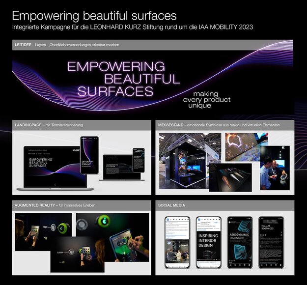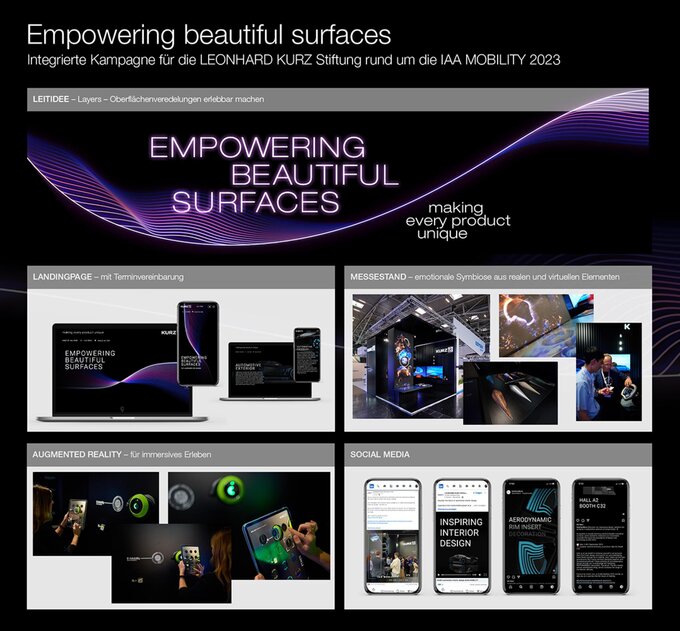 Empowering Beautiful Surfaces - so präsentierte sich LEONHARD KURZ, Spezialist für Dünnschichtdekoration, auf der IAA Mobility 2023 mit spektakulären Oberflächen für das Exterieur und Interieur von Fahrzeugen. Wir entwickelten die kreative Leitidee für den Auftritt – Landingpages, Social Media, digitales Marketing. Auf der Messe überzeugte die Kombination aus digitaler Inszenierung und realen Exponaten: Screens, LED-Tower, AR, Designstudien, die mit der virtuellen Animation verschmelzen.