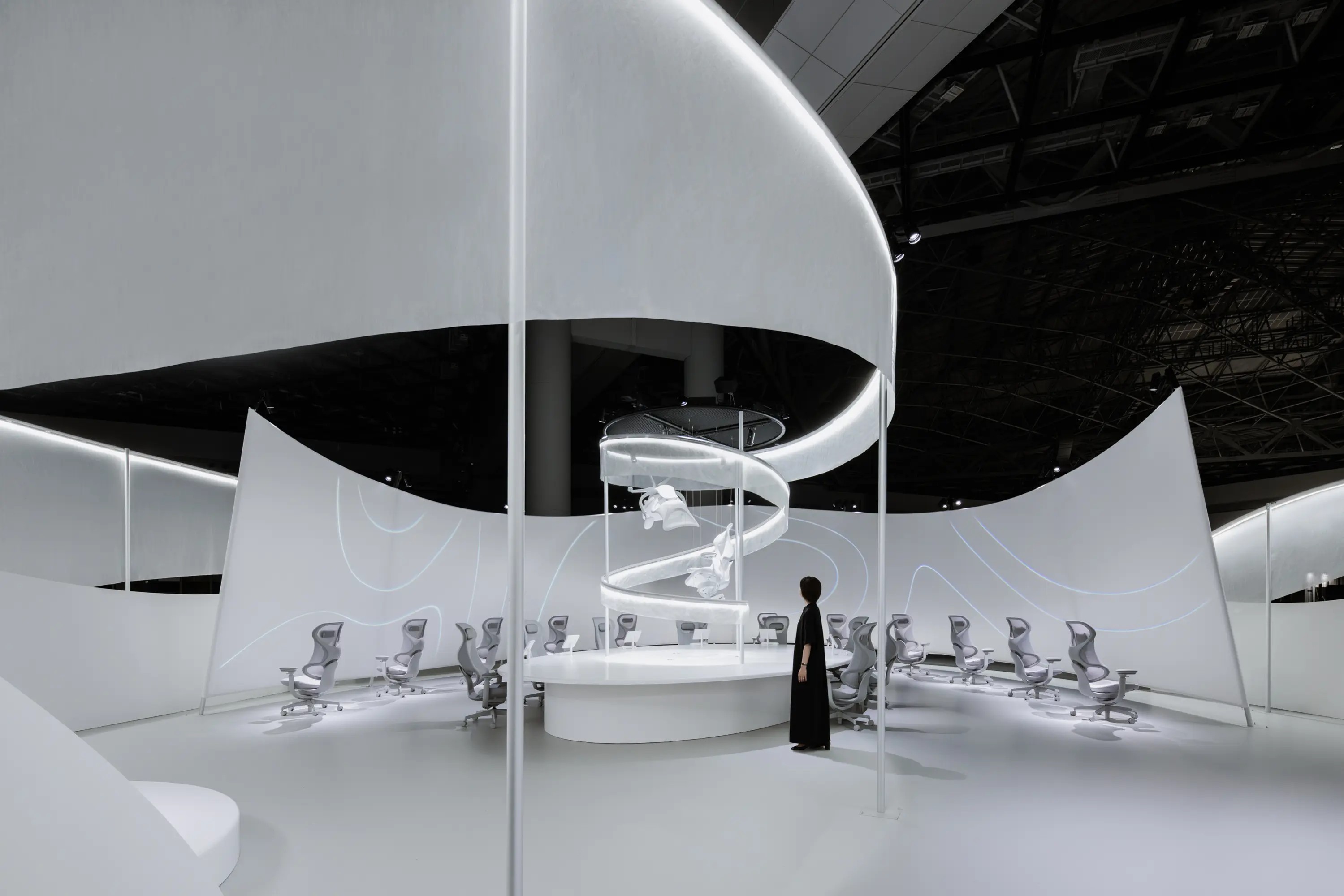 Dies ist der Messestand für „ingCloud“, einen Stuhl, der eher das Gefühl vermittelt, „umhüllt“ zu werden, als „zu sitzen“. Das Thema lautet „Wolken und Schleier“. Stofflagen mit unterschiedlicher Transparenz umhüllen den gesamten Stand sanft und schaffen ein immersives Erlebnis, bei dem der Stuhl und die Umgebung eins werden, verstärkt durch fantastische Lichteffekte. In der Mitte des Standes blicken die Besucher nach oben auf das Video „Cloudrium“ – inspiriert von Daten zur Körperdruckverteilung – und erleben auf natürliche Weise die charakteristische Liegeposition von ingCloud. Kommentare von Besuchern, die den Stuhl ausprobiert haben, schweben wie Wolken durch den Raum und regen die Fantasie der nächsten Gäste an.