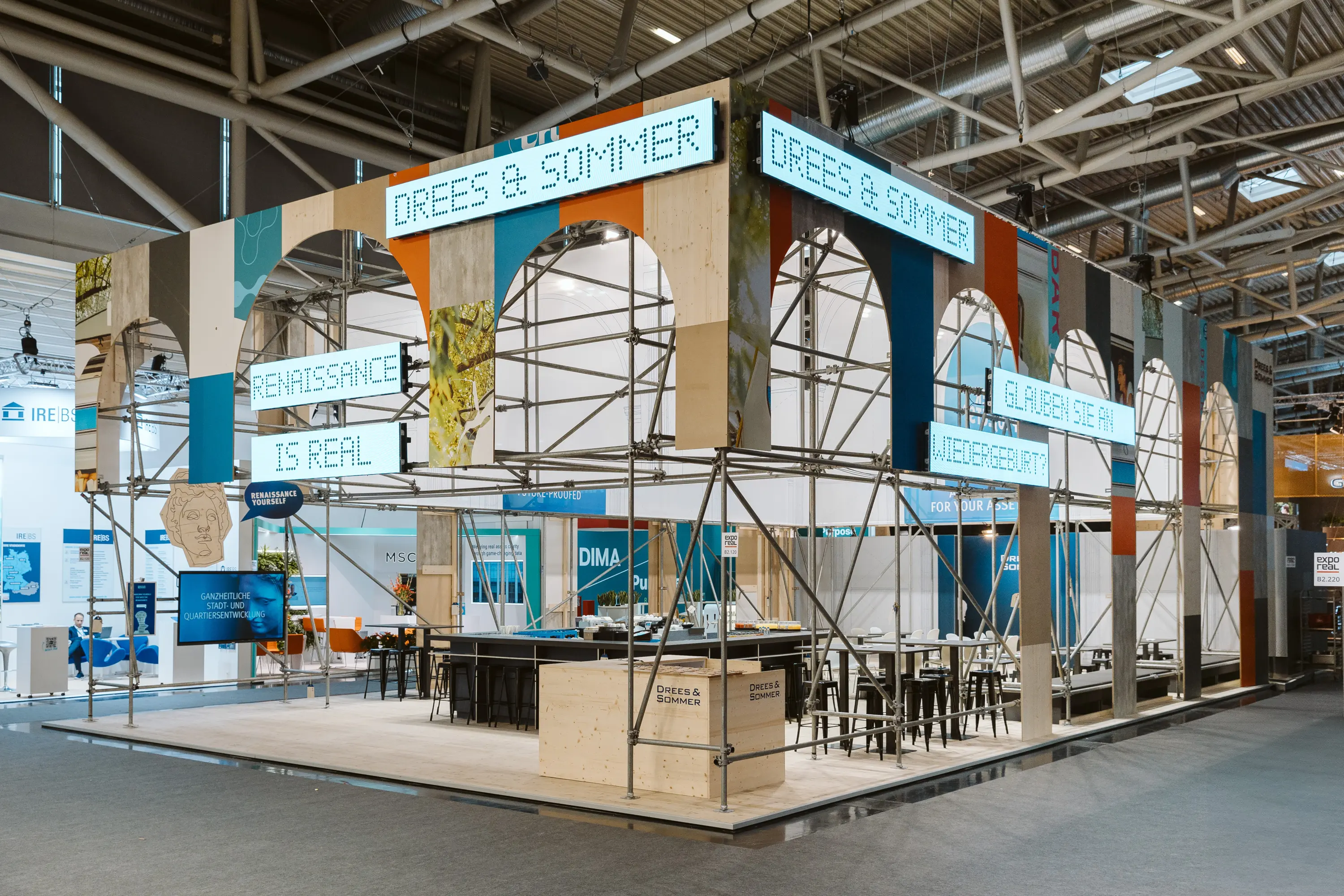 Unser kreislauffähiges Standkonzept steht unter dem Leitmotiv „Real Renaissance“ – konzeptionell verbinden wir uns damit mit einem goldenen Zeitalter der Vergangenheit. Denn warum sollte man sich nicht von etwas inspirieren lassen, das sich längst bewährt hat? Wir nutzen das Potenzial des Vorhandenen voll aus, um zukunftsweisende Lösungen zu schaffen. Der Messestand vermittelt ein neues Bild von Nachhaltigkeit und ist ein Beispiel für das Umdenken, das in der Bau- und Immobilienbranche notwendig ist. Nicht rückwärtsgewandt, sondern mit Fokus auf die Zukunft in Bezug auf Werte, Qualität, Ressourcen, Recyclingfähigkeit und Hightech-Know-how.
