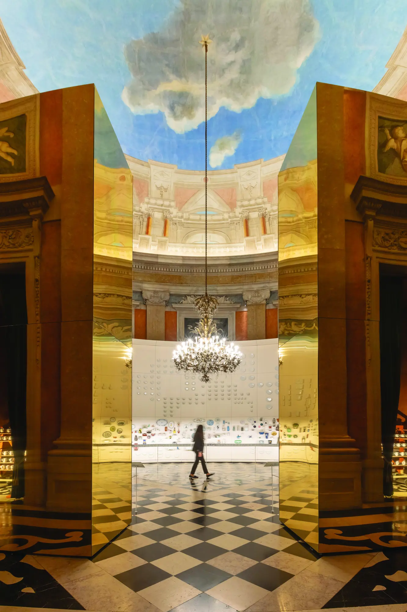 Die Ausstellung feiert 200 Jahre Vista Alegre Porzellan im Palácio Nacional da Ajuda. Eine 6 Meter hohe ovale Struktur aus goldenem, spiegelndem Alucobond steht im Kontrast zum historischen Ambiente. Im Inneren präsentiert ein weißer „Biskuit“-Hintergrund 400 Porzellanobjekte auf maßgefertigten Trägern. Der 360º-Rundgang zeigt zwei Jahrhunderte Design. Außen entdeckt man den Herstellungsprozess und eine Sichtachse zur Installation von Clare Twomey. Ein goldener Tisch in Form einer Unendlichkeitsschleife rundet die Ausstellung ab – ein Symbol für Markenidentität und Jubiläum.