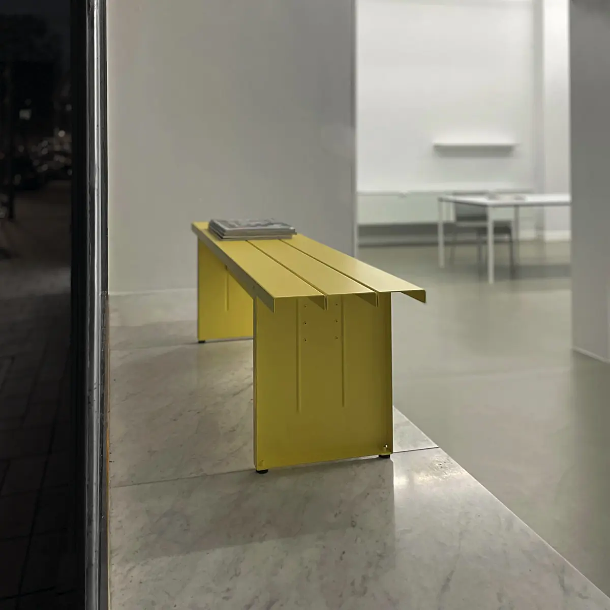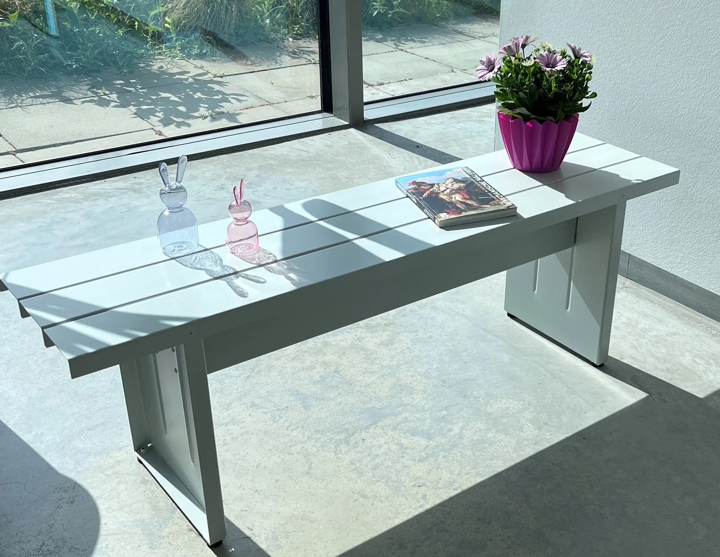 Durch das ruhige, unaufdringliche und ausgewogene Design passt Benchi in viele Umgebungen. Materialien: Benchi besteht aus Aluminium und ist somit ganz leicht. So lässt sie sich leicht dort einsetzen, wo sie gebraucht wird. Ihre Oberfläche ist robust, weil sie pulverbeschichtet ist: Lackiert in den Kollektionsfarben; Sonderfarben nach RAL möglich. Länge: 120 cm, Höhe 40 cm und Tiefe 30 cm.