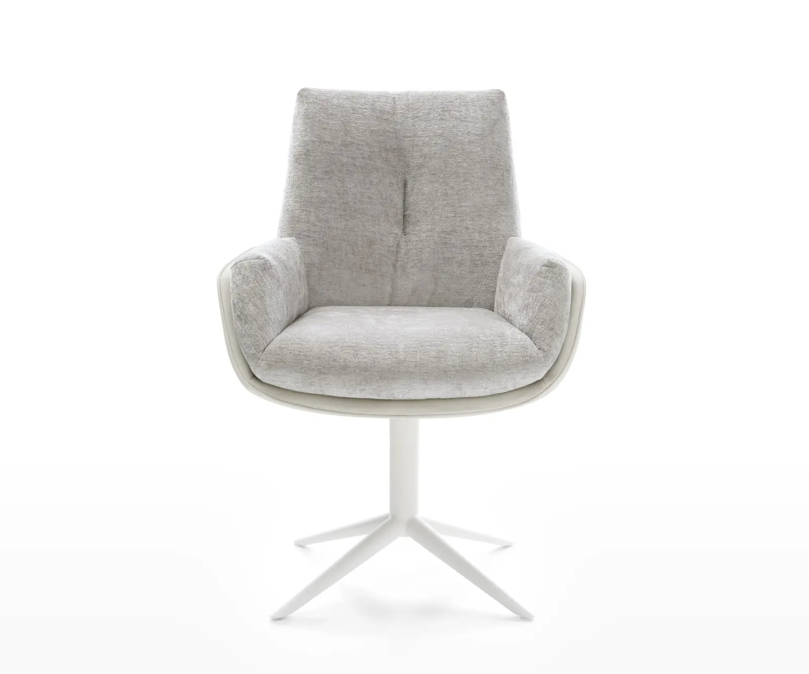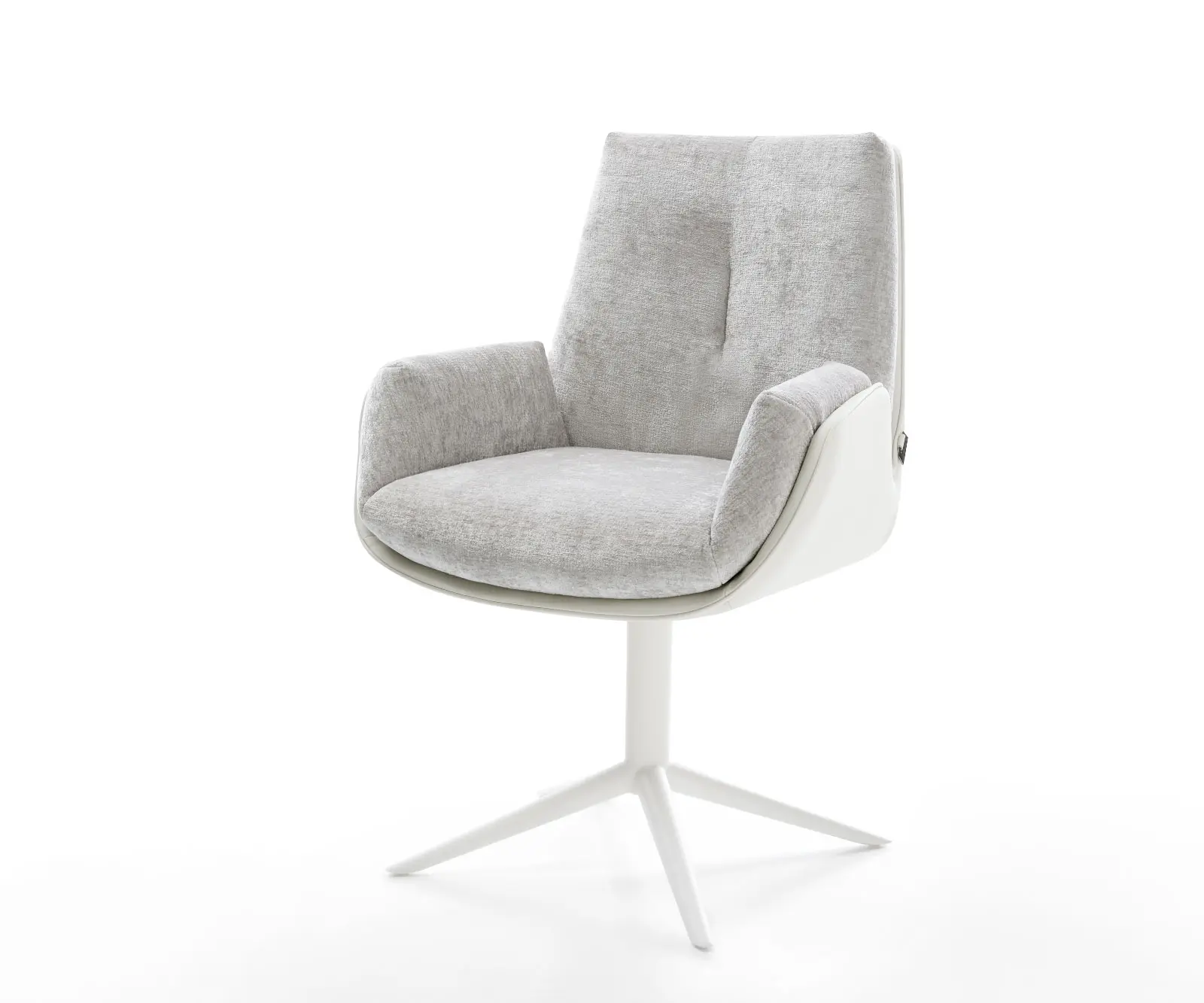 Clea steht für modernes Sitzdesign mit Fokus auf Komfort, Qualität und Ästhetik. Die großzügige Sitzfläche, der hohe Rücken und der mehrschichtige Polsteraufbau mit formstabilem Schaum bieten ein Sitzerlebnis auf Sesselniveau. Der Mix aus weichem Chenillestoff und edlem Echtleder verleiht dem Stuhl eine elegante, wohnliche Ausstrahlung. Das innovative Fußkreuz mit Wippfunktion reagiert sanft auf Bewegungen und fördert dynamisches Sitzen. Clea verbindet handwerkliche Präzision mit funktionaler Raffinesse – Design zum Erleben.
