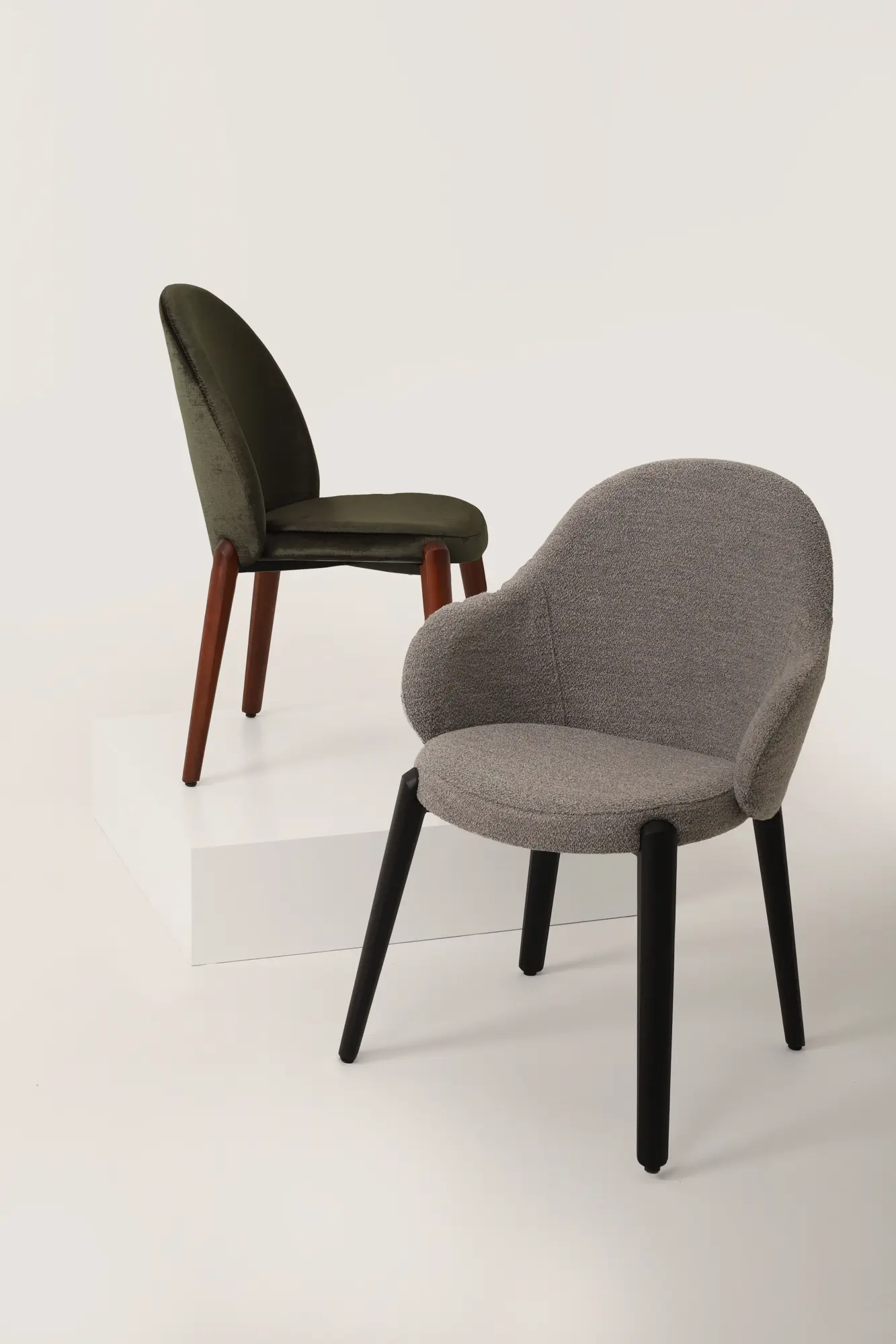 Der Cleo Sessel, exklusiv von Studio Formstelle für May Design entworfen, vereint höchste Qualität mit zeitloser Eleganz. Der Sessel zeichnet sich durch weich geschwungene, organische Formen und abgerundete Armlehnen aus, die Komfort und Raffinesse verbinden. Die gepolsterten Sitze aus langlebigem Schaumstoff lassen sich individuell beziehen. Charakteristisch sind die leicht überstehenden Stuhlbeine aus massiver Esche in Natur, Walnuss, Wenge oder Schwarz. Für zusätzliche Stabilität sorgt eine Stahlkonstruktion, die dezent im Vollholzdesign integriert ist.