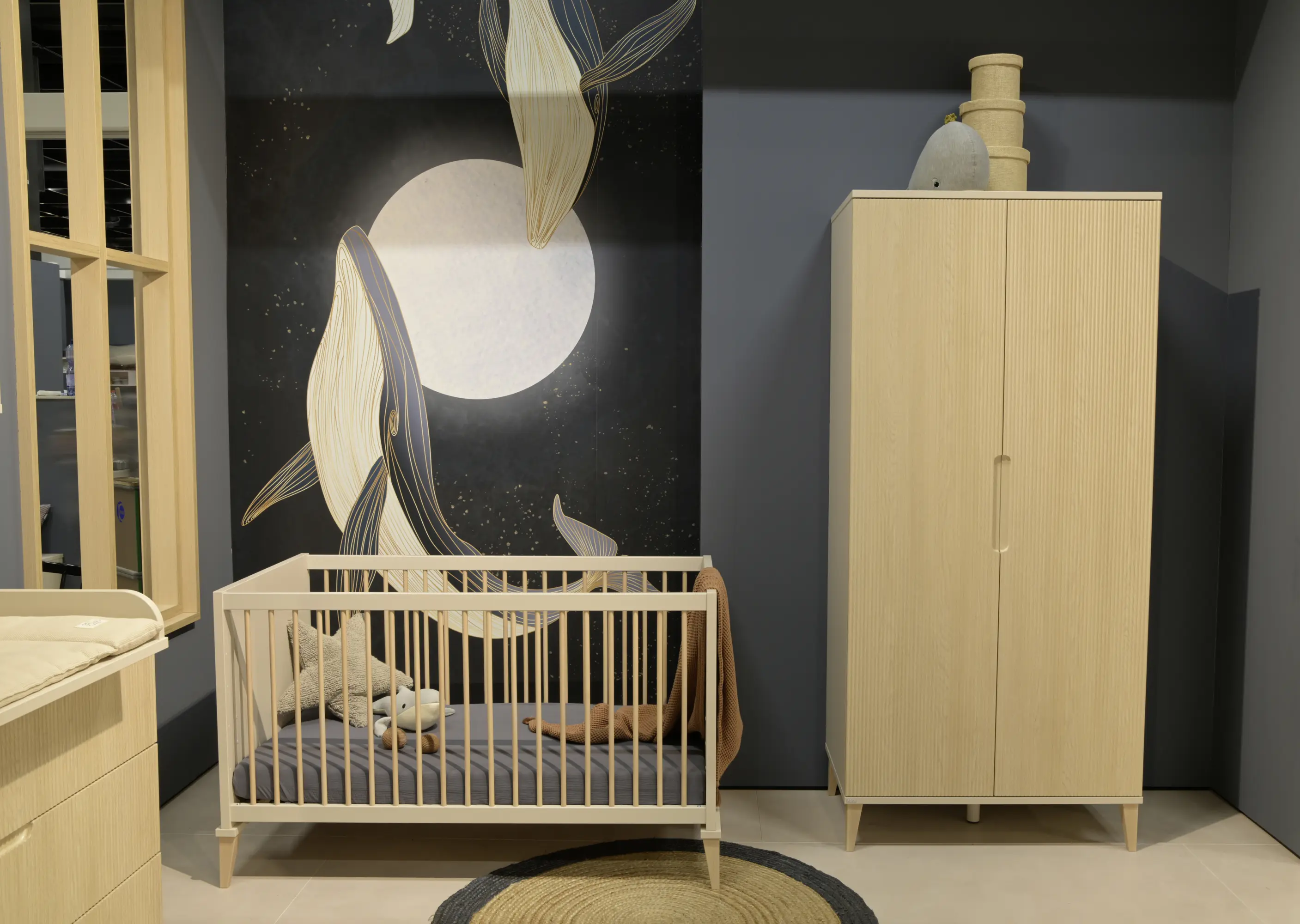 Babyzimmer Jonte gibt Kindern ab der ersten Nacht Geborgenheit. Alle Möbel sind so designt, dass Kinder sich frei entfalten können. Das umbaubare Babybett macht viele Entwicklungsphasen mit – als sicheres Juniorbett und später als Kindersofa. Kleiderschrank Tiny fördert Autonomie, weil Kinder sich ihr Outfit selbst aussuchen können. Kurzum: Jontes Möbel sind wandelbar und langlebig. Die dreidimensional gearbeiteten Fronten mit eingelassenen Griffen sind mit weichen, kindersicheren Radien gefertigt und spielen mit Licht und Reflexion. Der Japandi-Style in warmem Cashmere-Beige und heller Eiche sorgt für Ruhe und Gemütlichkeit.