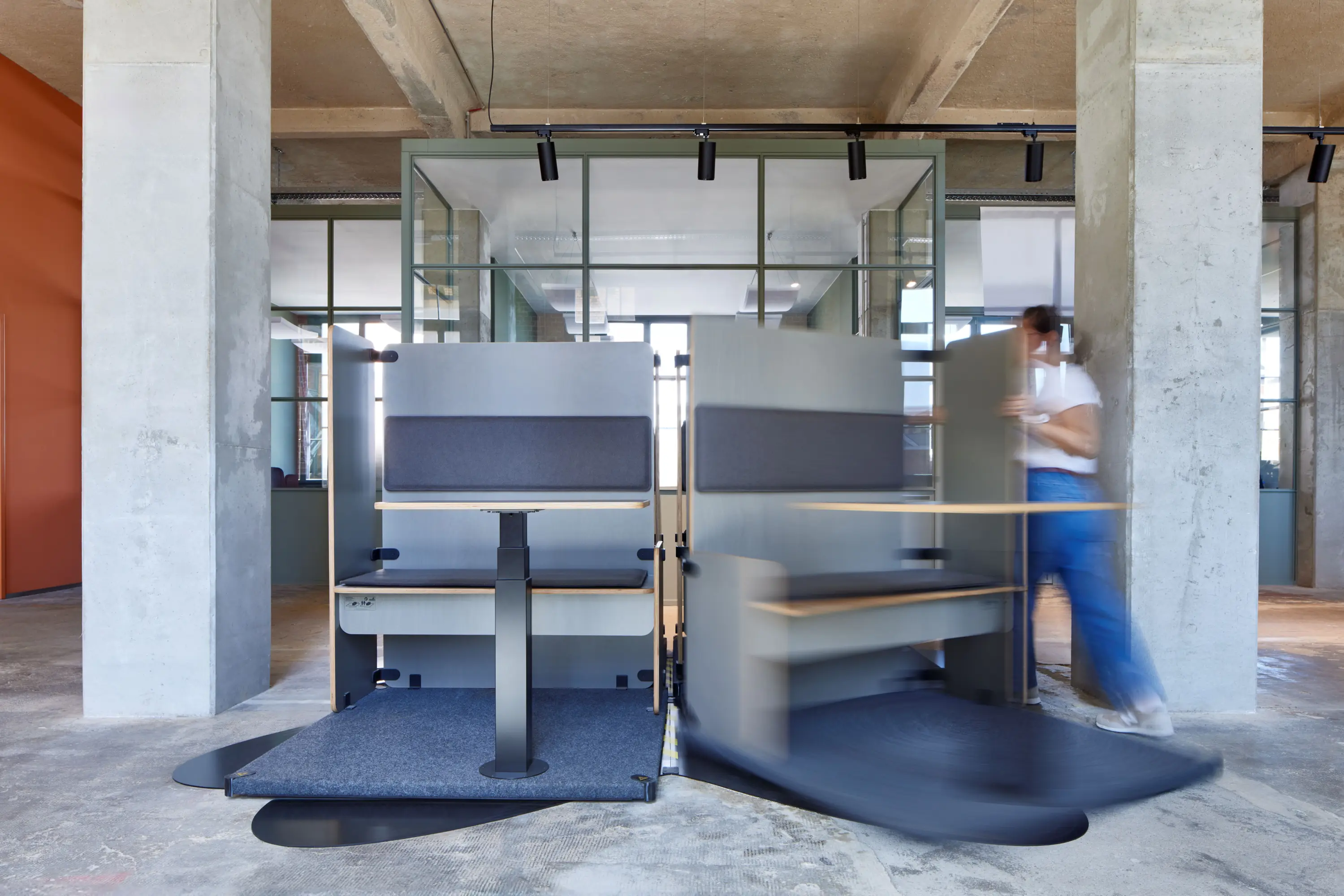 Mit Hettich RoomSpin lassen sich Büroräume im Handumdrehen verwandeln. Diese Flexibilität schafft Freiräume für mehr Kreativität und Produktivität und steigert die Flächeneffizienz. Die Möblierung wird durch eine einzigartige Dreh-Schwenkbewegung neu angeordnet und flexibel an die Arbeitssituation angepasst. Das choreographierte Drehen der stationären Einrichtung und Arbeitsplätze sorgt im Gegensatz zu mobilen Office-Möbeln für klare Zonierungen im Büro und eine gute Planbarkeit von Raumwirkung, Beleuchtung und Anschlüssen. Dank Ausnutzung von Hebelkräften ist das Drehen viel komfortabler als das Bewegen von verfahrbaren Möbeln auf Rollen.